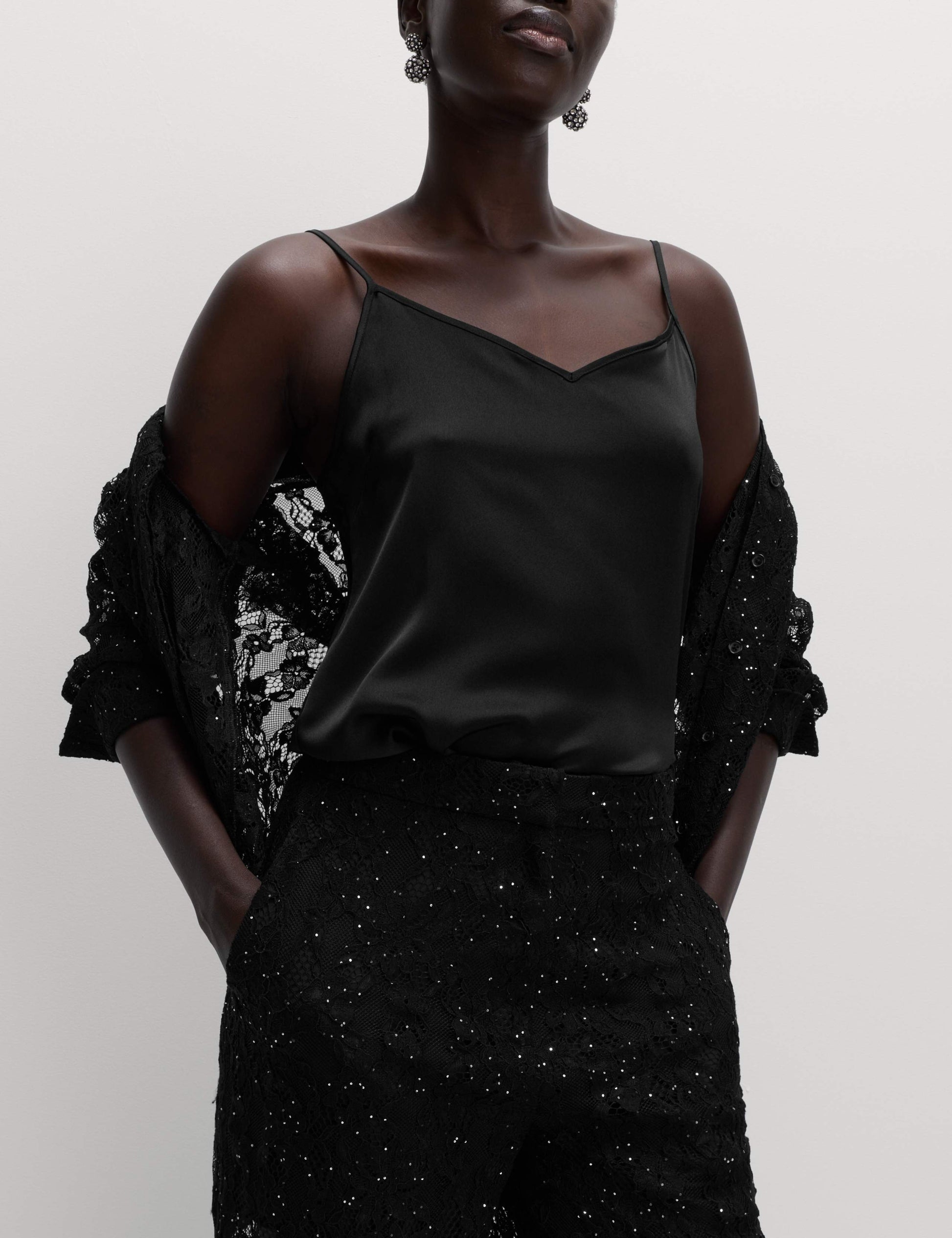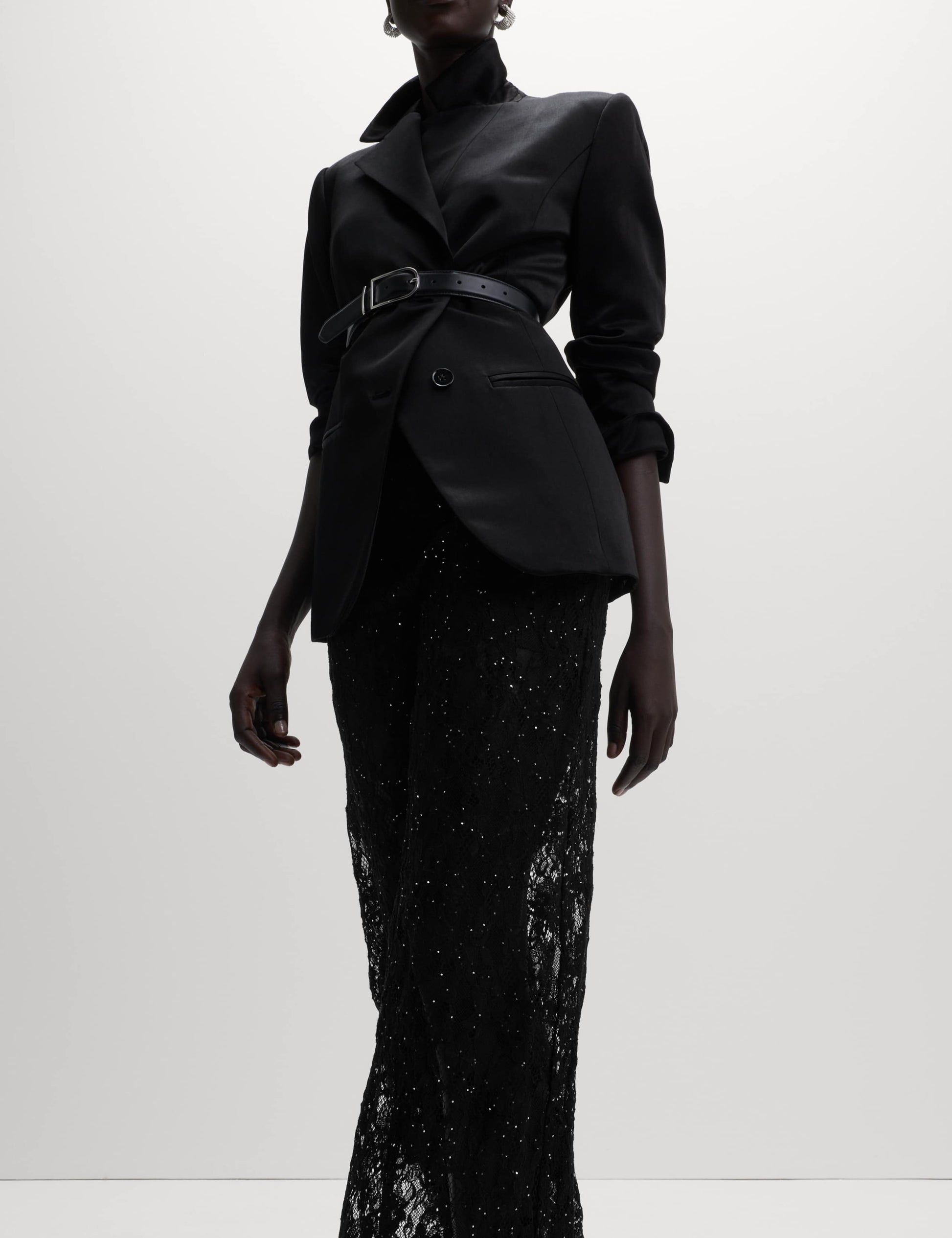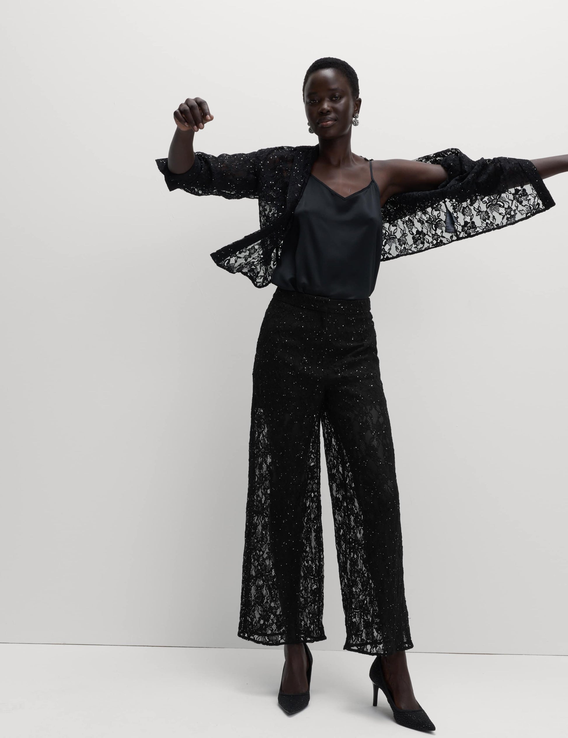 Sheer lace sprinkled with sparkly diamante brings a standout look to these party-ready trousers. They're cut in a regular fit, with a wide leg shape for a modern silhouette. The high waistline creates a flattering shape, while the added stretch ensures comfort. A concealed zip fastening and side pockets complete the statement design.