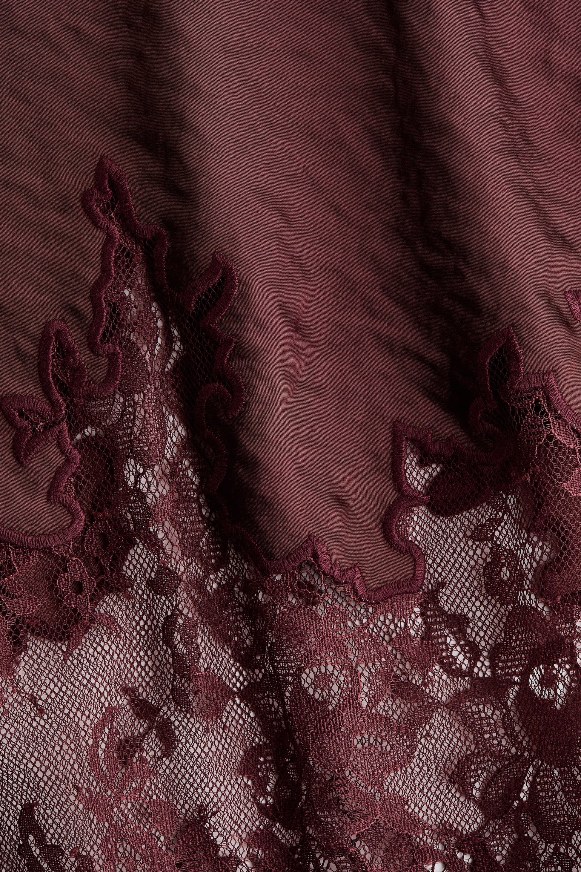 Calf-length, fitted skirt in softly draping satin featuring a high waist with concealed elastication and a wide, scalloped lace trim at the hem. Unlined.