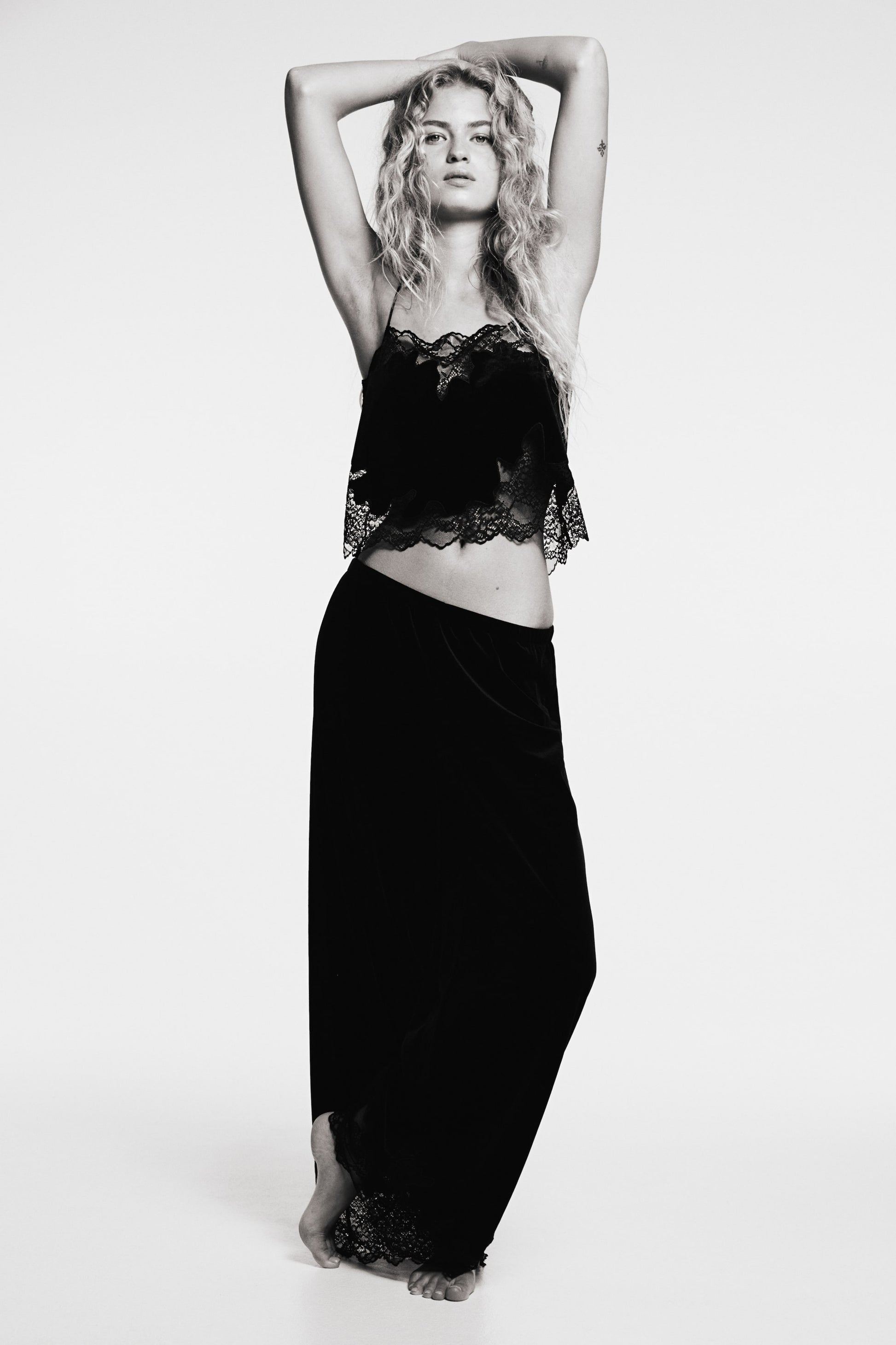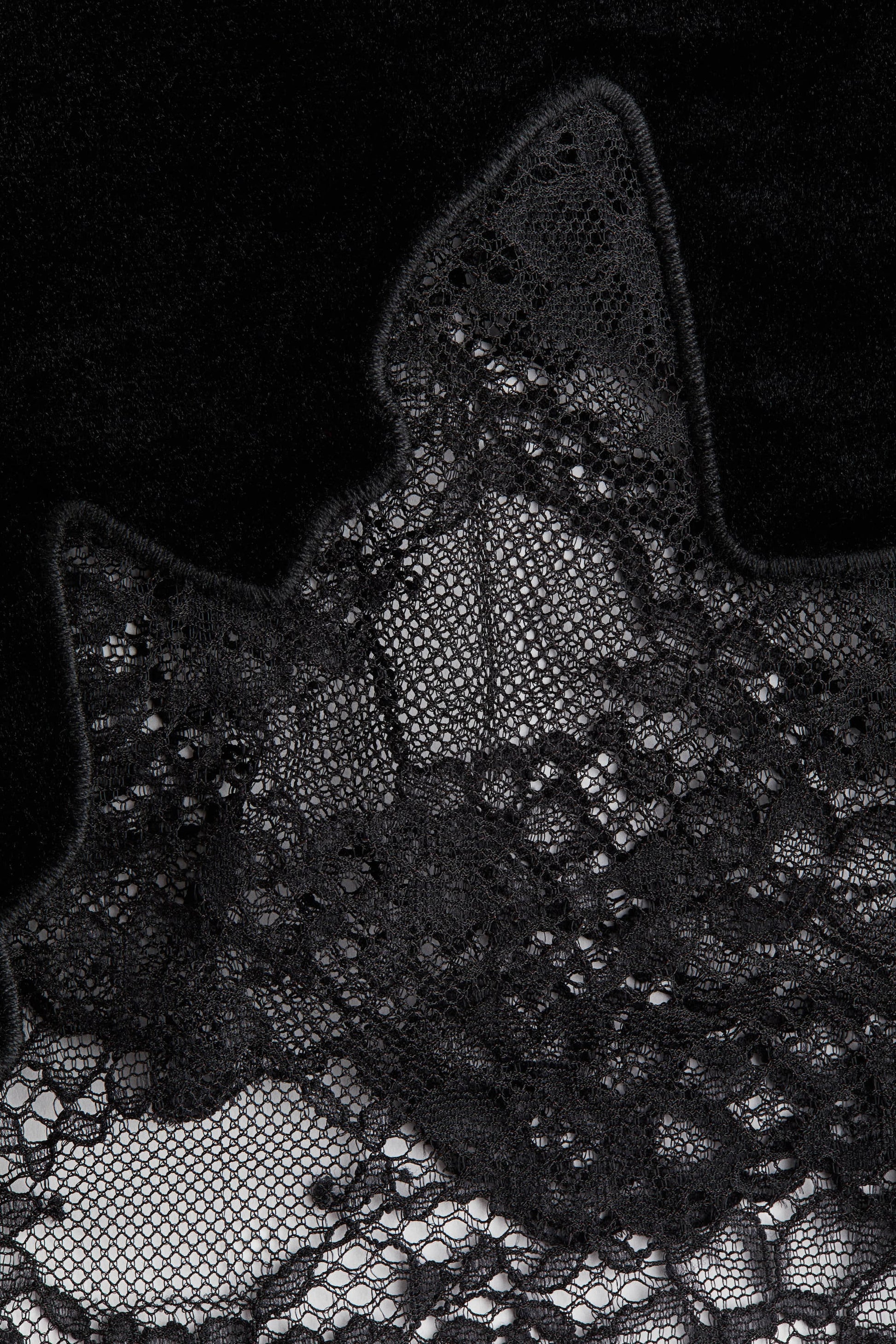 Short top in soft velour with scalloped lace insets and spaghetti shoulder straps.