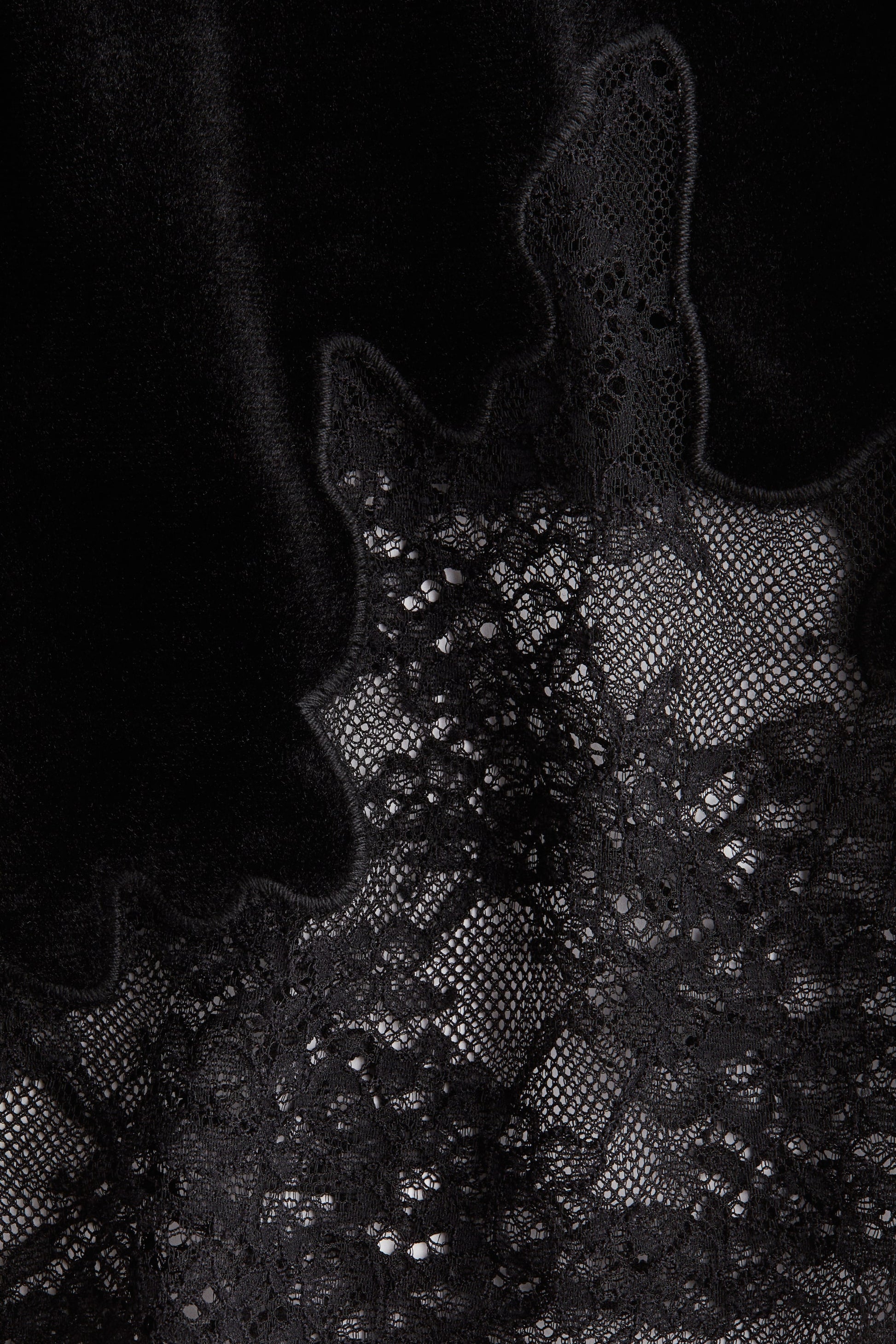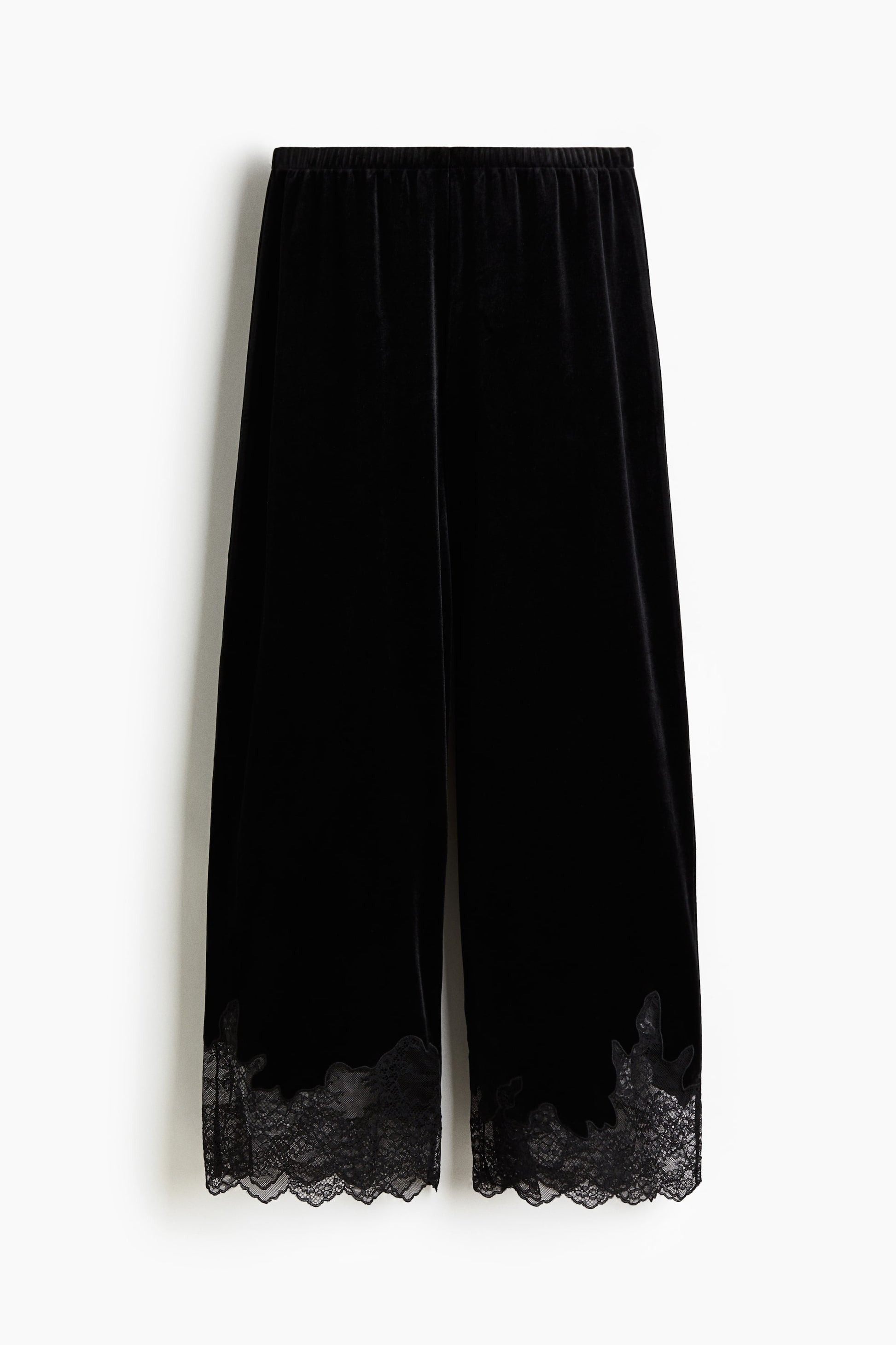 Trousers in soft velour with covered elastication at the waist and wide legs with a scalloped lace inset at the hems.