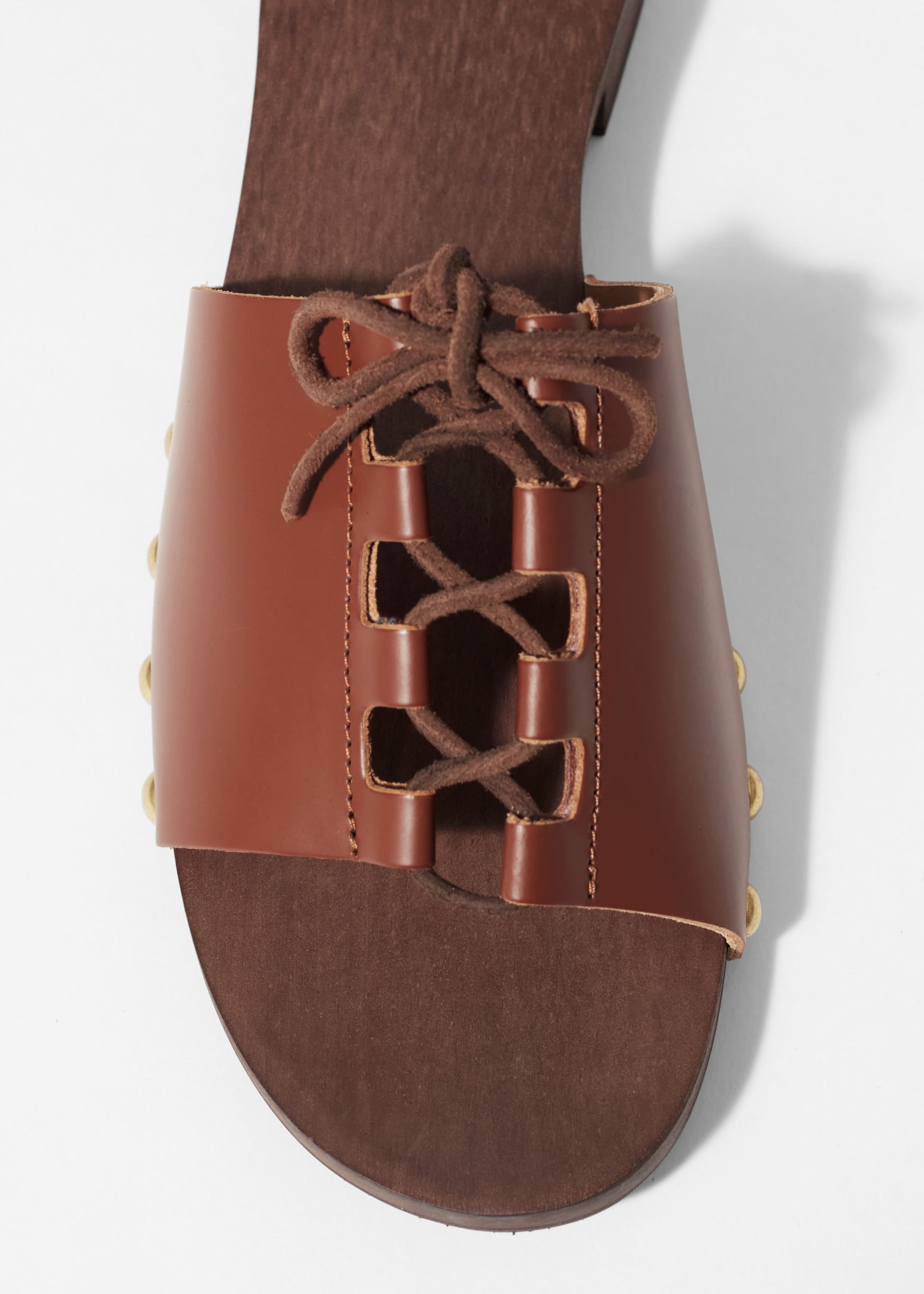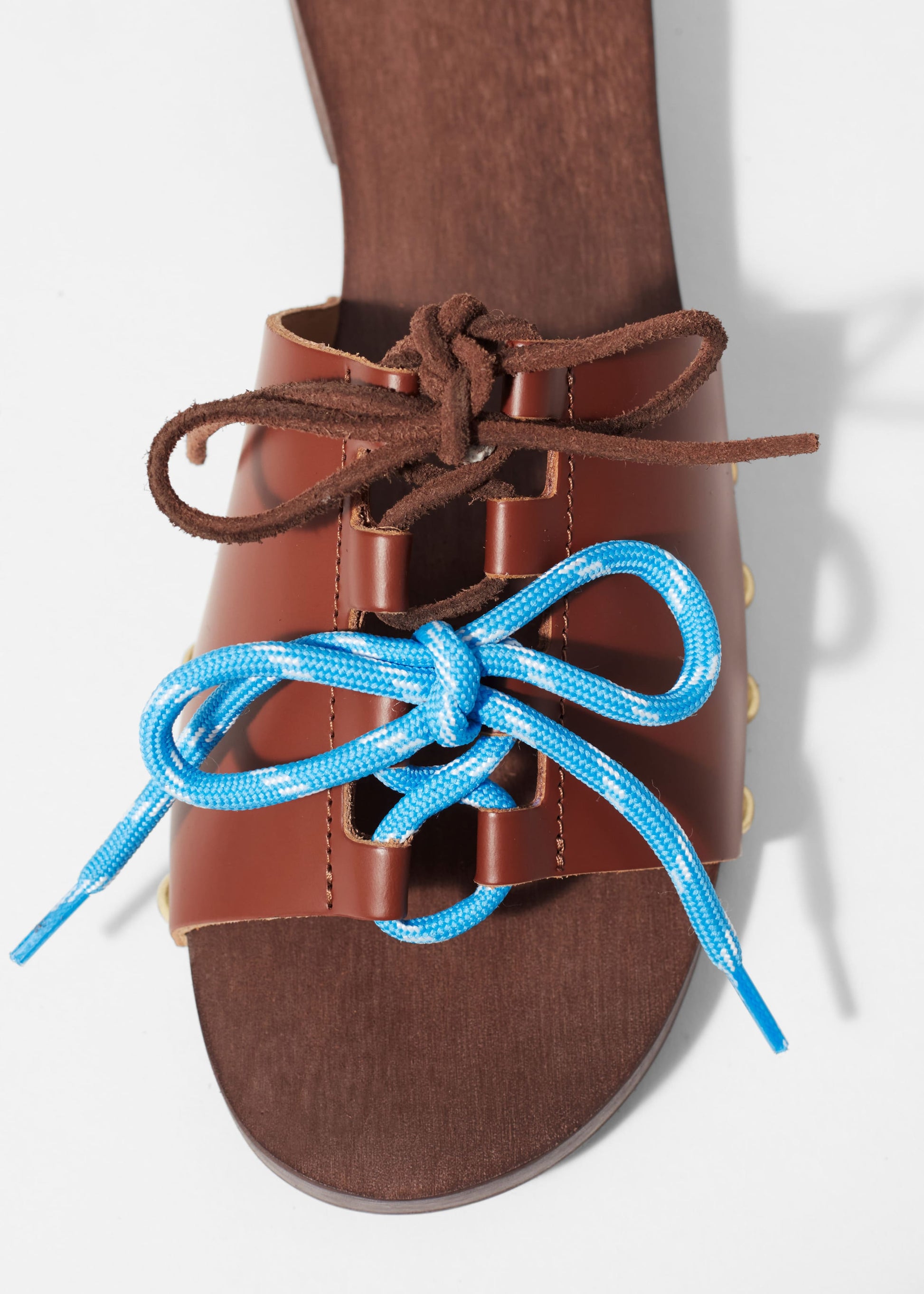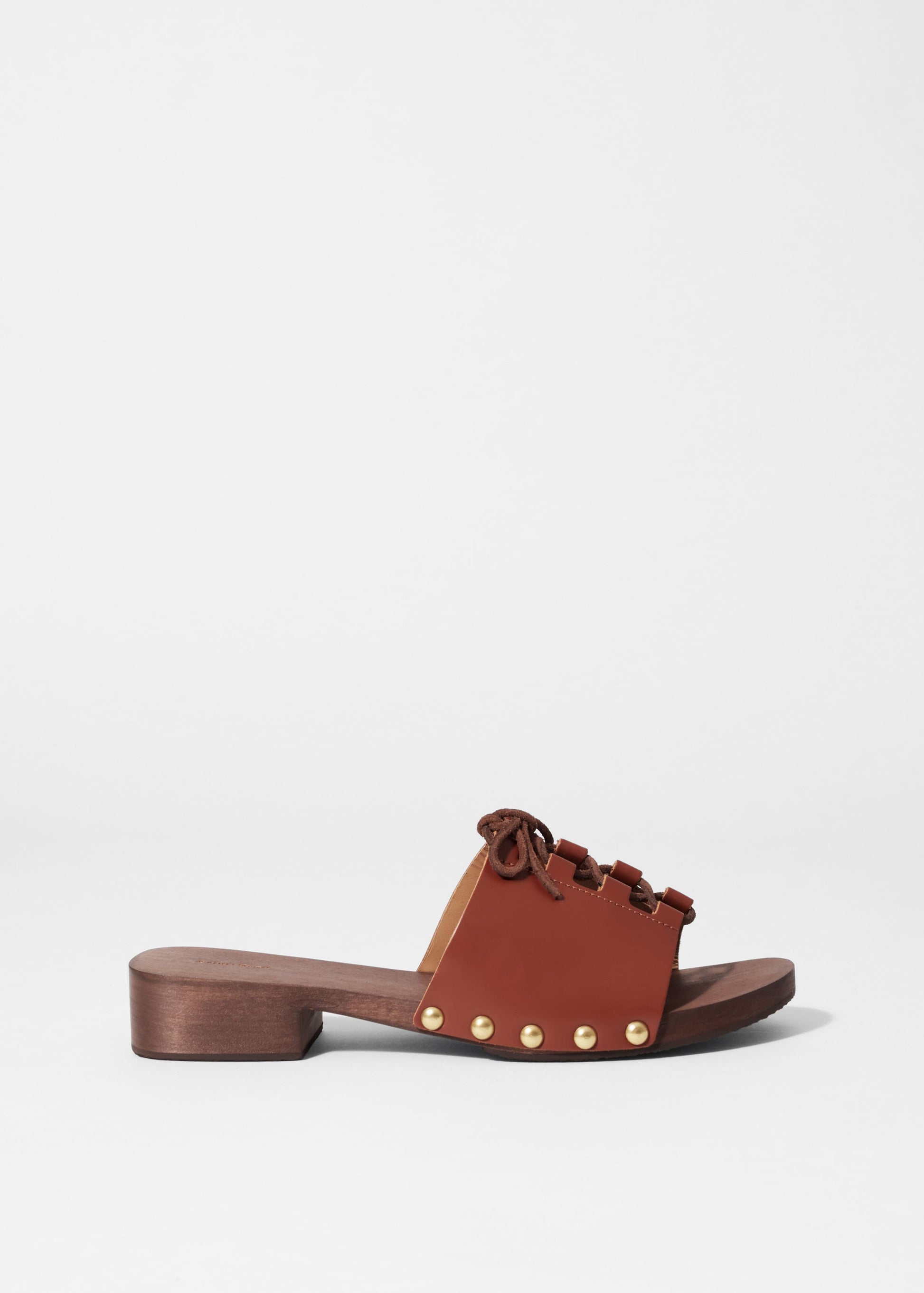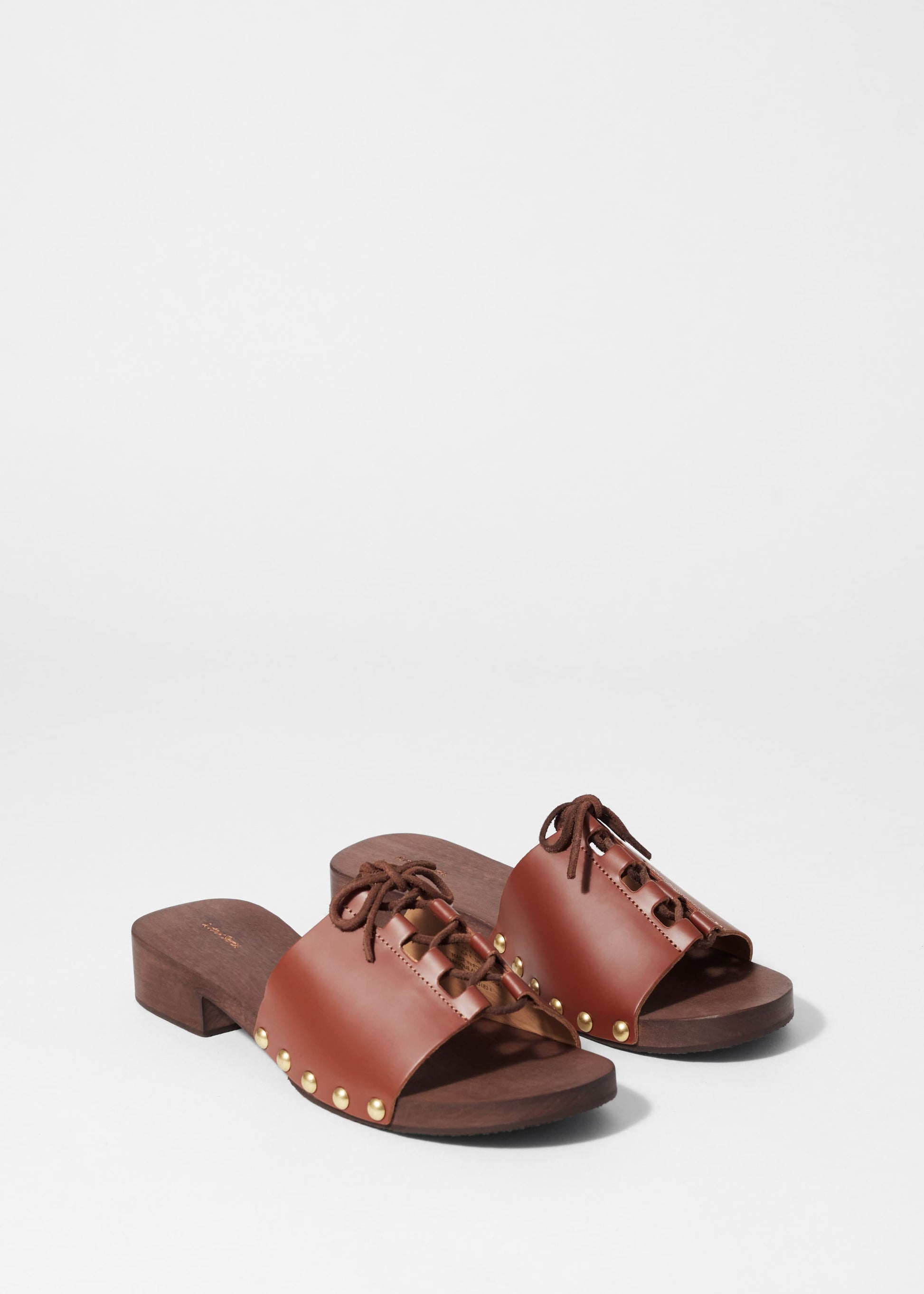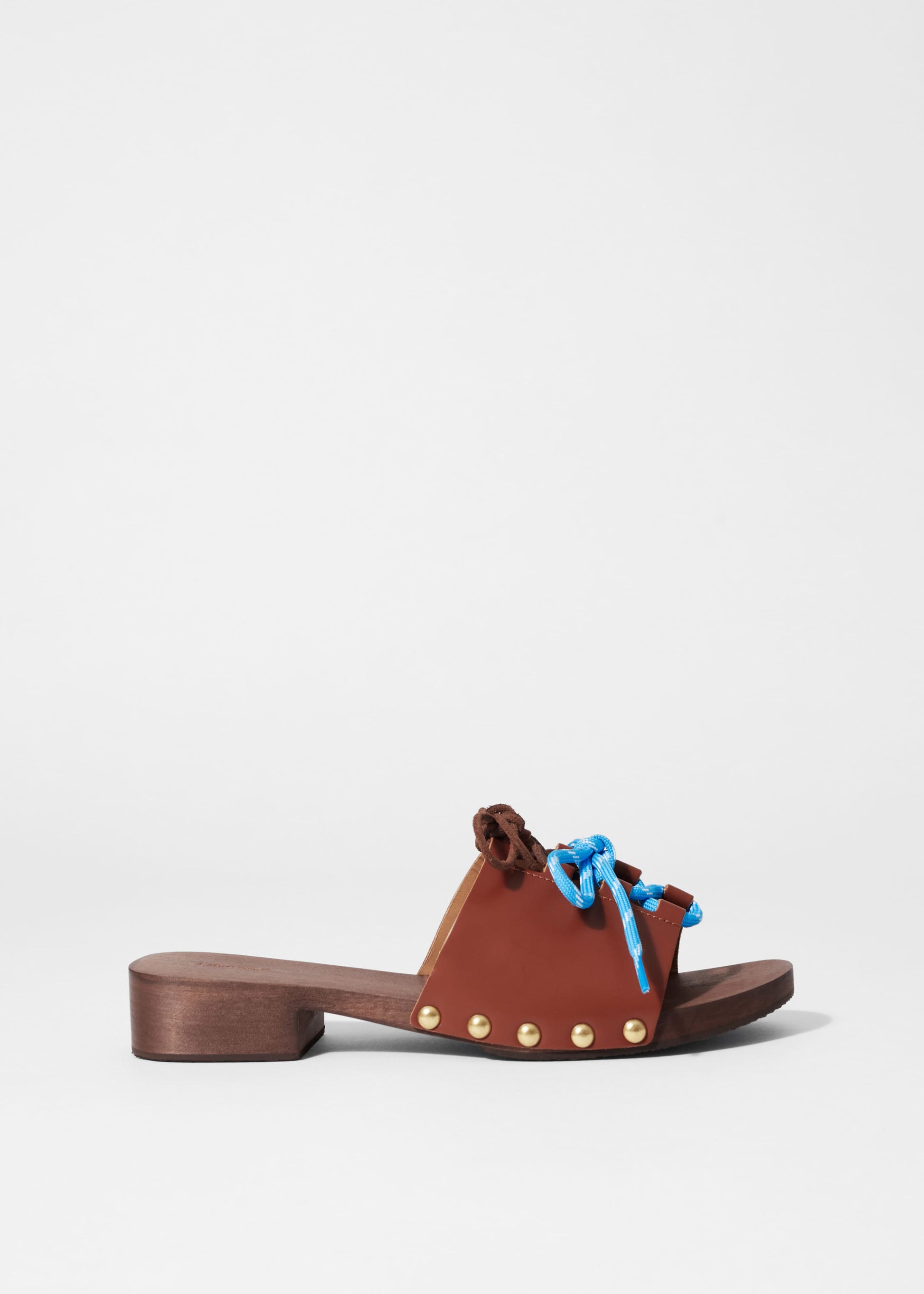 Crafted in Portugal with supple nappa uppers and wooden soles, these clog sandals feature almond toes, studs at the sides, and suede laces for an eye-catching statement detail. The laces can be swapped or paired with additional ones to create an eclectic, personalized look.