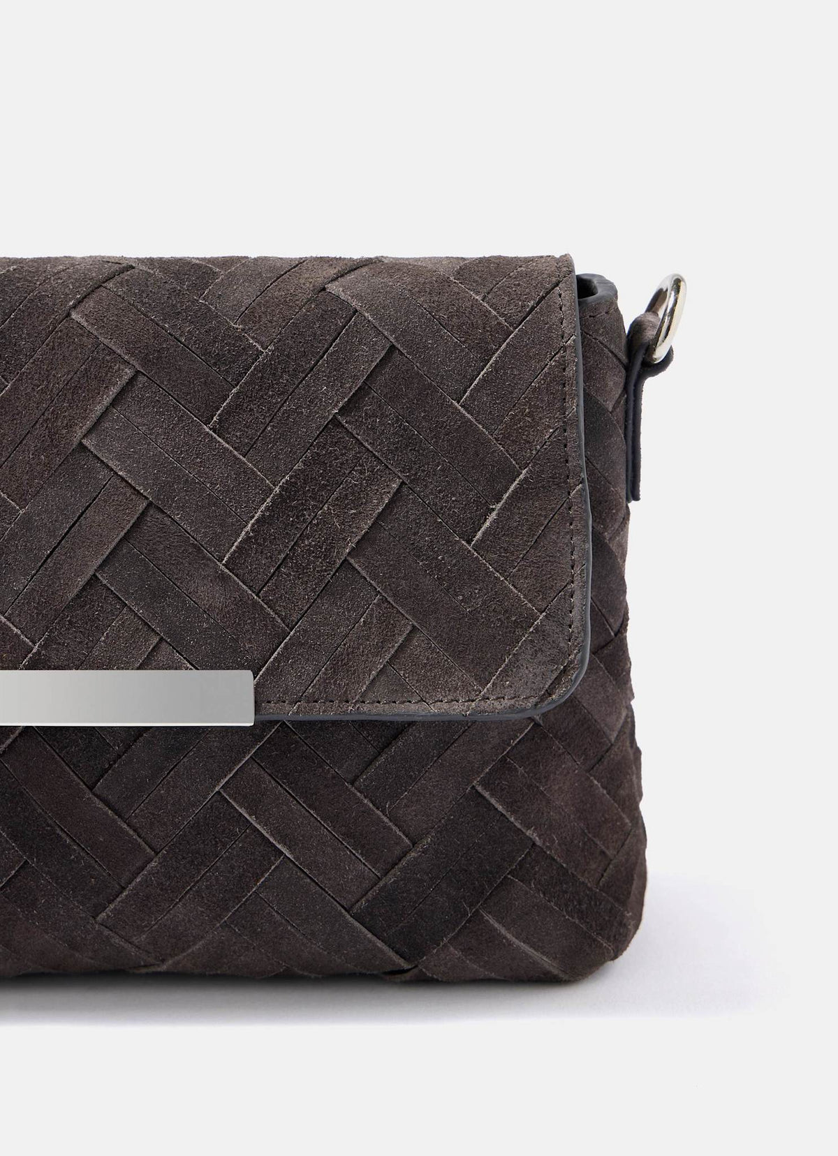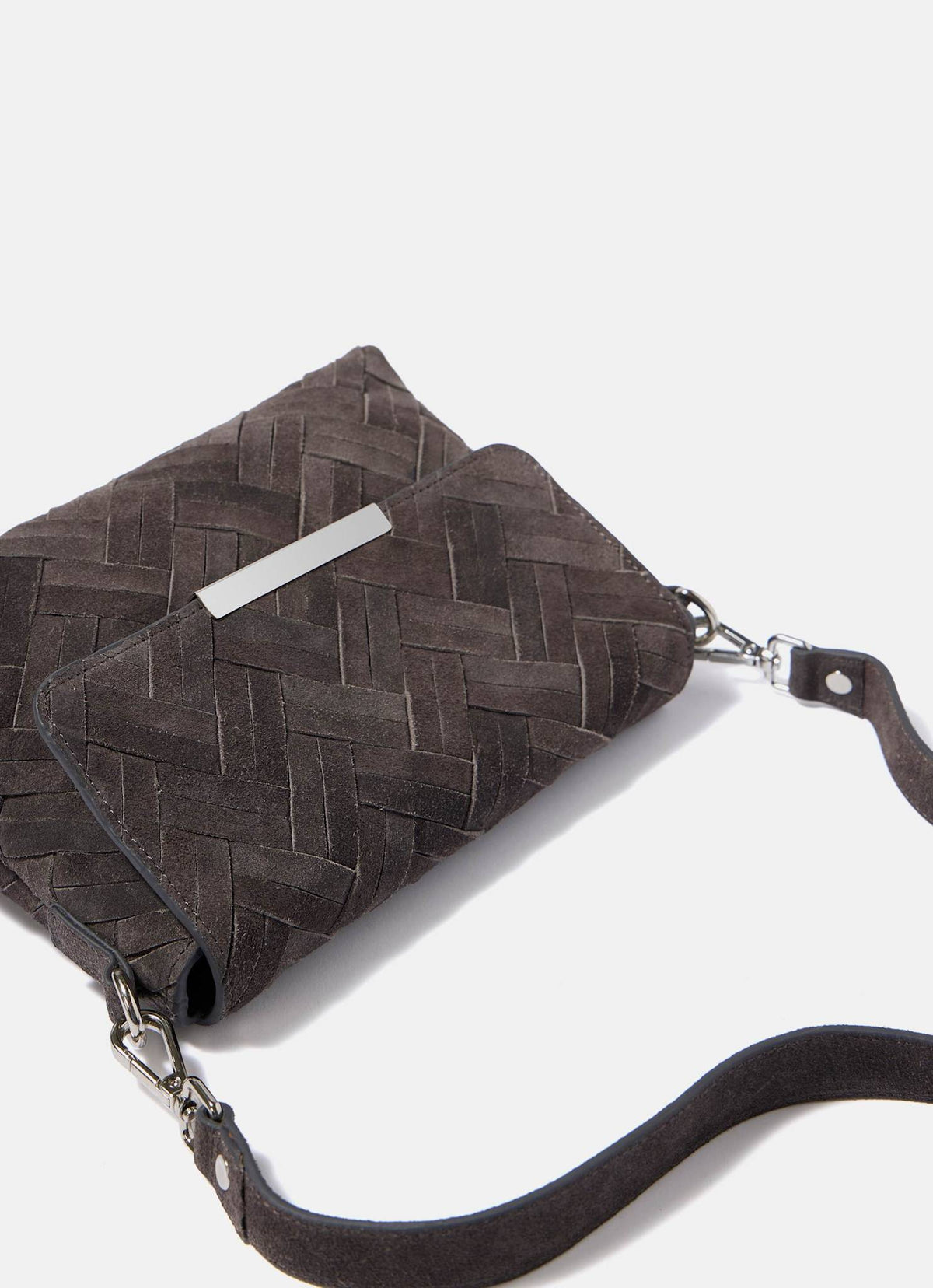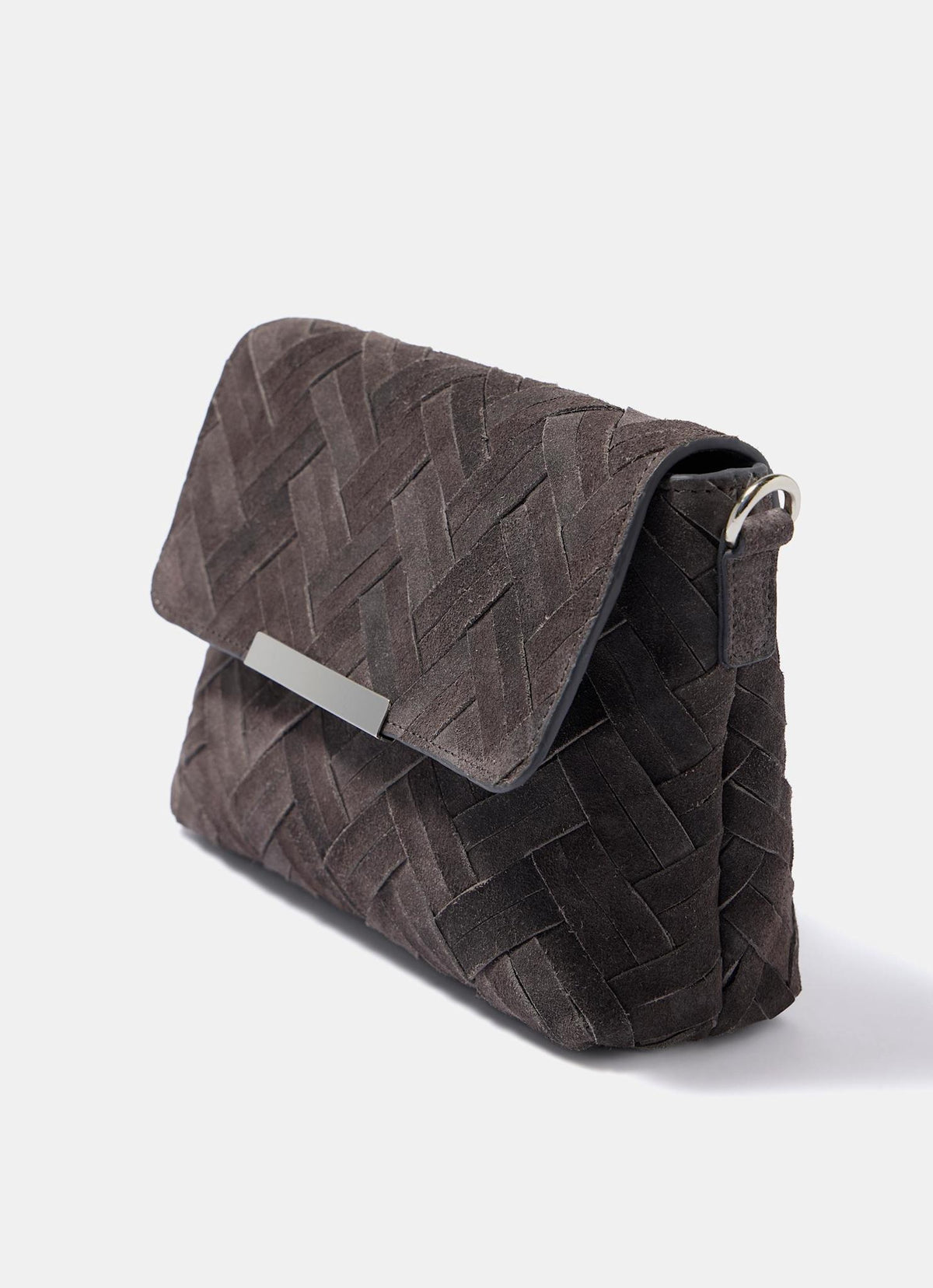 - Grey suede woven rectangular bag featuring a detachable shoulder strap, silver-tone hardware and fold over magnetic fastening.