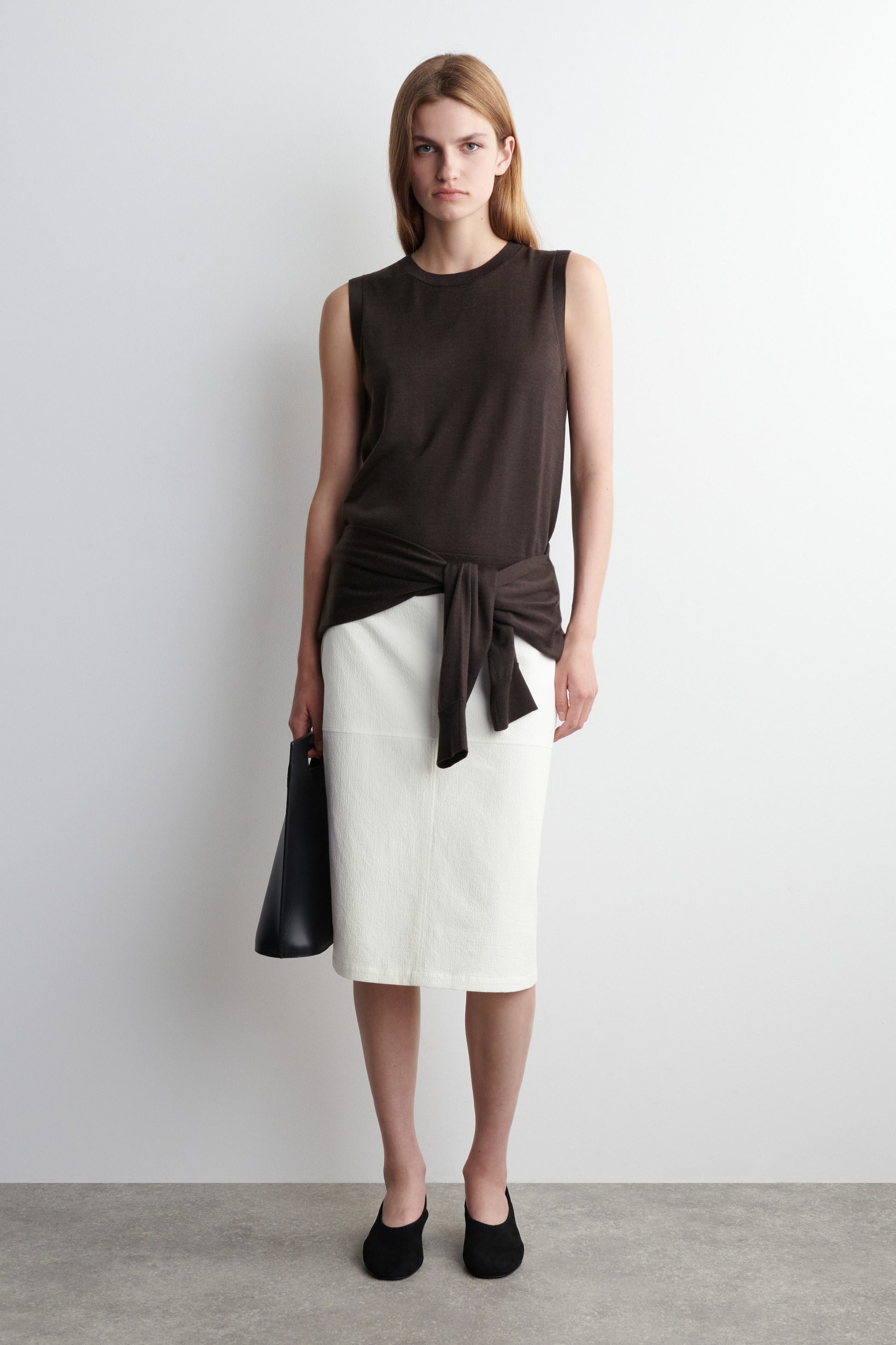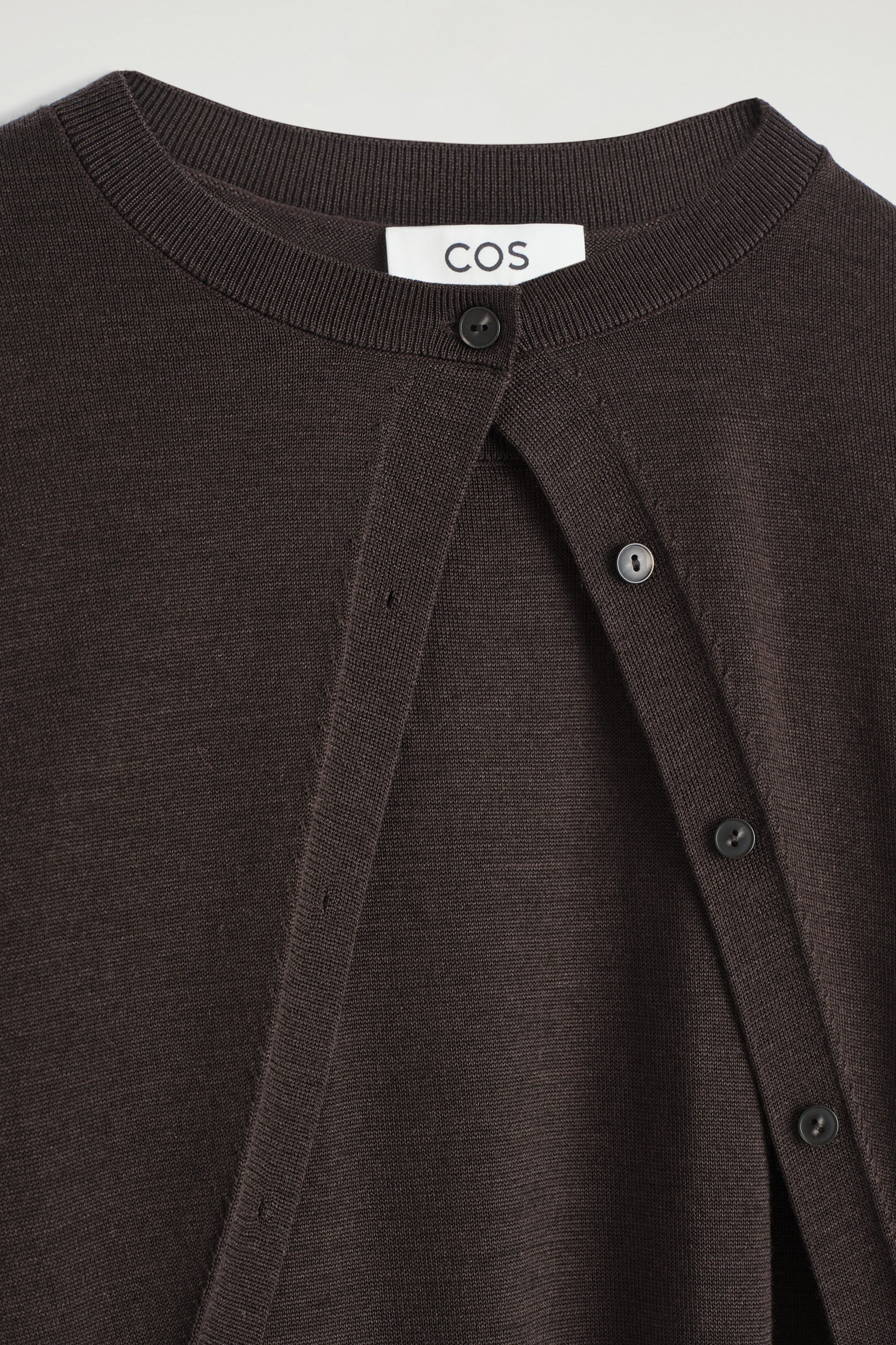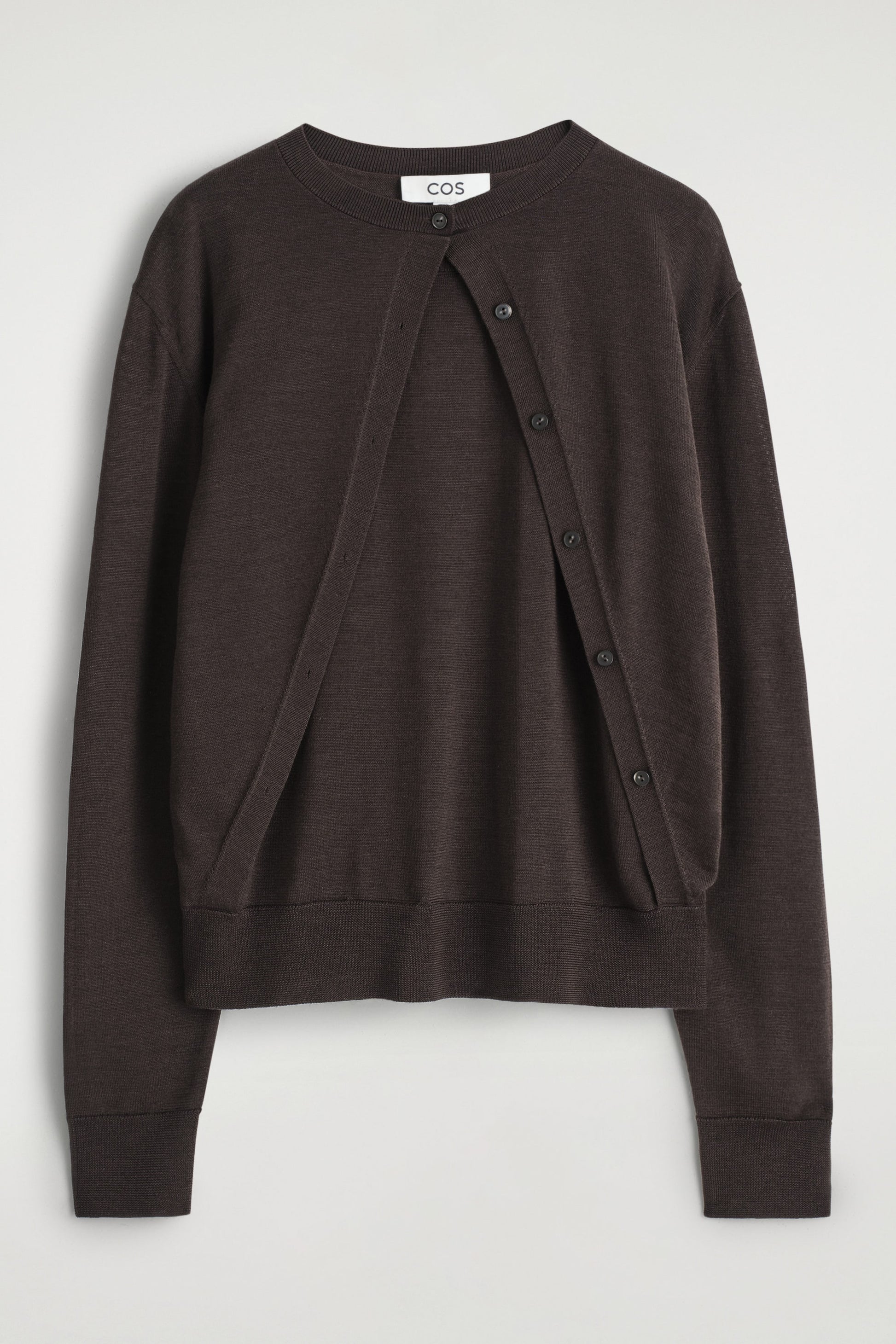 This understated piece marries the design of a cardigan and vest, creating a layered look in one silhouette. It's knitted from ultra-fine merino wool that's soft to the touch and finished with ribbed trims and a neat row of buttons. The deep espresso hue complements the rich tones of the season.