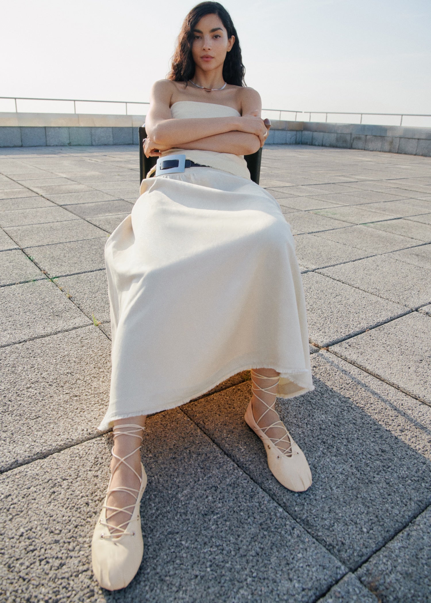 Sheep leather. Flat. Crossed strap design. Round toe. Tie closure at the ankle. Online Exclusive.