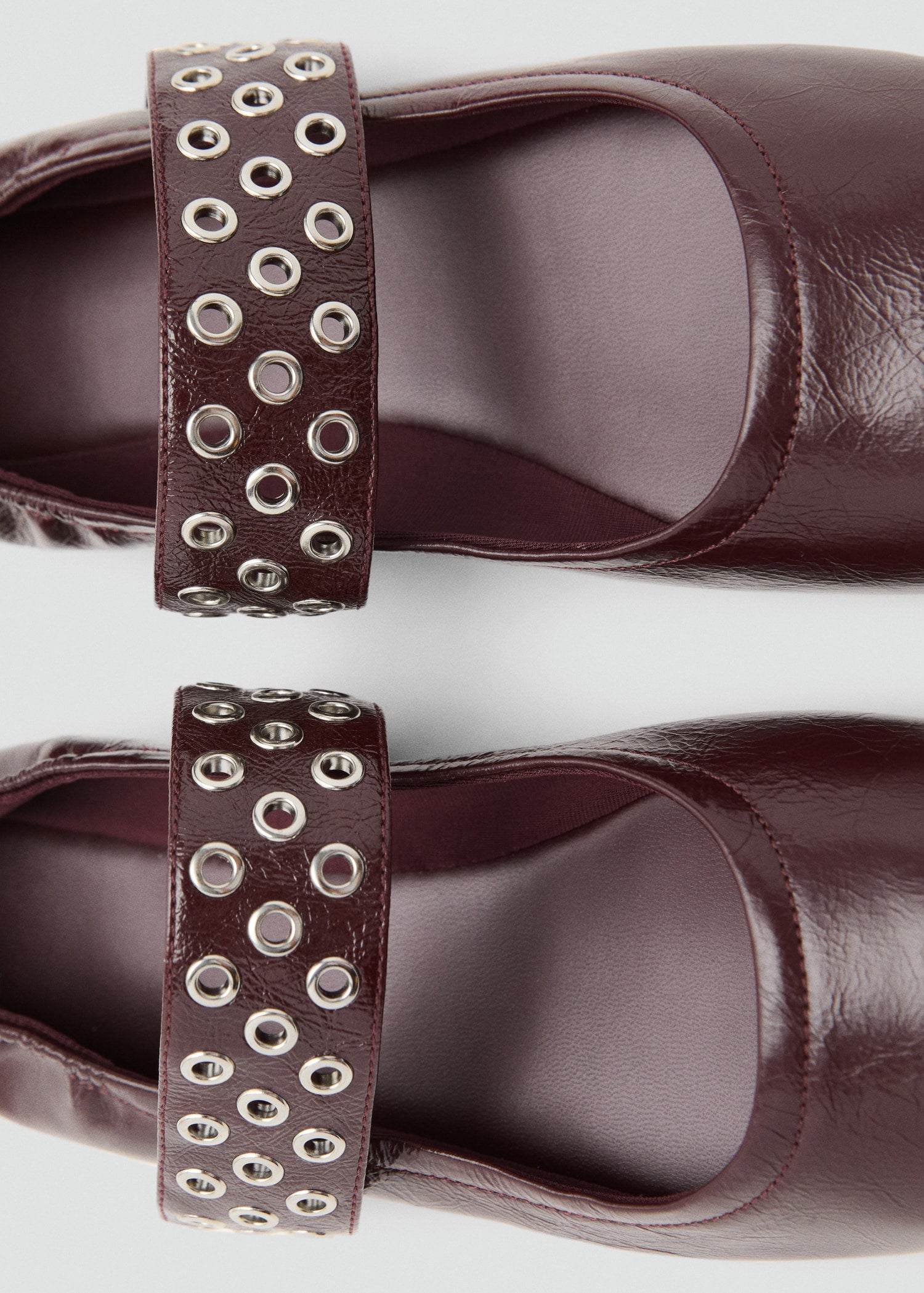 Bovine hide. Strip design. Flat. Round toe. Eyelets detail. No Fastening.