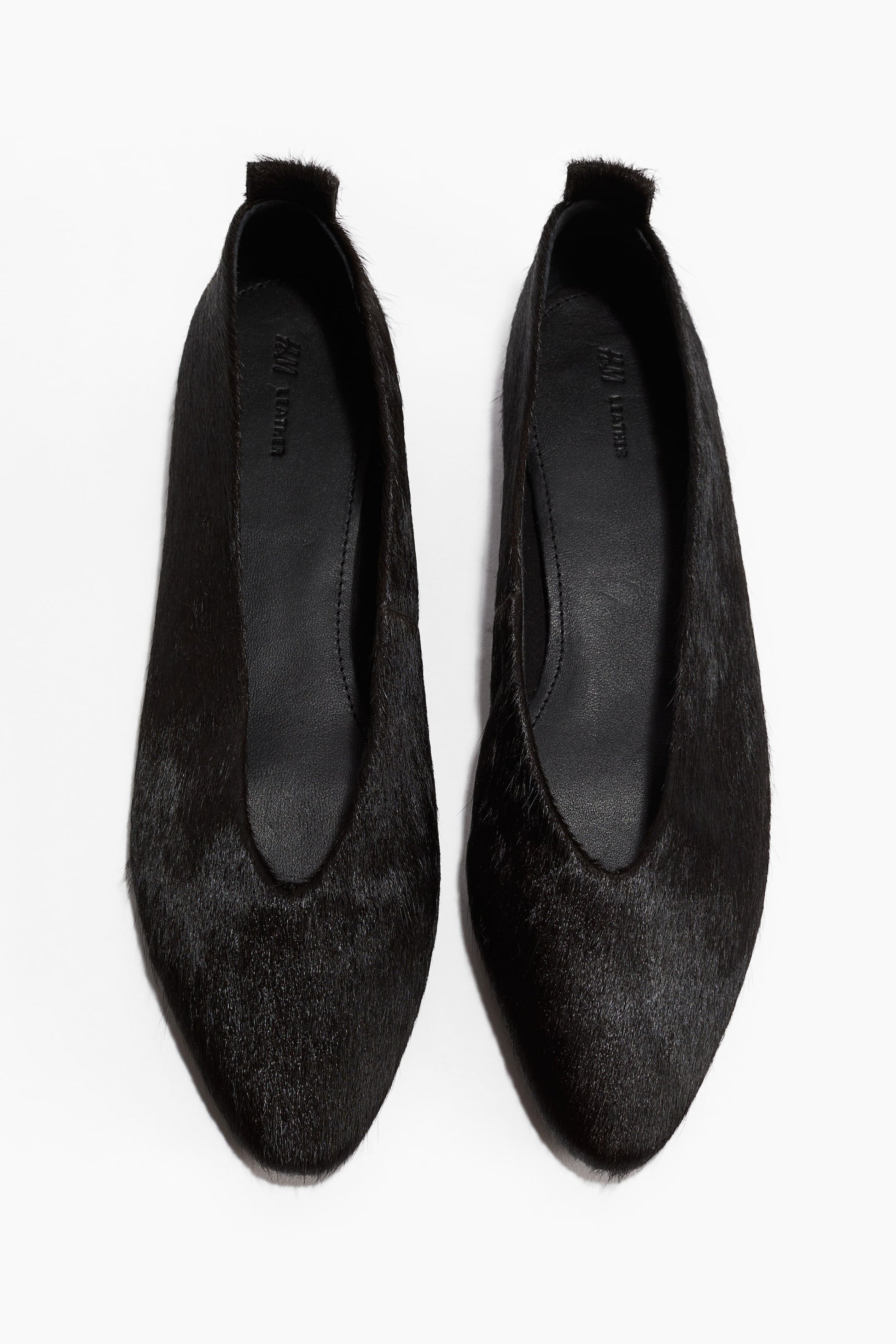 Ballet pumps crafted from leather with a fuzzy surface. Featuring a flattering V-shaped topline, almond toes and a loop at the back. Leather and canvas linings and leather insoles.