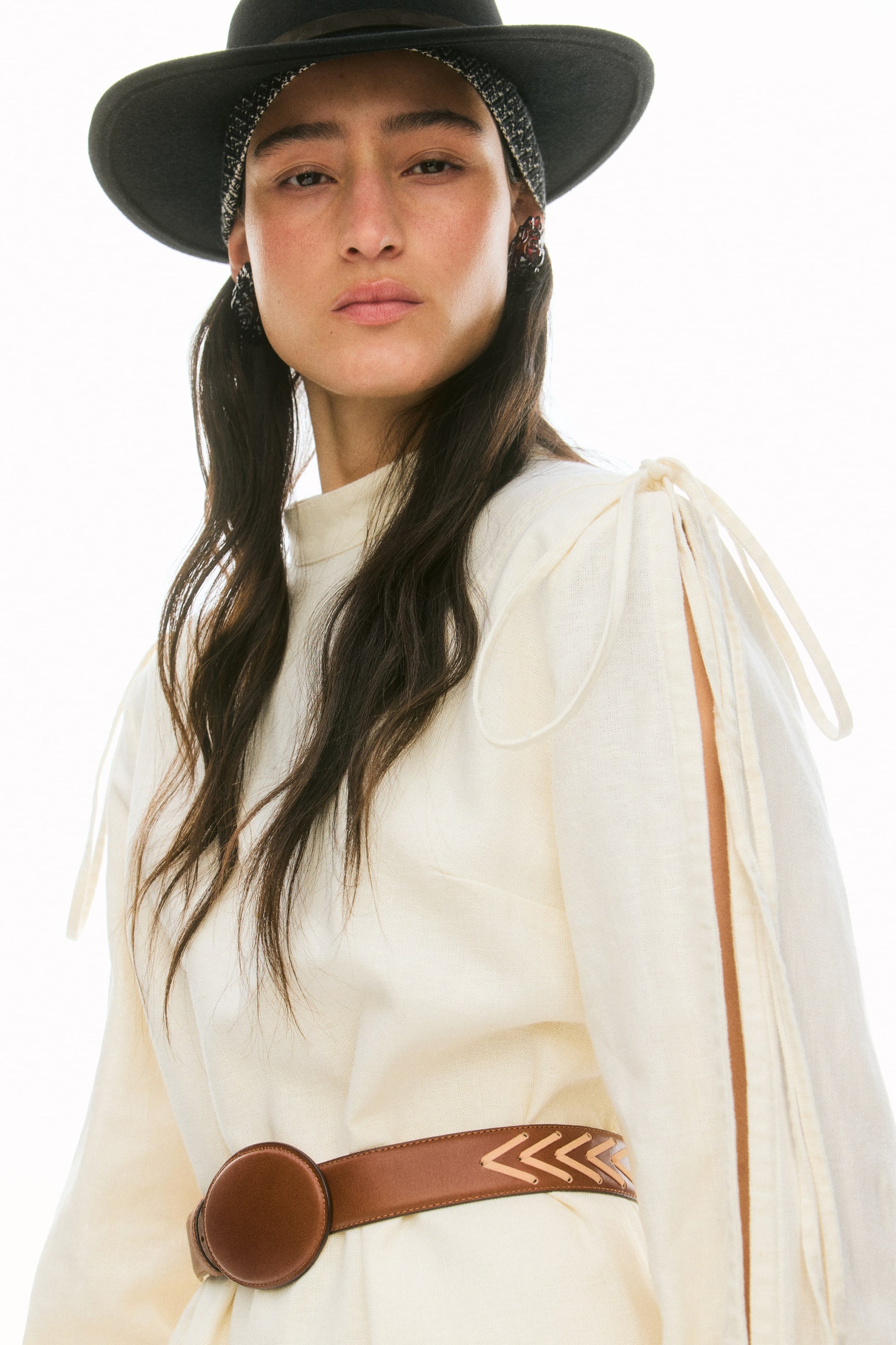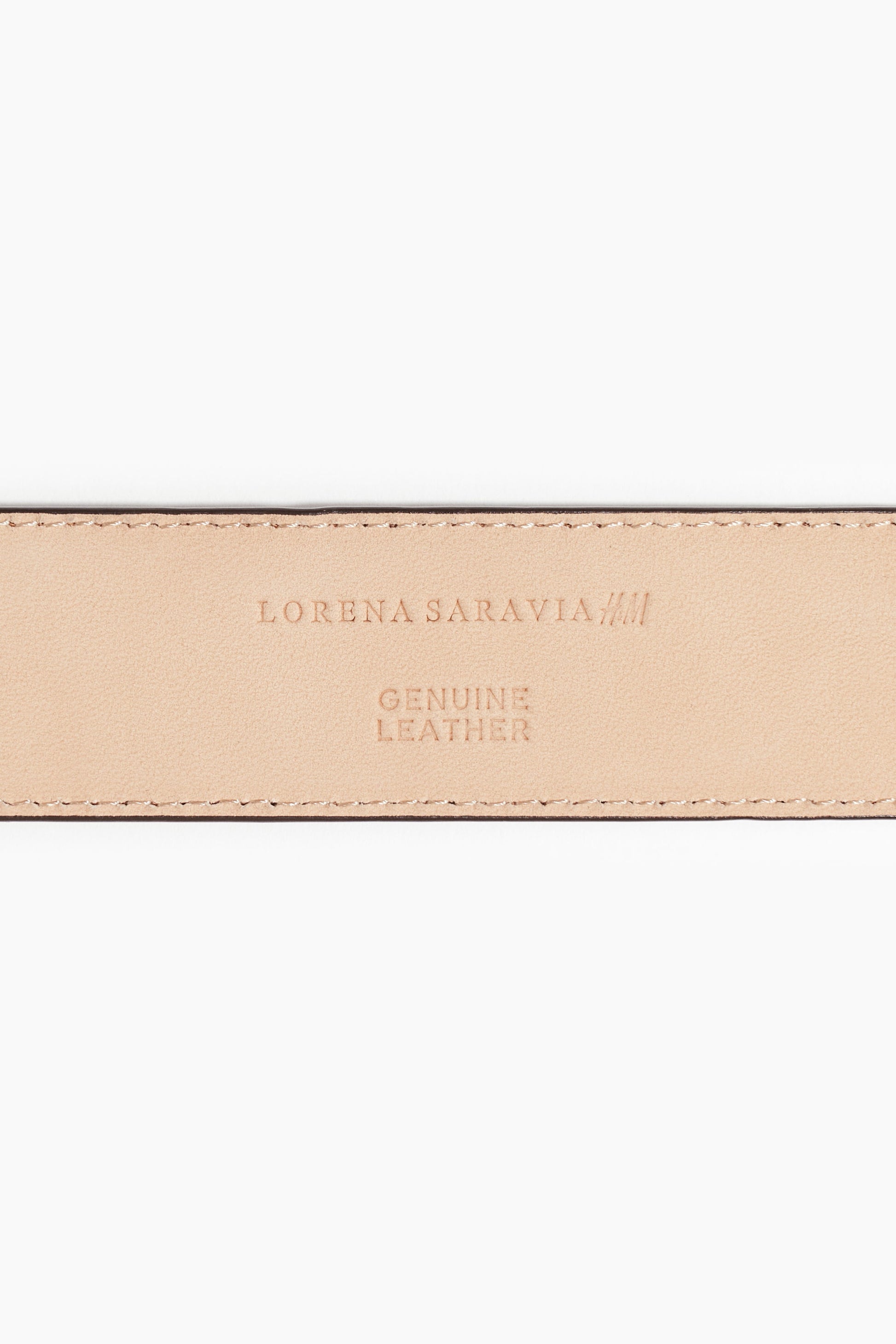 Leather belt detailed with a chevron pattern in accent-coloured nubuck cord. The design features an oval covered buckle with a post. Backing in nubuck.
