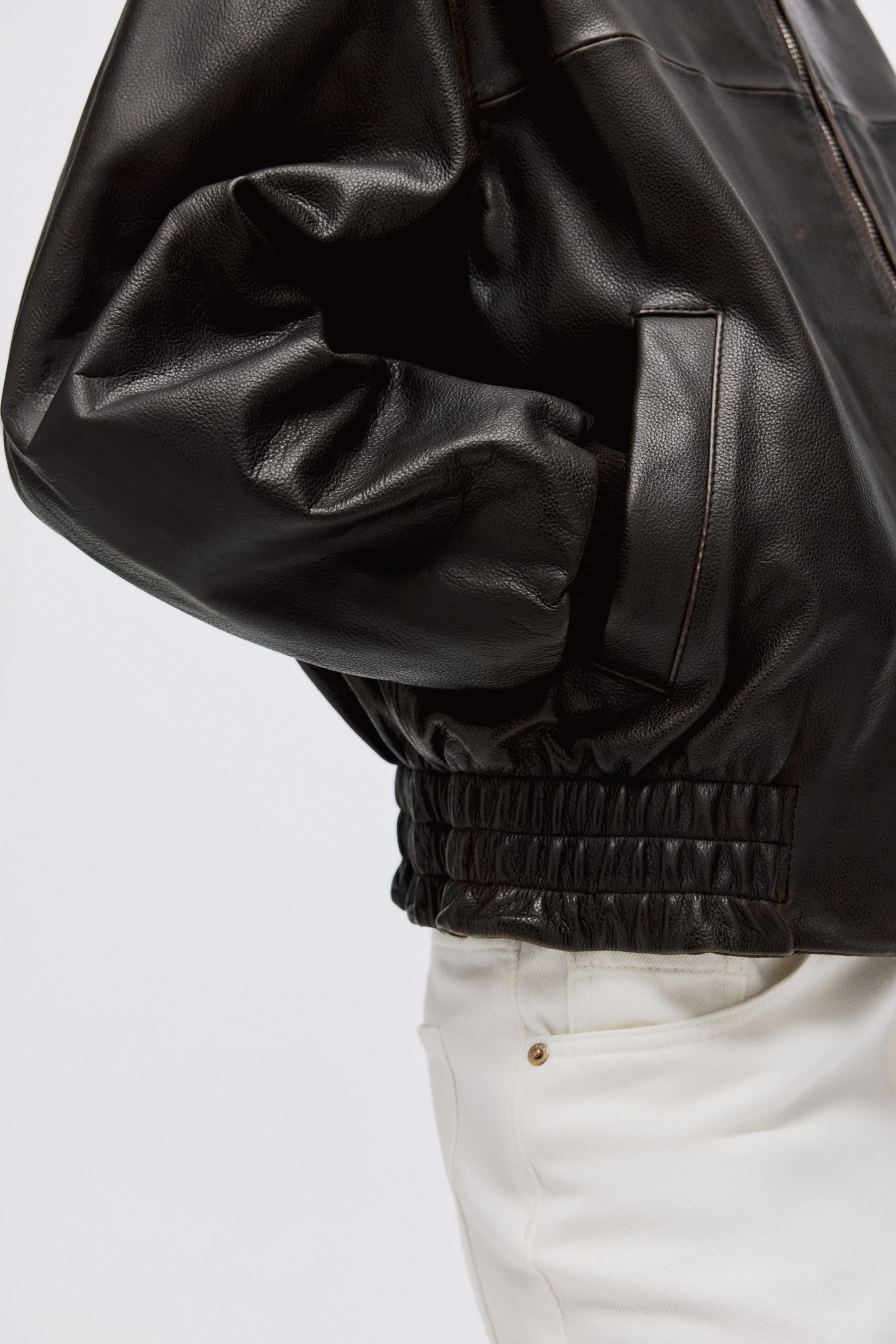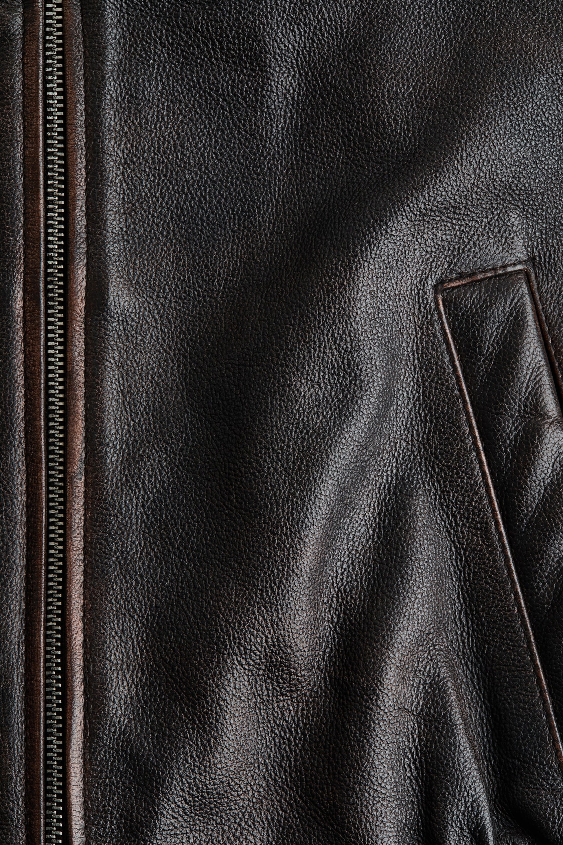 Oversized jacket in leather with a distressed look. Ribbed stand collar, zip down the front and welt side pockets. Ribbing at the cuffs and smocked elastication at the hem. Lined.