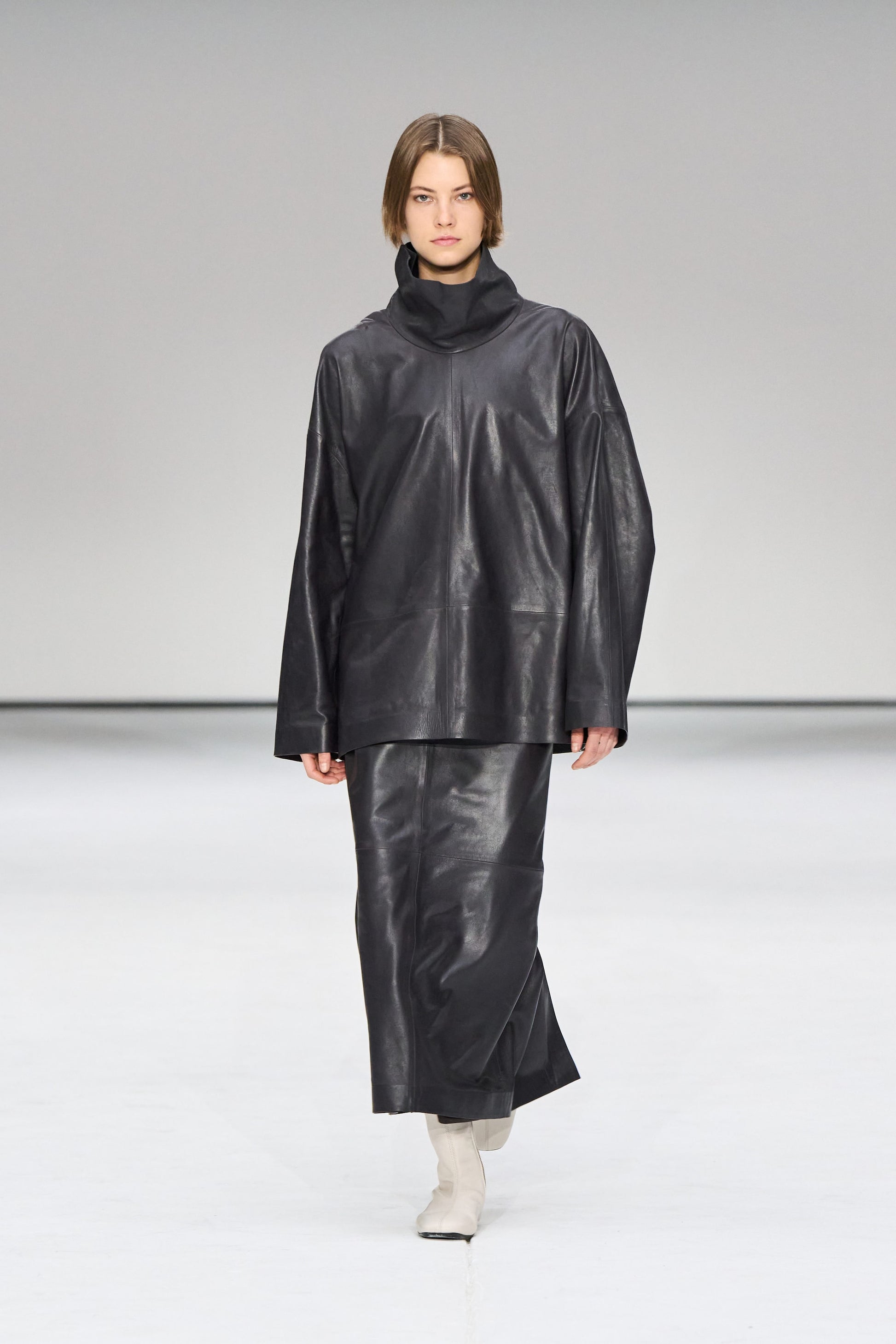 Autumn Winter 2025 takes the modern wardrobe to new heights: the epitome of quiet confidence. Reframing classics with contemporary appeal, this cocooning leather top is made from premium lambskin, selected for its exceptionally supple, butter-soft handle, and rendered in a rich espresso tone. The silver-tone press studs encourage thoughtful styling, while the raw-cut funnel neck is finished with bonded edges.