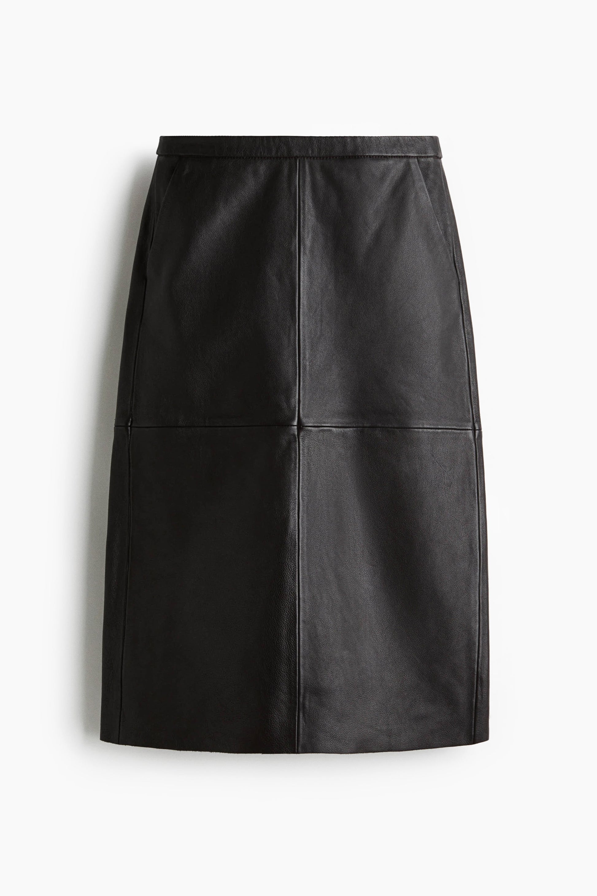 Calf-length skirt in soft leather with visible seams at the front and back. Regular waist with a concealed zip and hook-and-eye fastener at the back, side pockets and a straight-cut hem with a back slit. Viscose twill lining.
