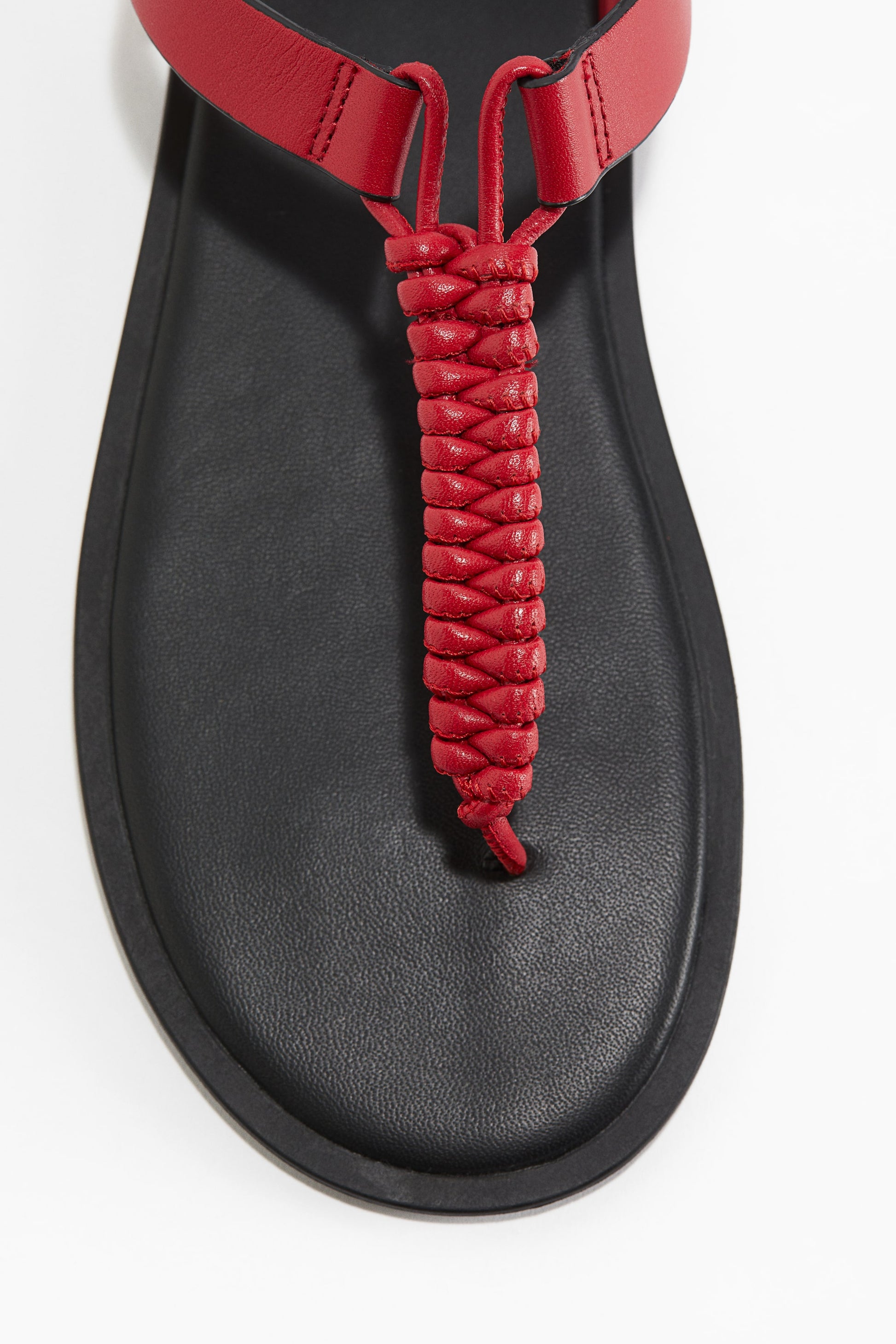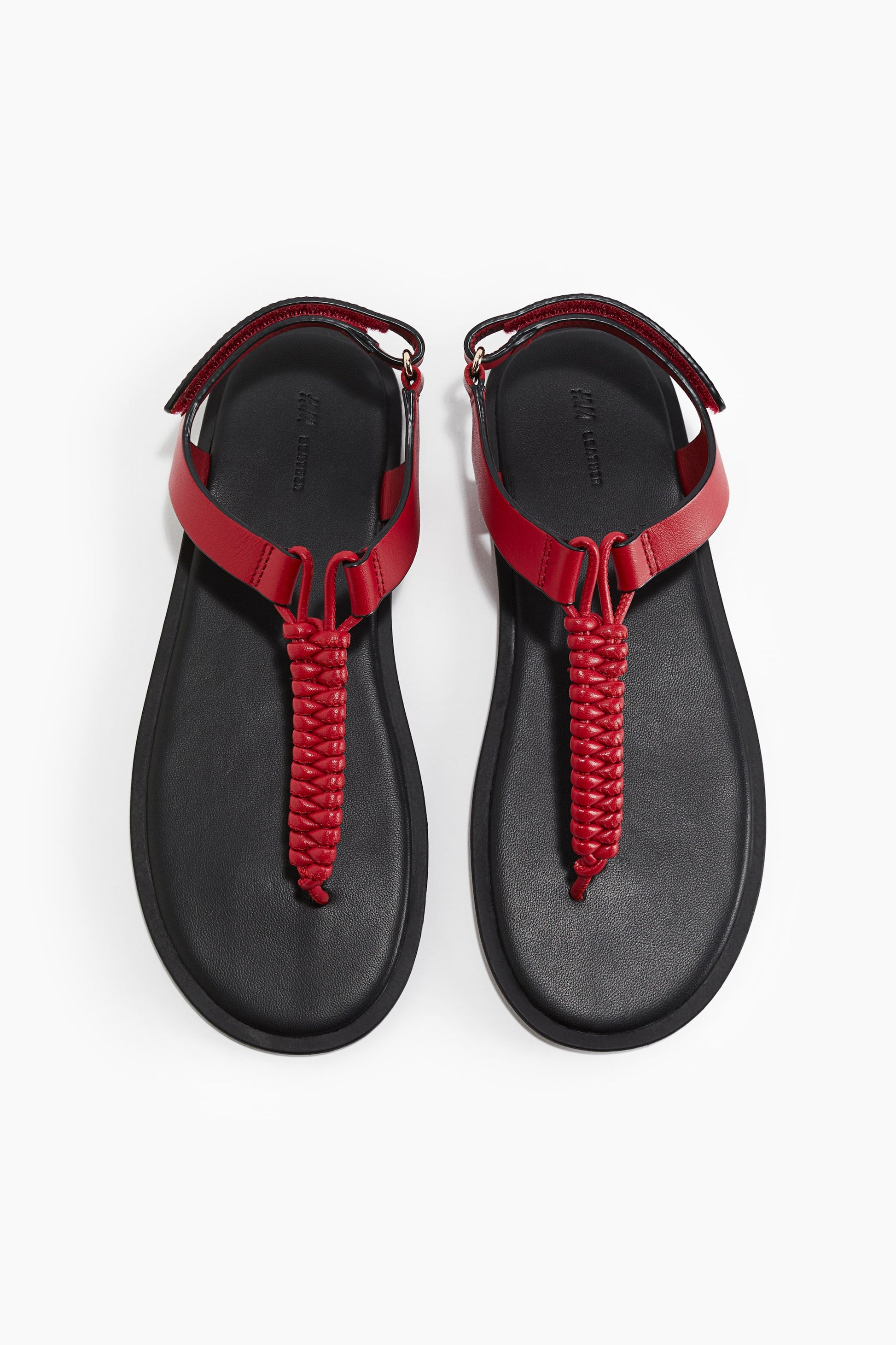 Flat sandals in leather with rounded toes, a braided foot strap and narrow toe post. Adjustable ankle strap with a hook and loop fastener. Leather insoles.