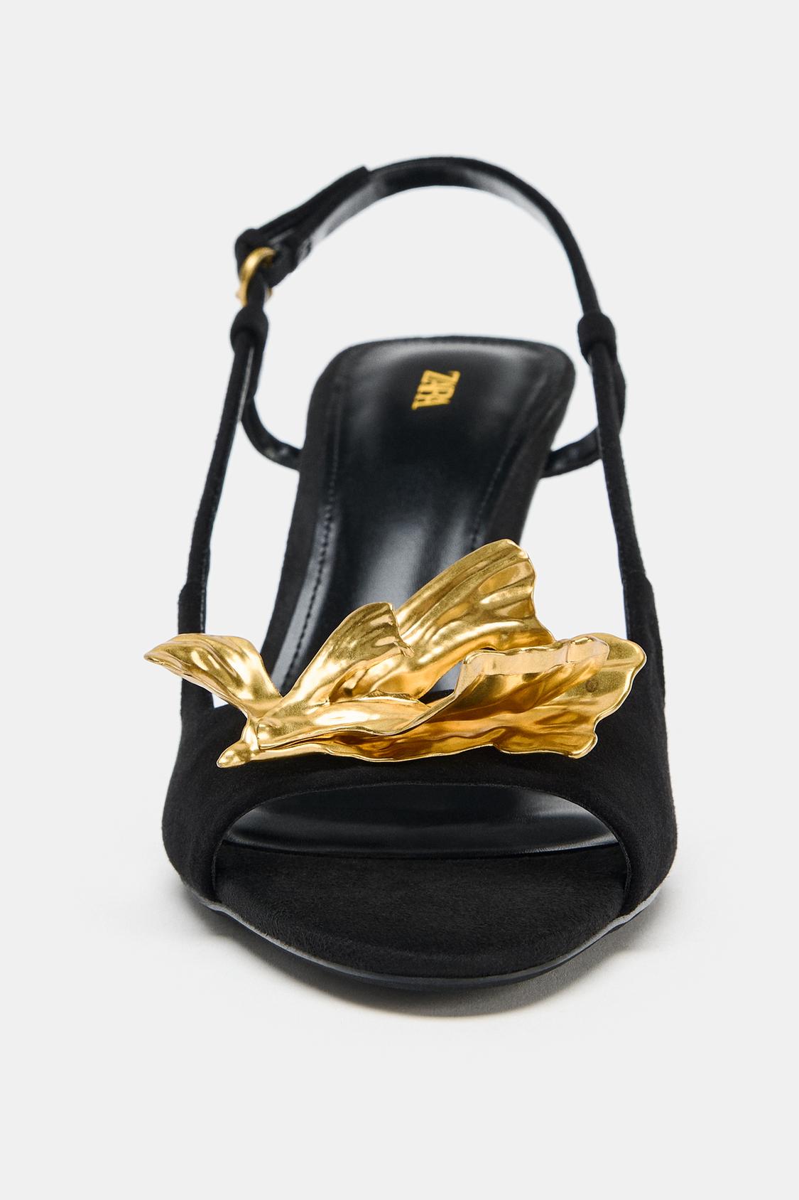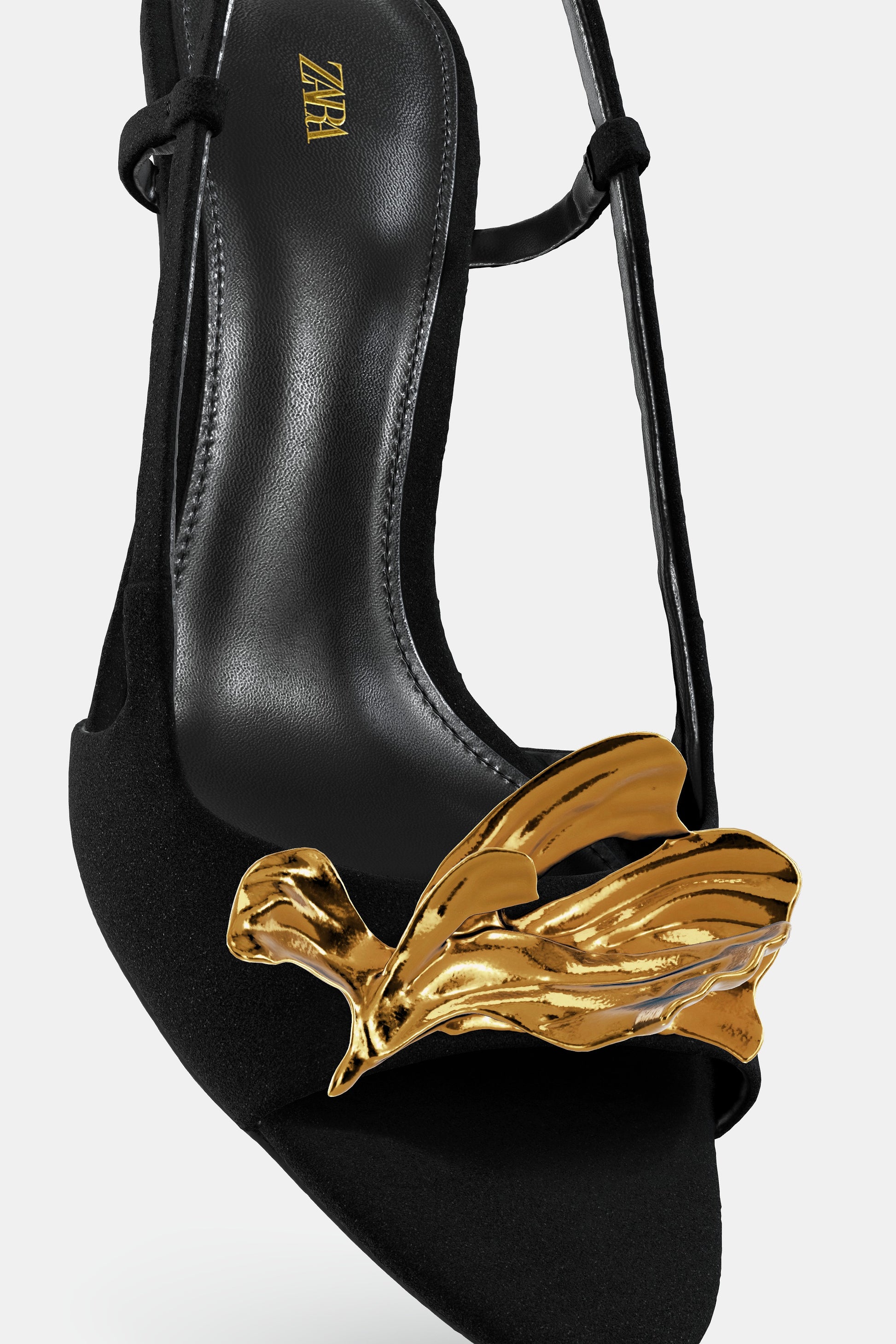 Leather slingback high-heel shoes. Metal appliqu on the front. Back strap fastening. High stiletto heel. Round toe.