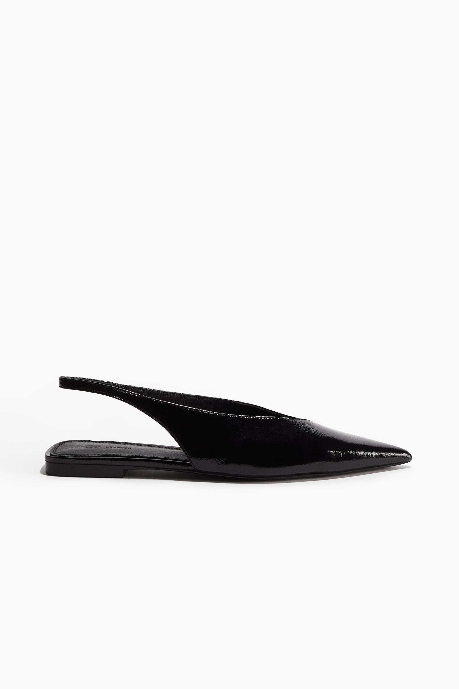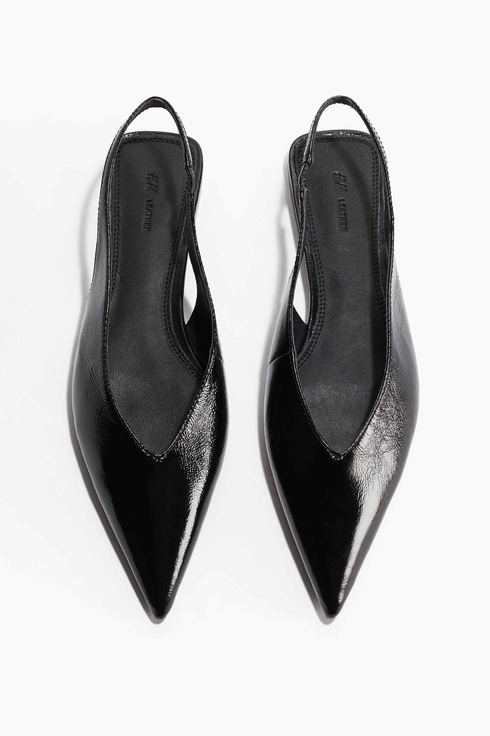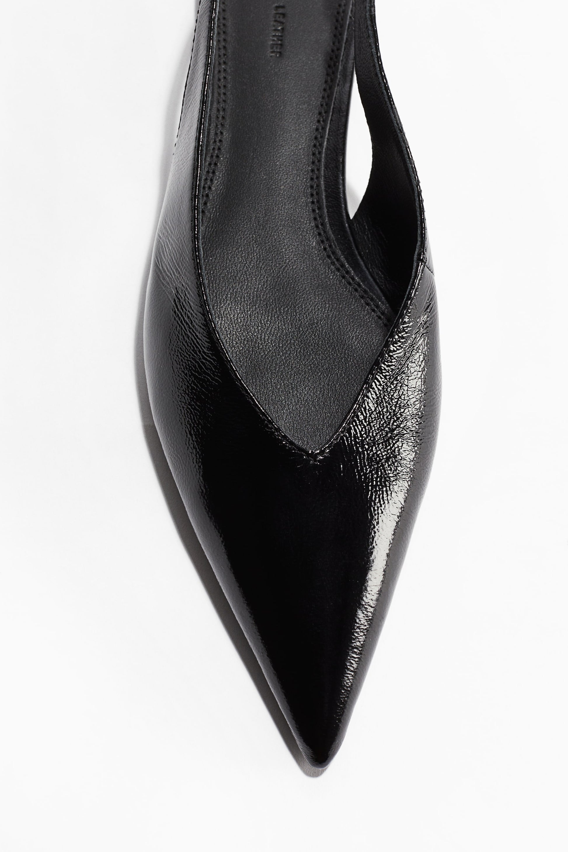 Slingbacks in shiny leather with pointed toes and a heel strap with elastication at one side. Leather linings and insoles.