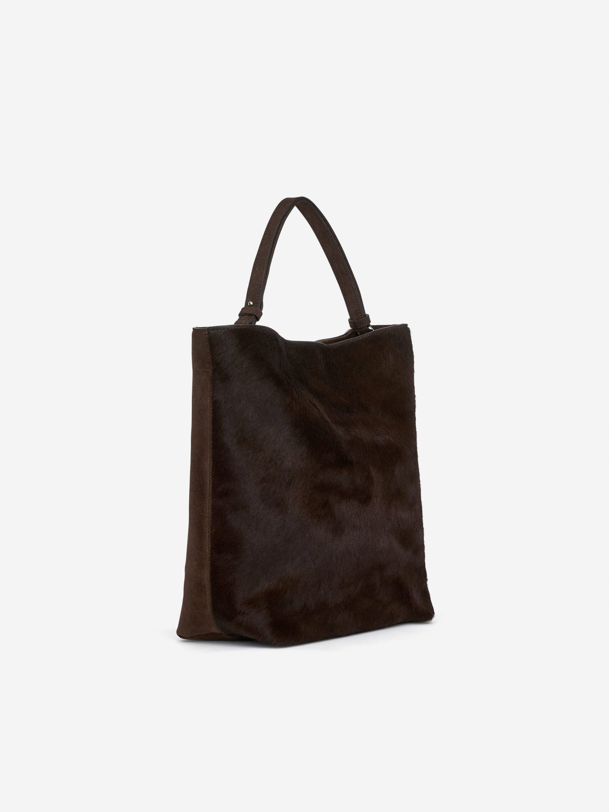 Shoulder bag featuring a haircalf front and suede back. Designed with a magnetic closure and an internal zip pocket. Width 27 cm, height 33 cm, depth 15 cm.