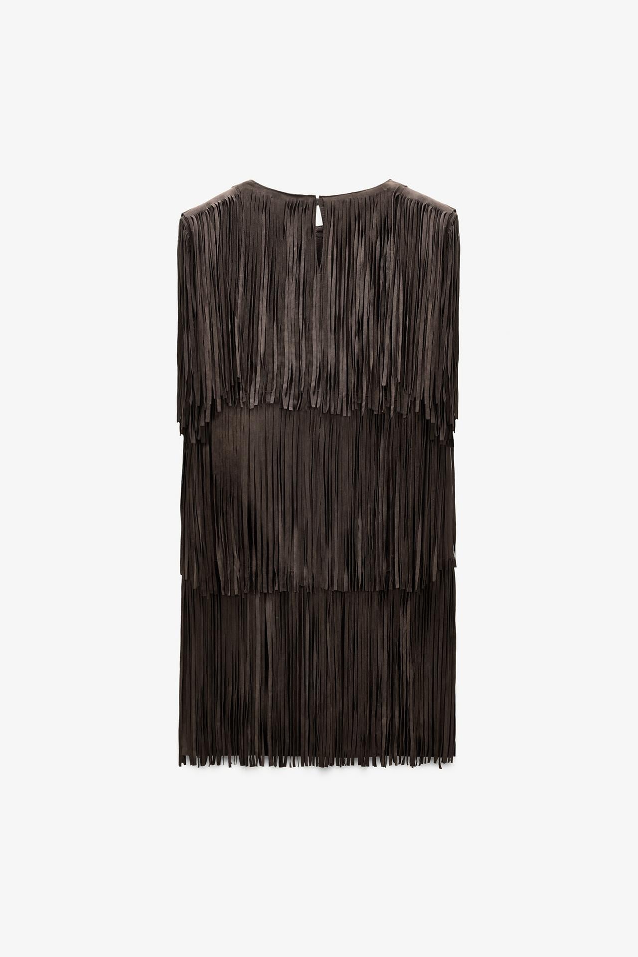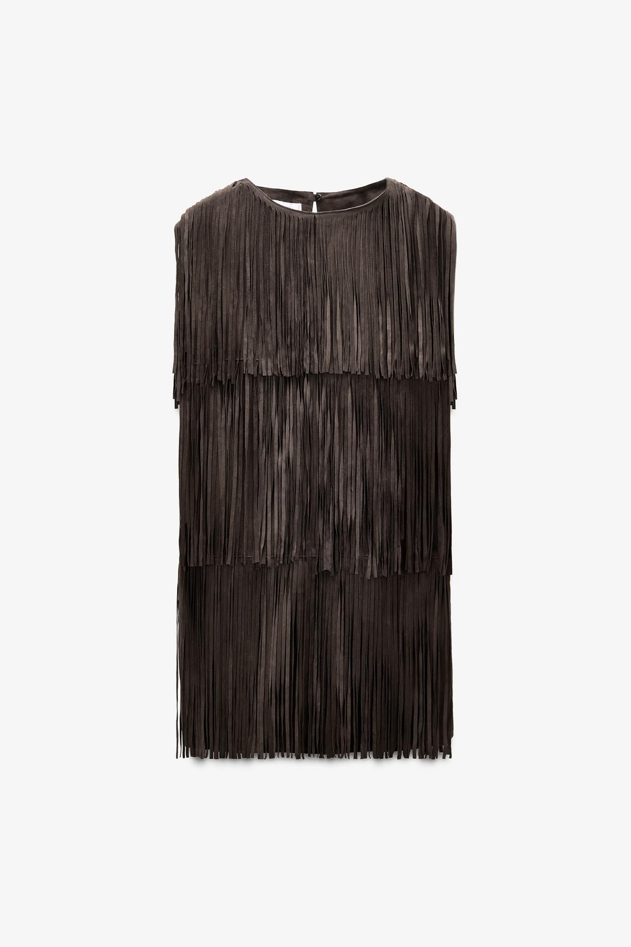 Short dress made in 100% suede leather. Round neck and sleeveless. Fringe detail in the same fabric. Back closure with opening and button.