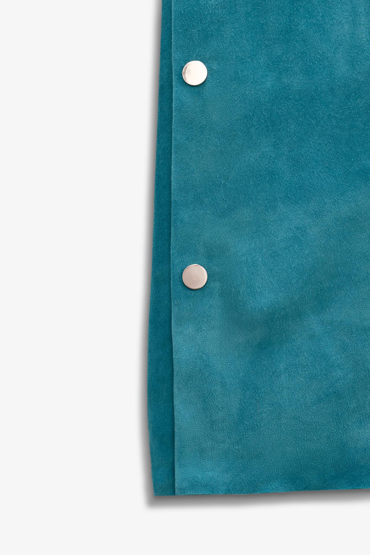 Kaftan-style dress made from 100% suede leather. V-neck and drop short sleeve. Patch pocket on the front. Marked topstitching detail and matching fabric ties on the back. Hem with side vents and snap-button fastening.