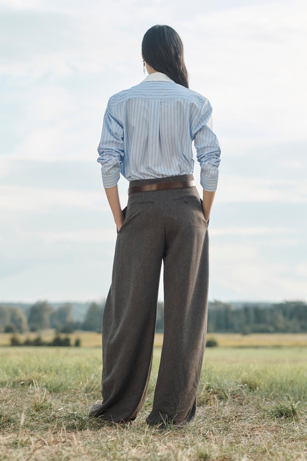 Mid-waist trousers made from a 43% wool yarn blend. Featuring concealed side seam pockets and rear welt pockets. Pleats on the front. Voluminous leg. Front zip fly, button and metal hook fastening.