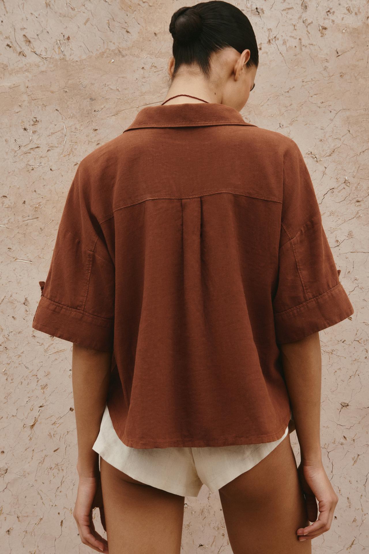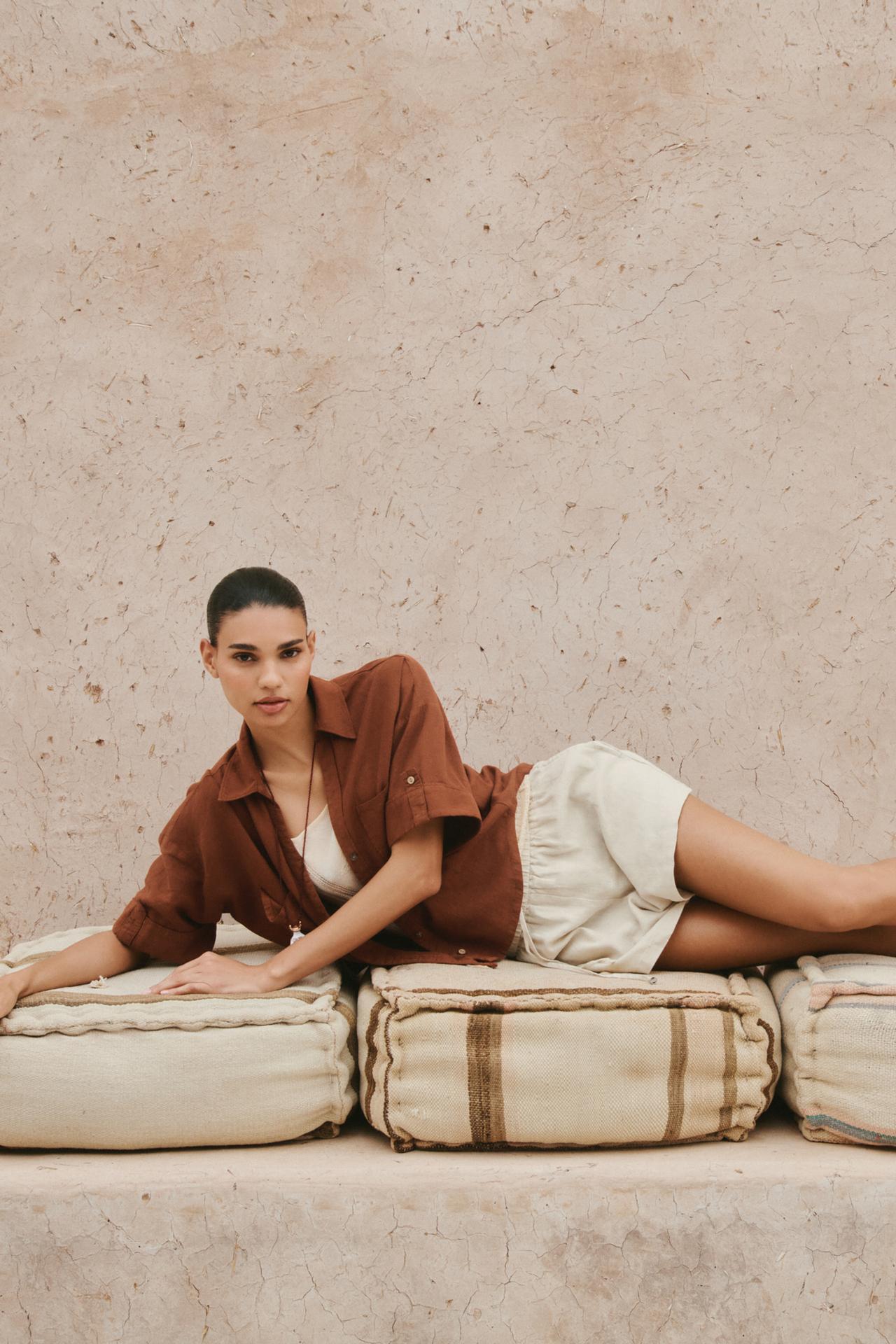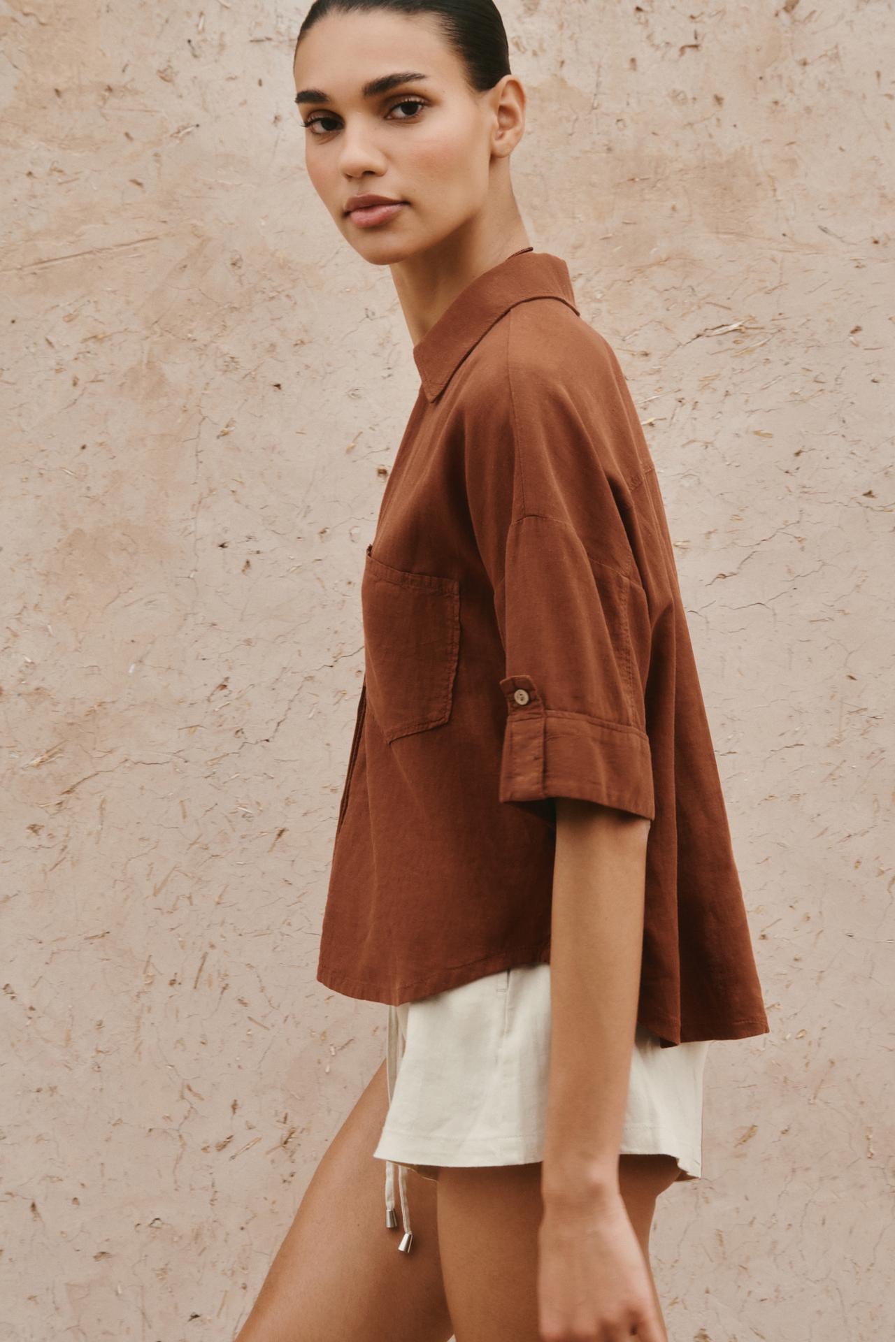 Bermuda shorts in a linen blend. High waist with elastic drawstring waistband. Front pockets.