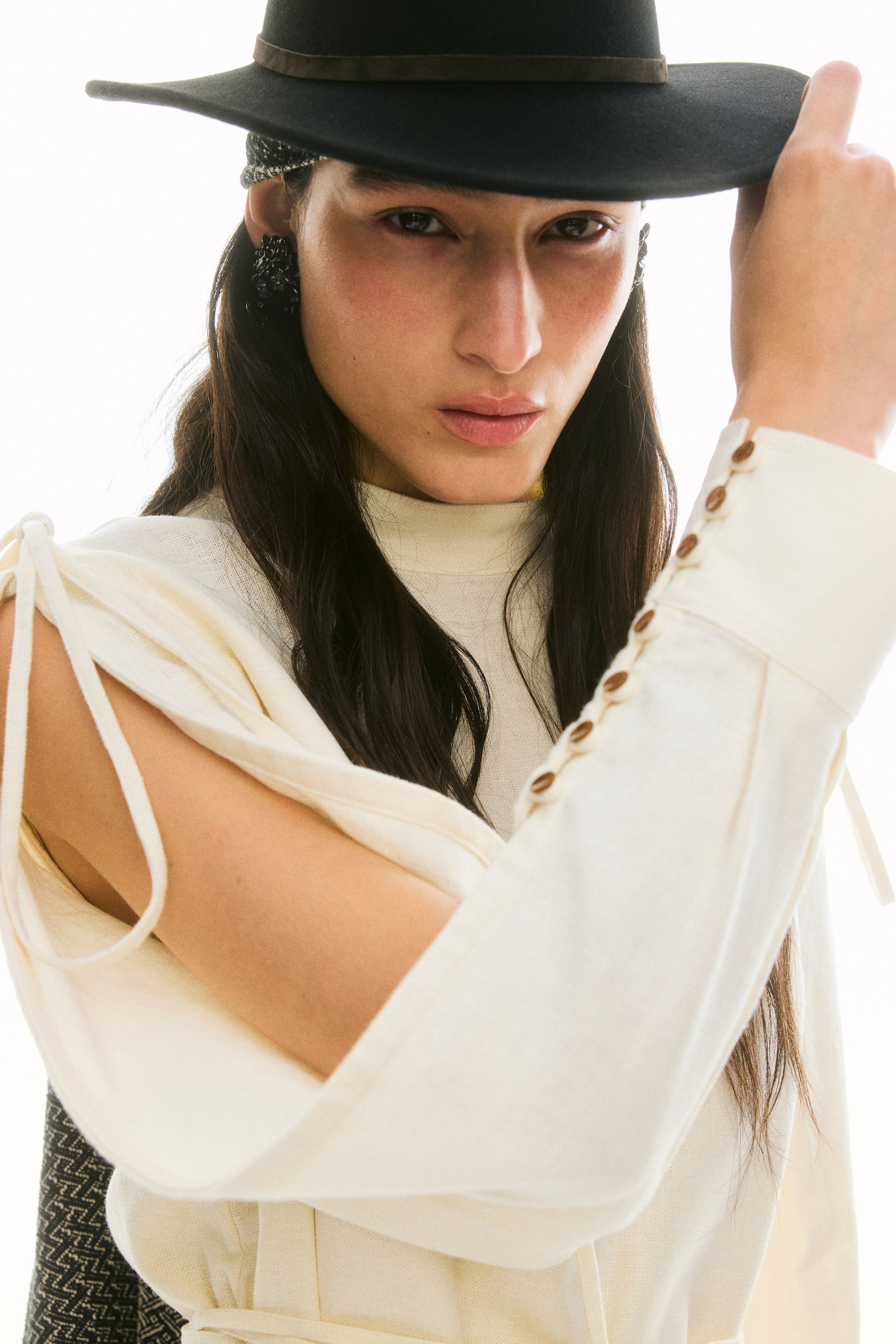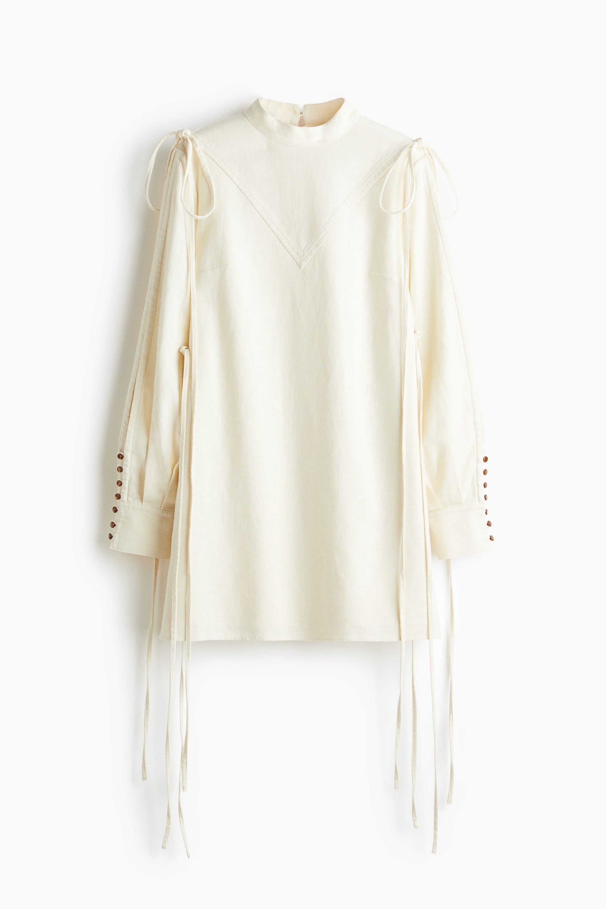 Short dress in an airy linen and cotton weave with a stand collar and a V-shaped front yoke. Long split sleeves detailed with neat button and loop fasteners at the cuffs and long ties attached to the shoulder seams. Deep slit opening at the back, secured at the top with neat button and loop fasteners. A-line silhouette with bust darts and narrow ties attached to each side that can be wrapped and tied around the waist. Lined.