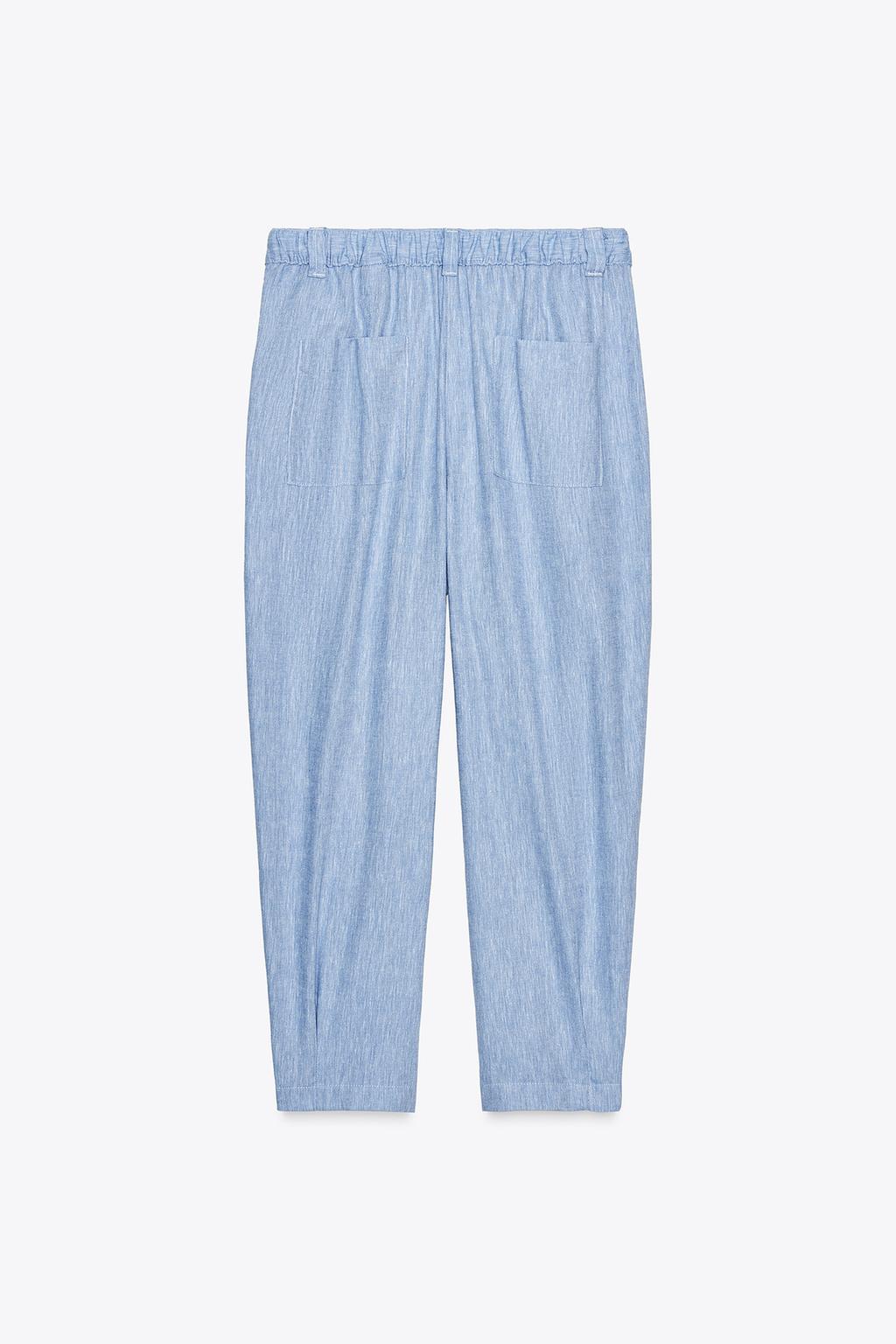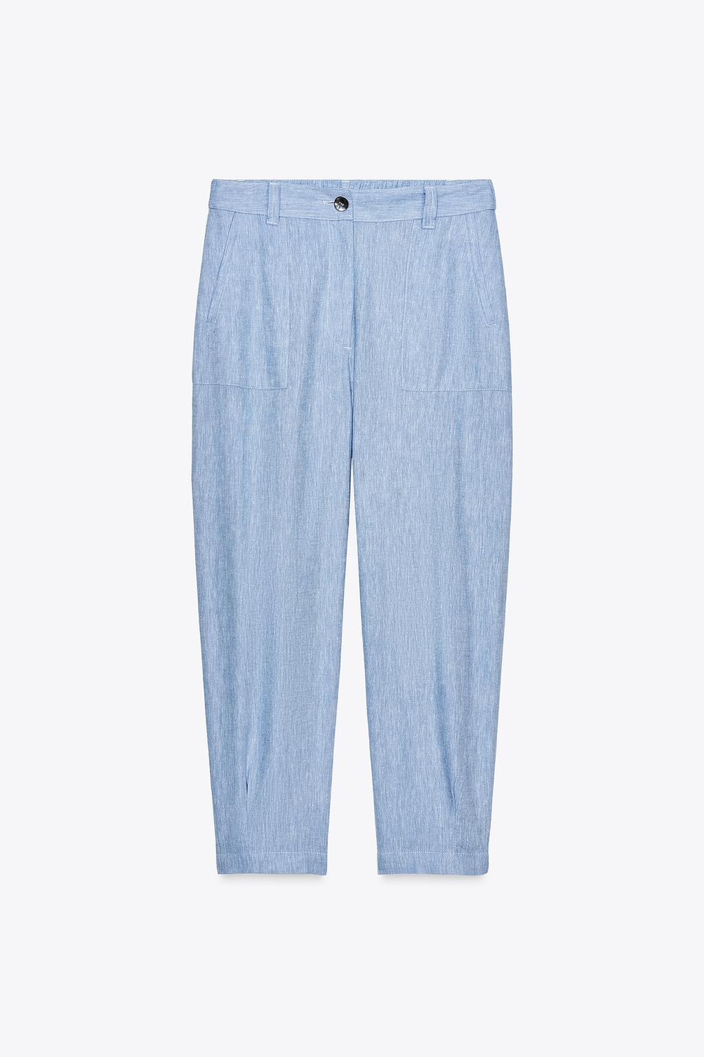Trousers made in a linen blend. High waist with front pockets and patch pockets on the back. Cuffed hem with darts. Front zip and button fastening.
