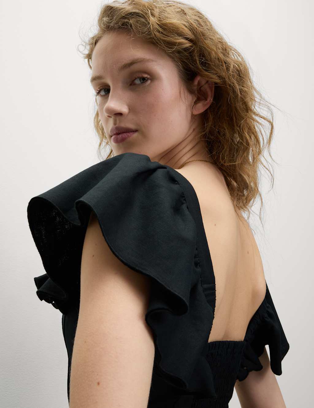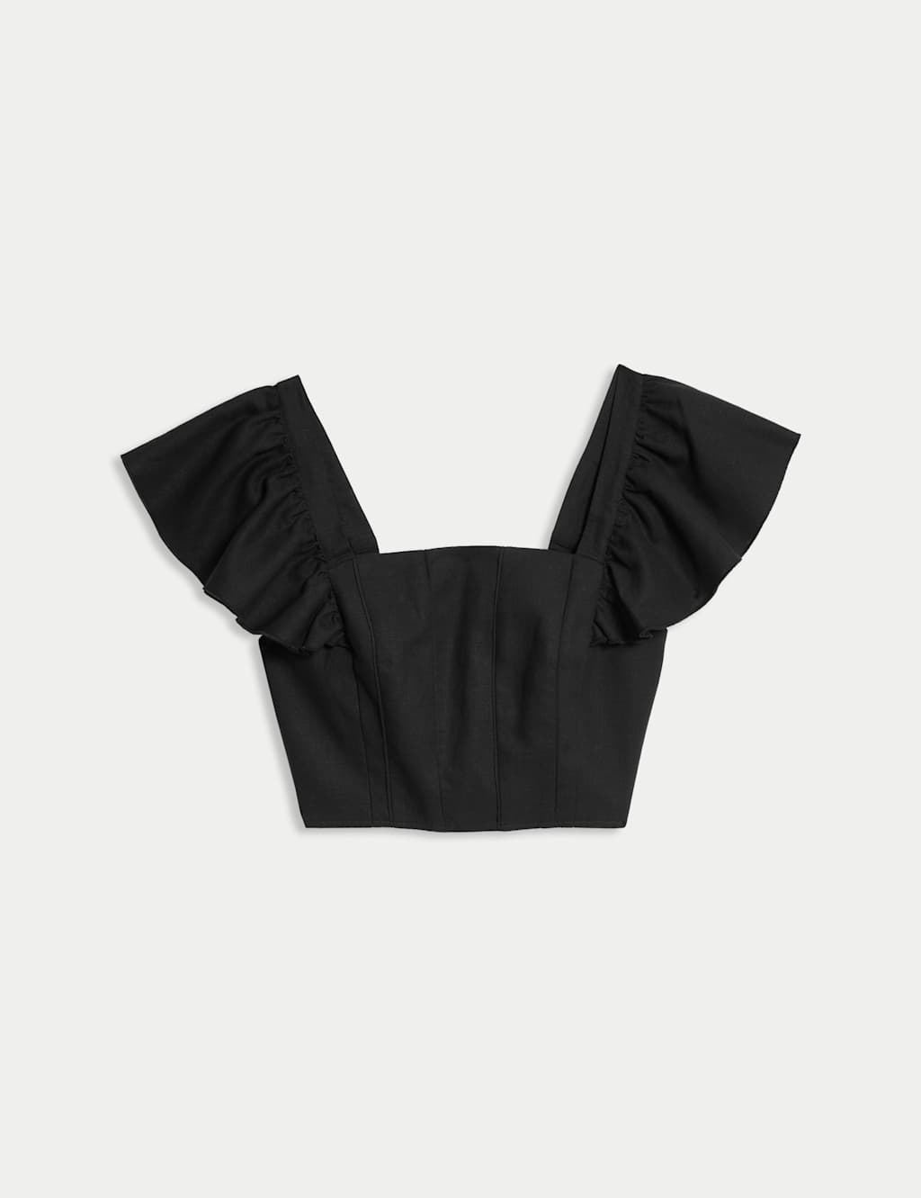 This linen-rich crop top is a stylish choice for sunny days. It's designed in a regular fit, with a flattering square neckline and a secure zip fastening at the back. Frills on the slim shoulder straps add a fun flourish.