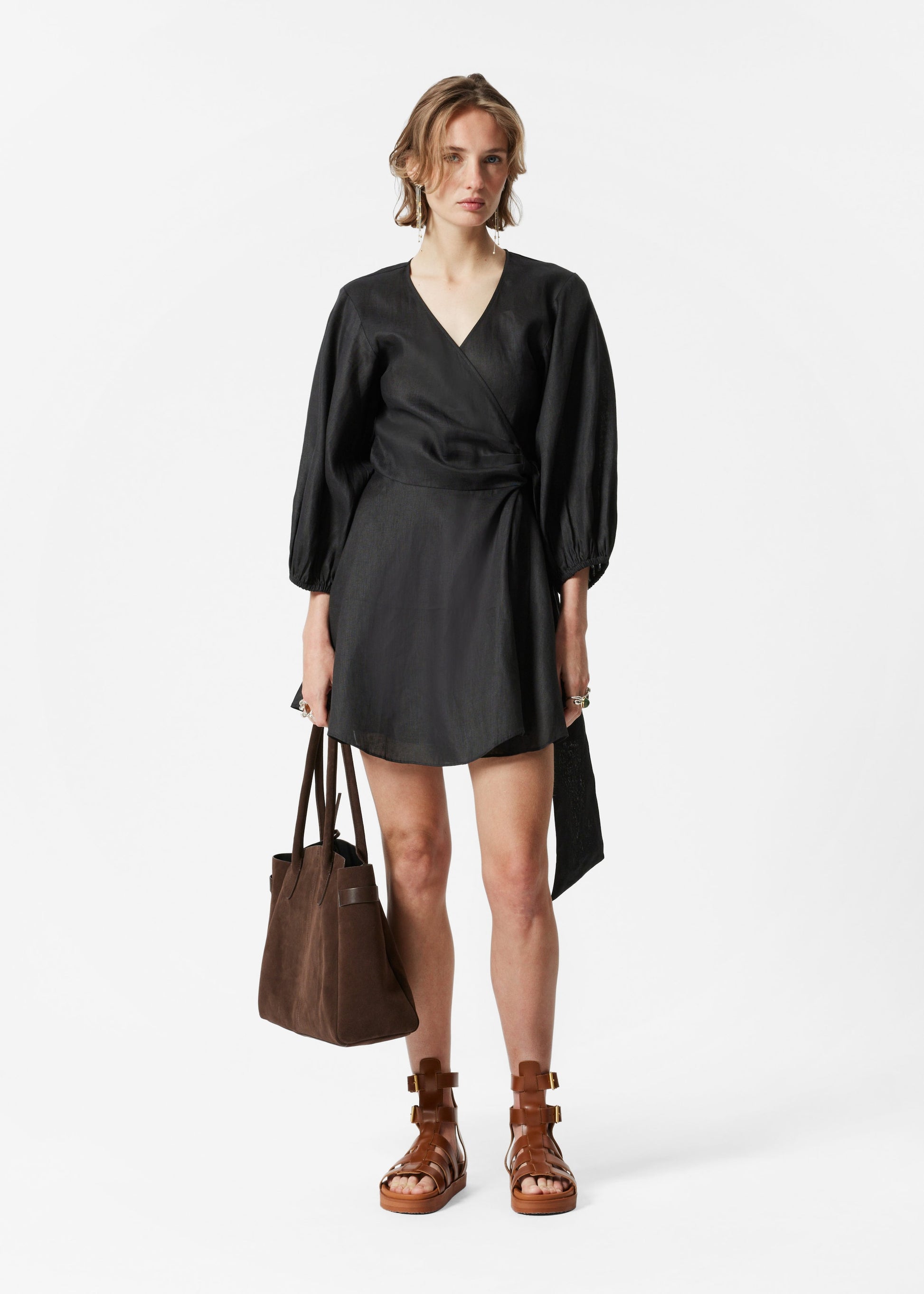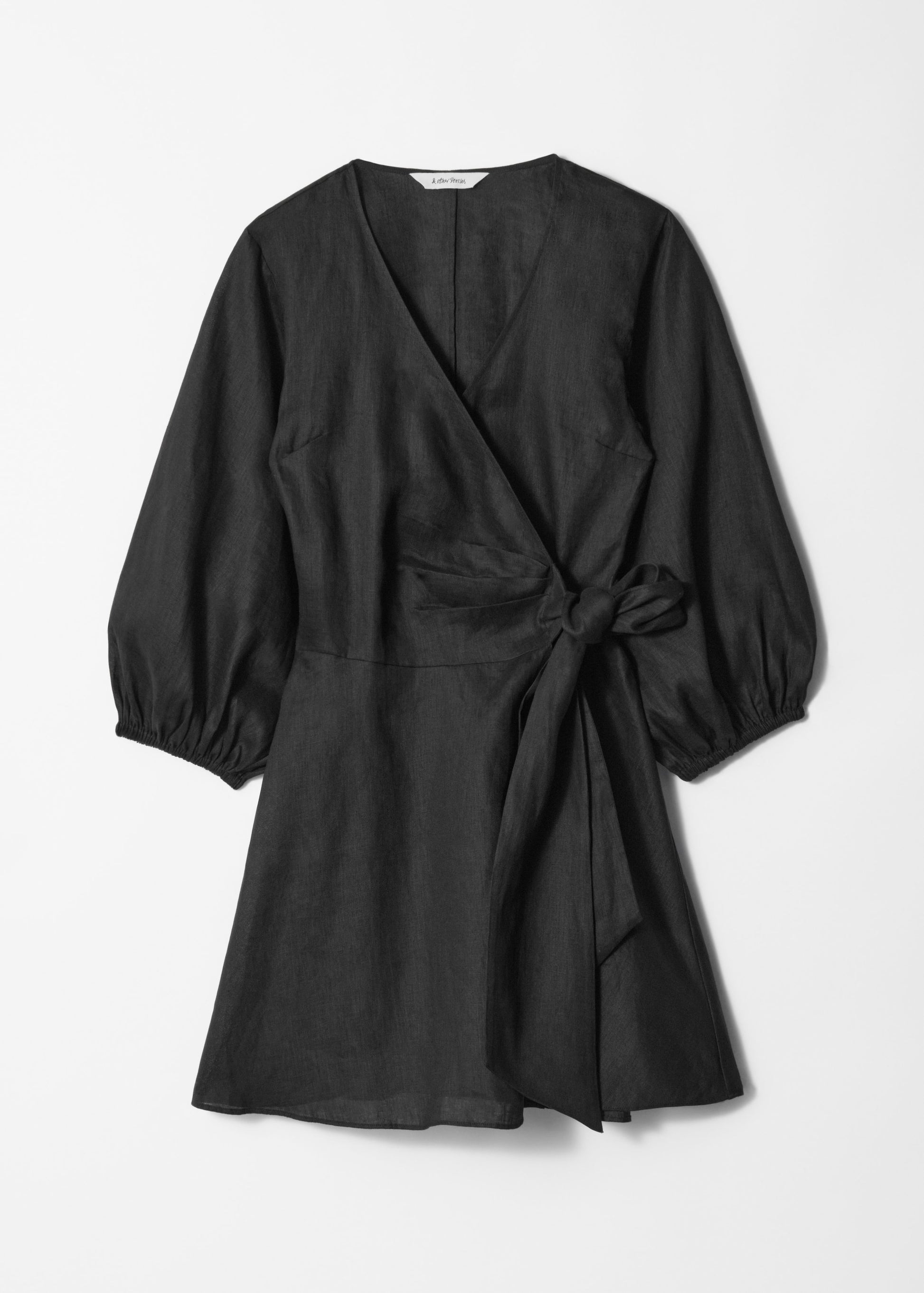 Crafted from lightweight, breathable linen, this mini dress is the epitome of warm weather dressing. Designed with a flattering V-neck and voluminous three-quarter sleeves finished with elastic cuffs. The wrapover waist ties neatly at the side, creating a cinched silhouette that falls to an A-line skirt.