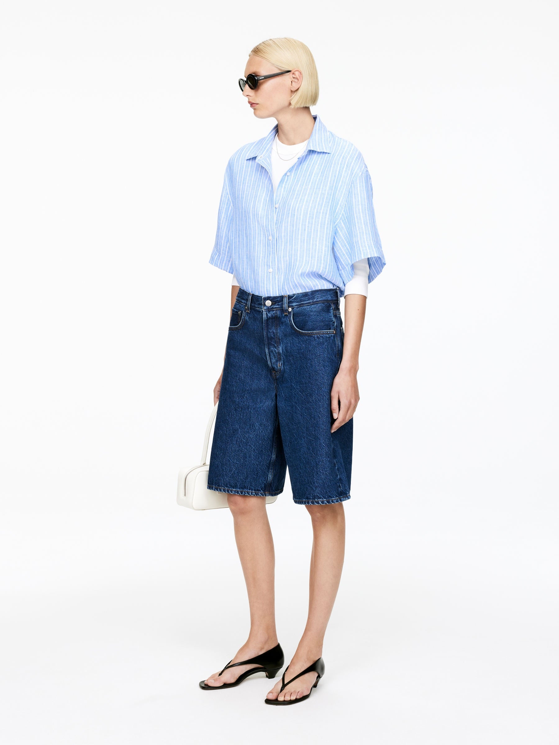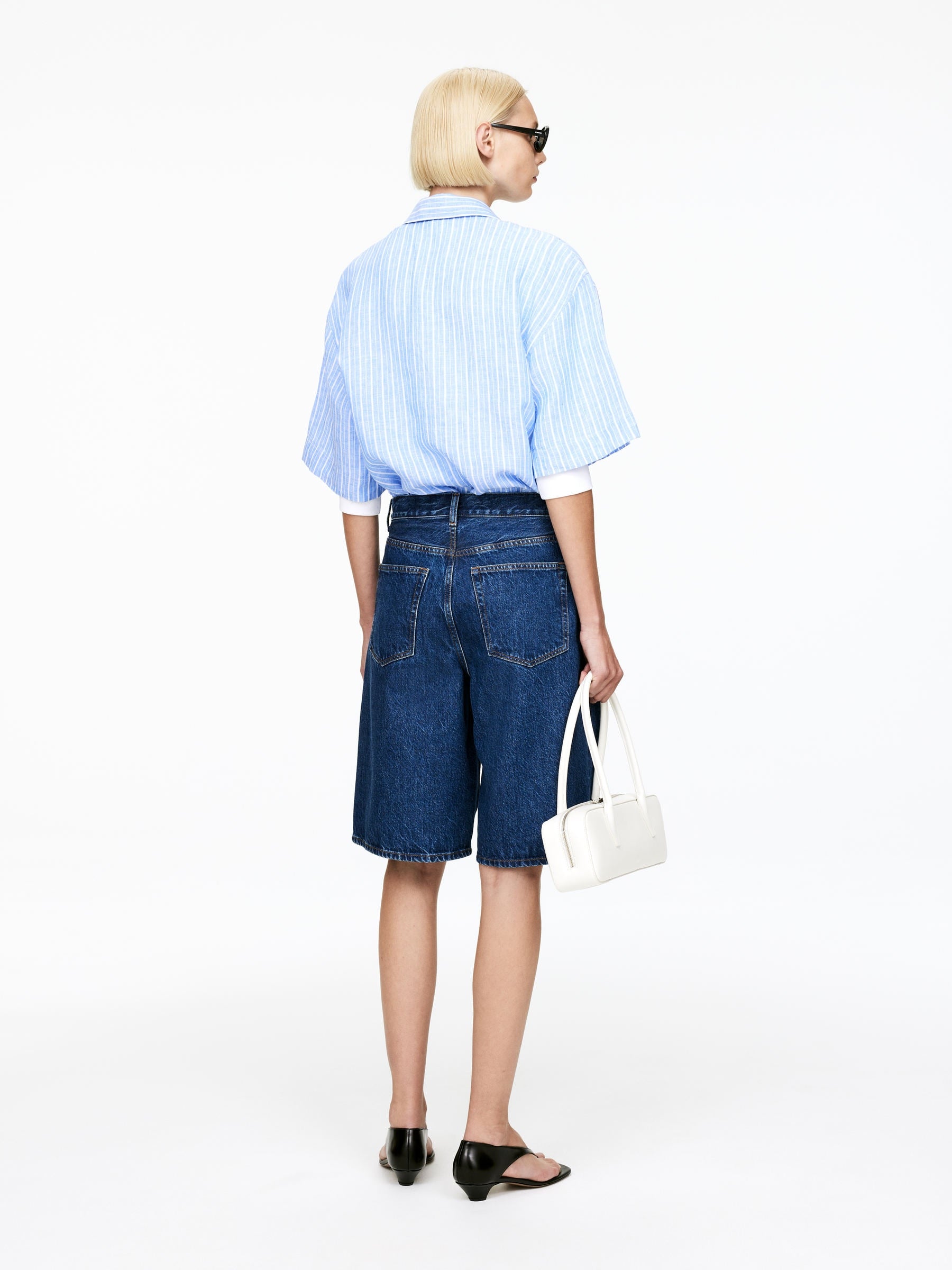 High-waist denim shorts cut for a loose fit. A classic 5-pocket style with button fly. Made from a blend of cotton and lyocell. Inside leg length 30 cm (size 28).
