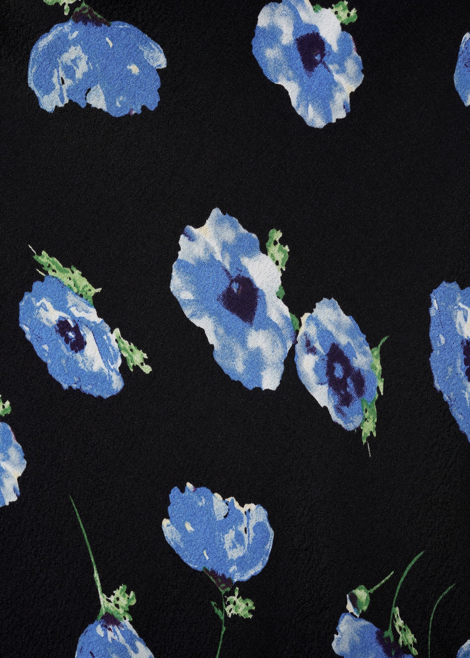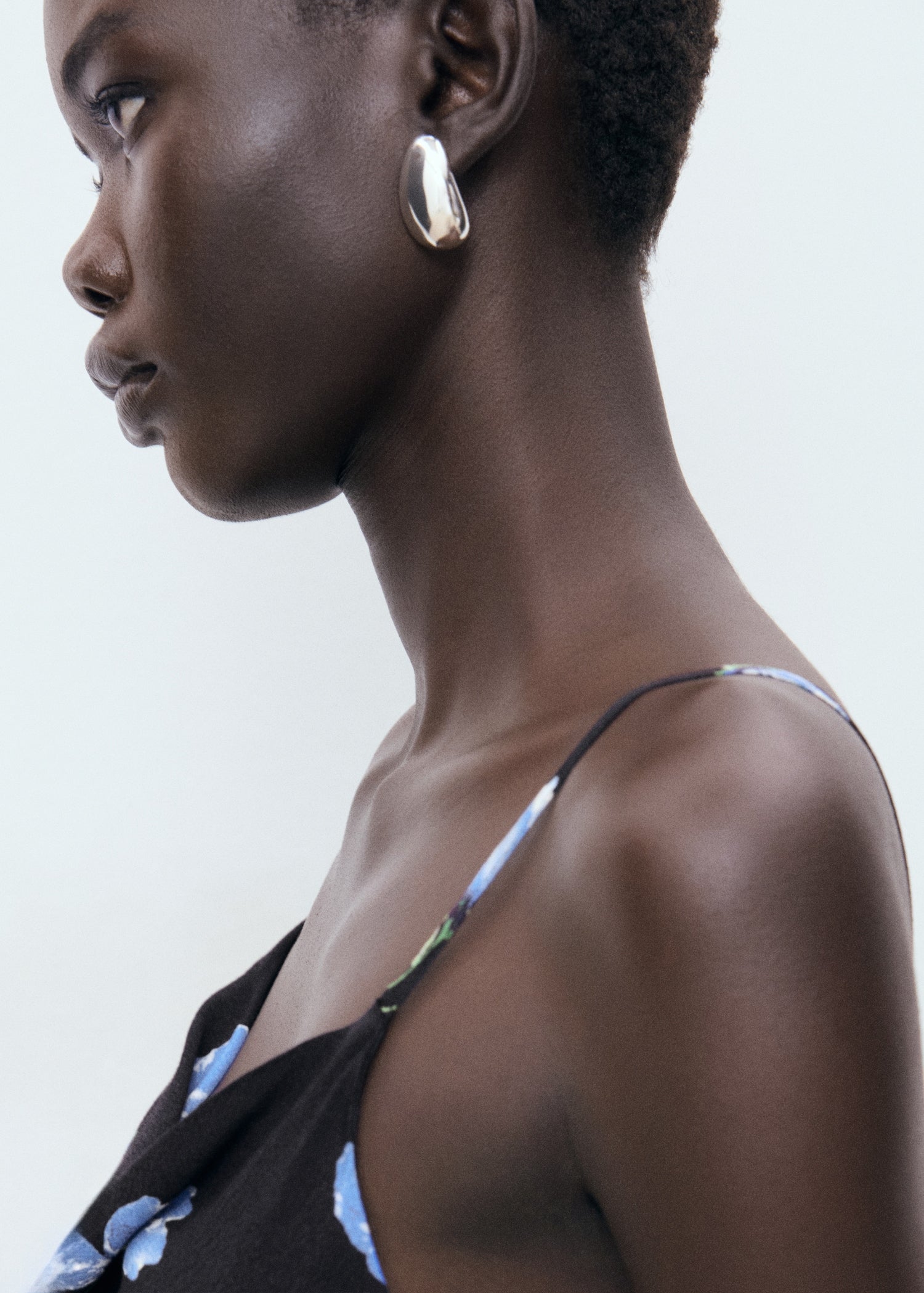Fluid fabric. Long design. Straight design. Printed design. Draped neck. Sleeveless. Thin adjustable straps. Side zip closure.