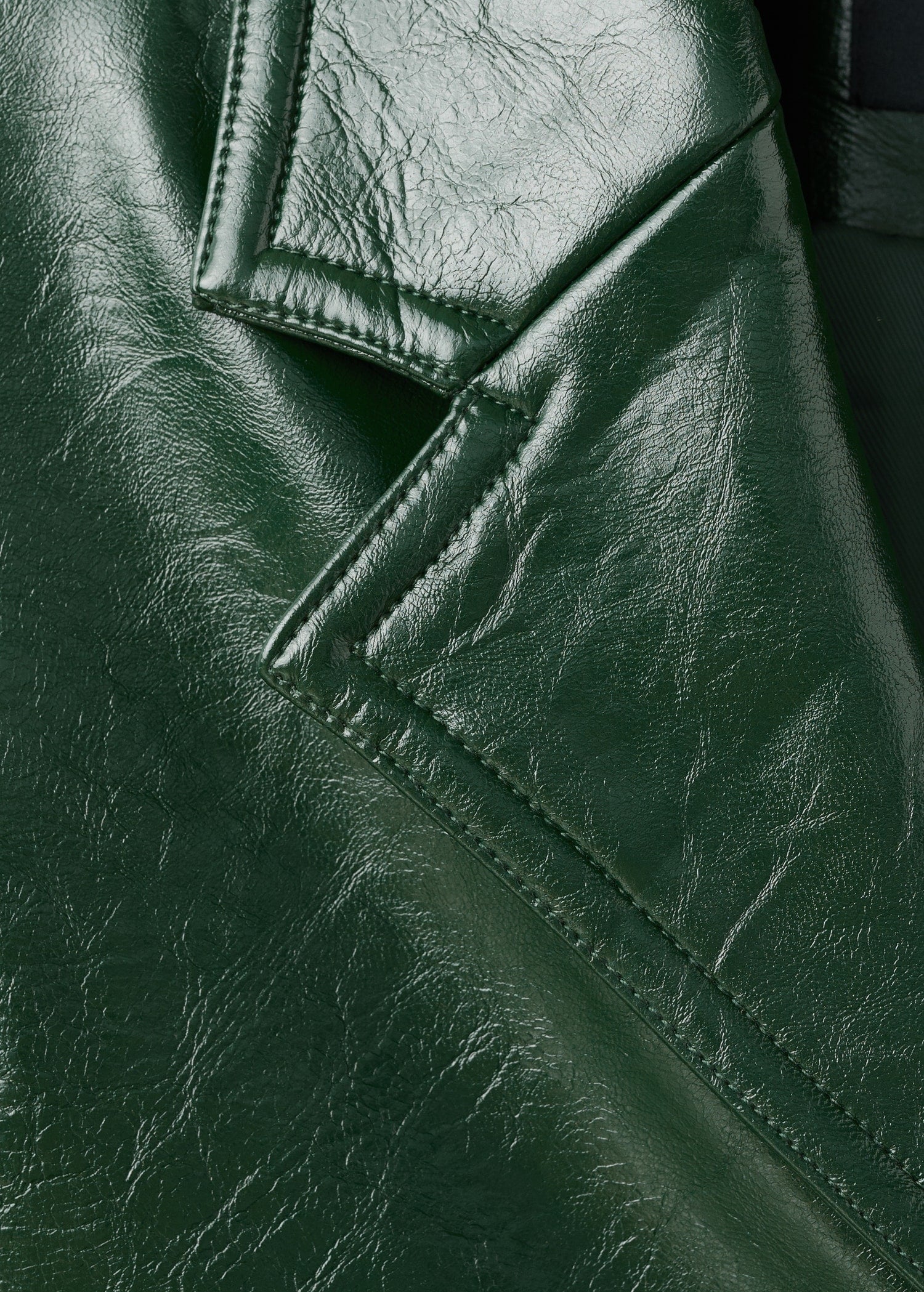 Crafted from leather-effect fabric, this long, straight design features an elegant V-neck with notch lapel. It has long sleeves, two front flap pockets, and a front button fastening. Interior lining