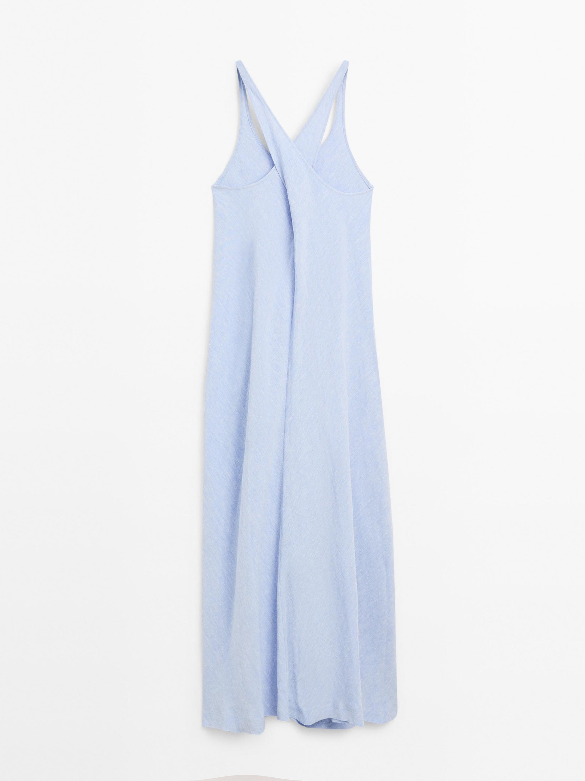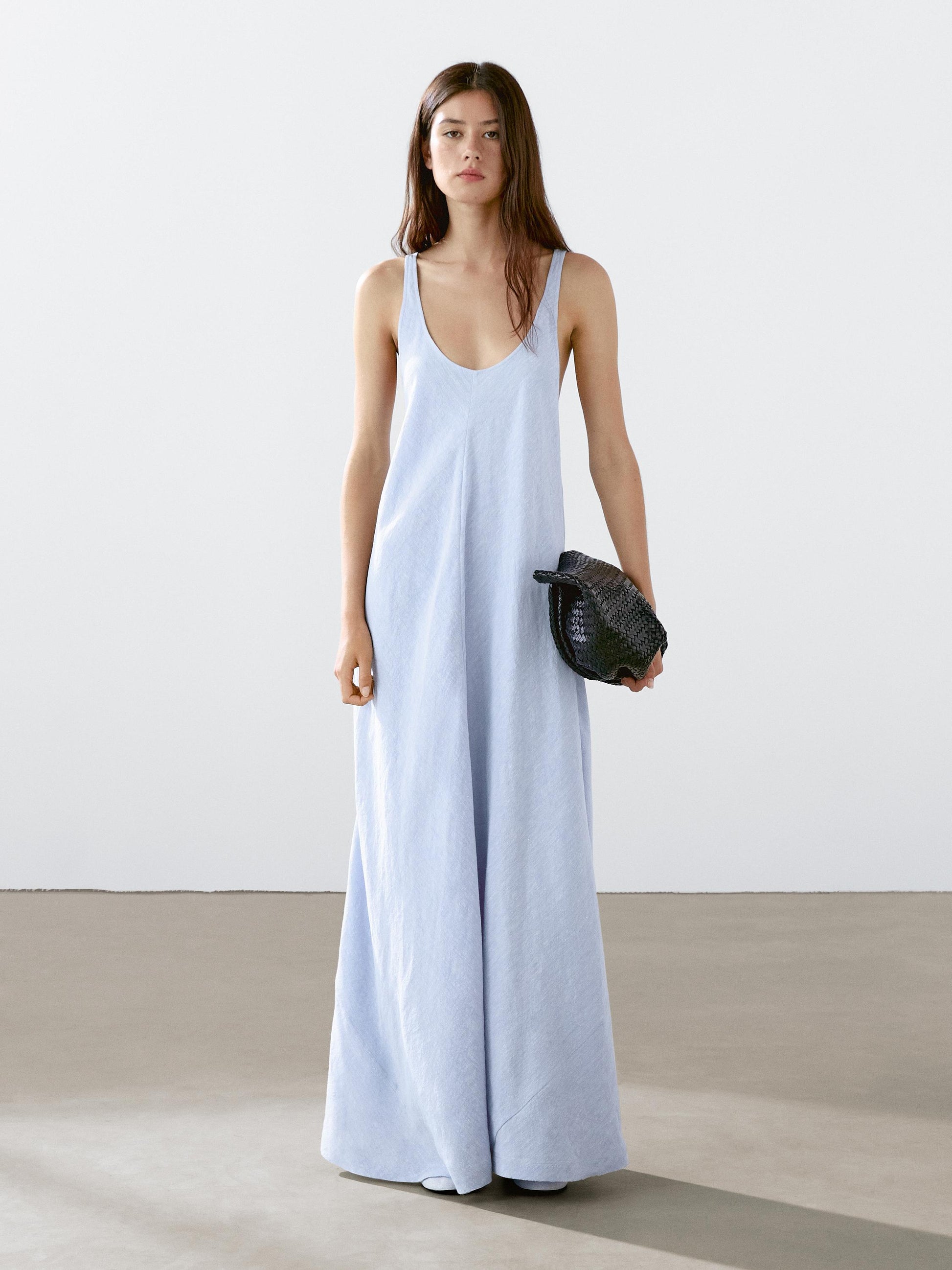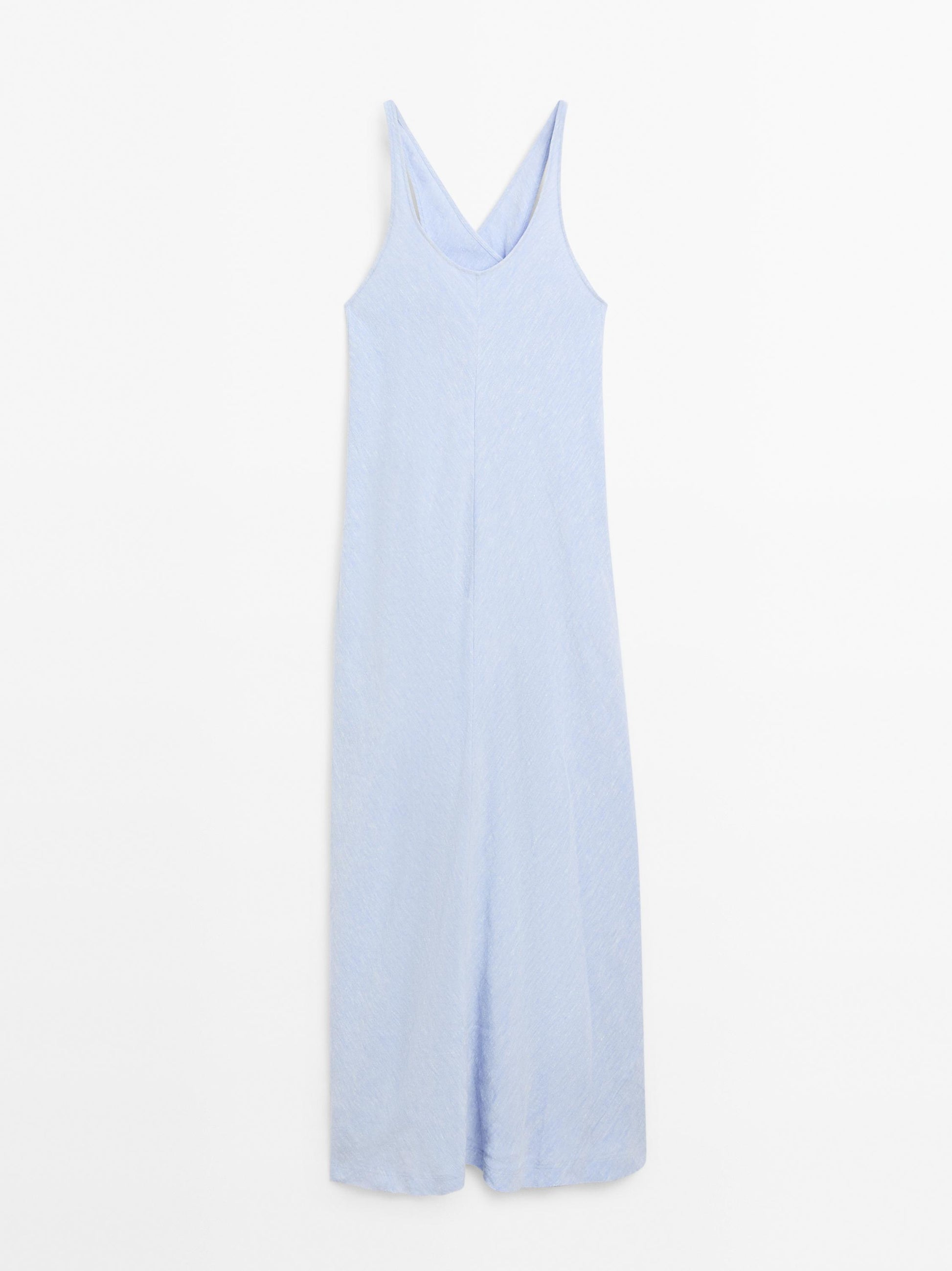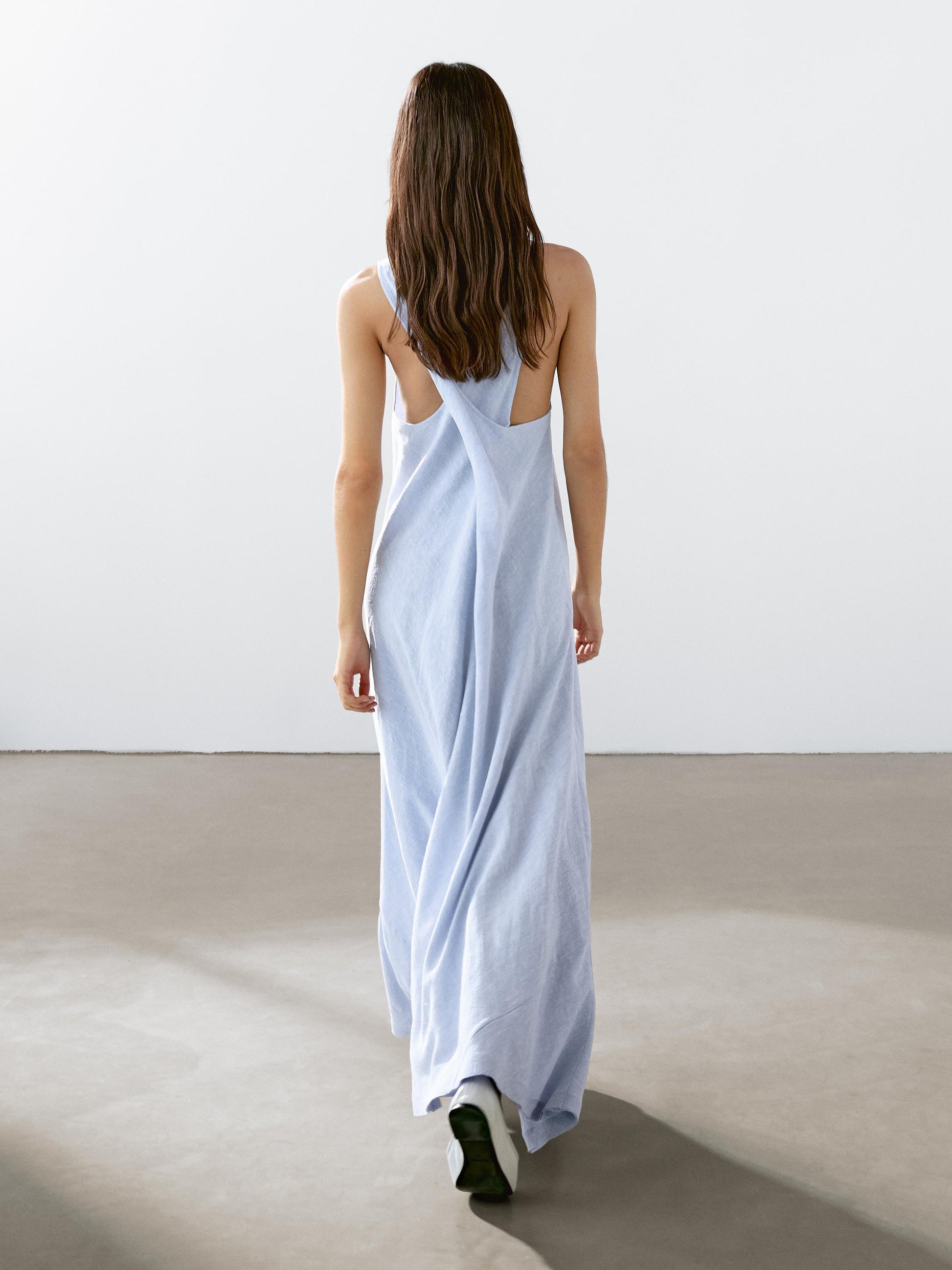 Dress made of linen fabric . Round neck. Straps that can be tied at the back. Strappy.