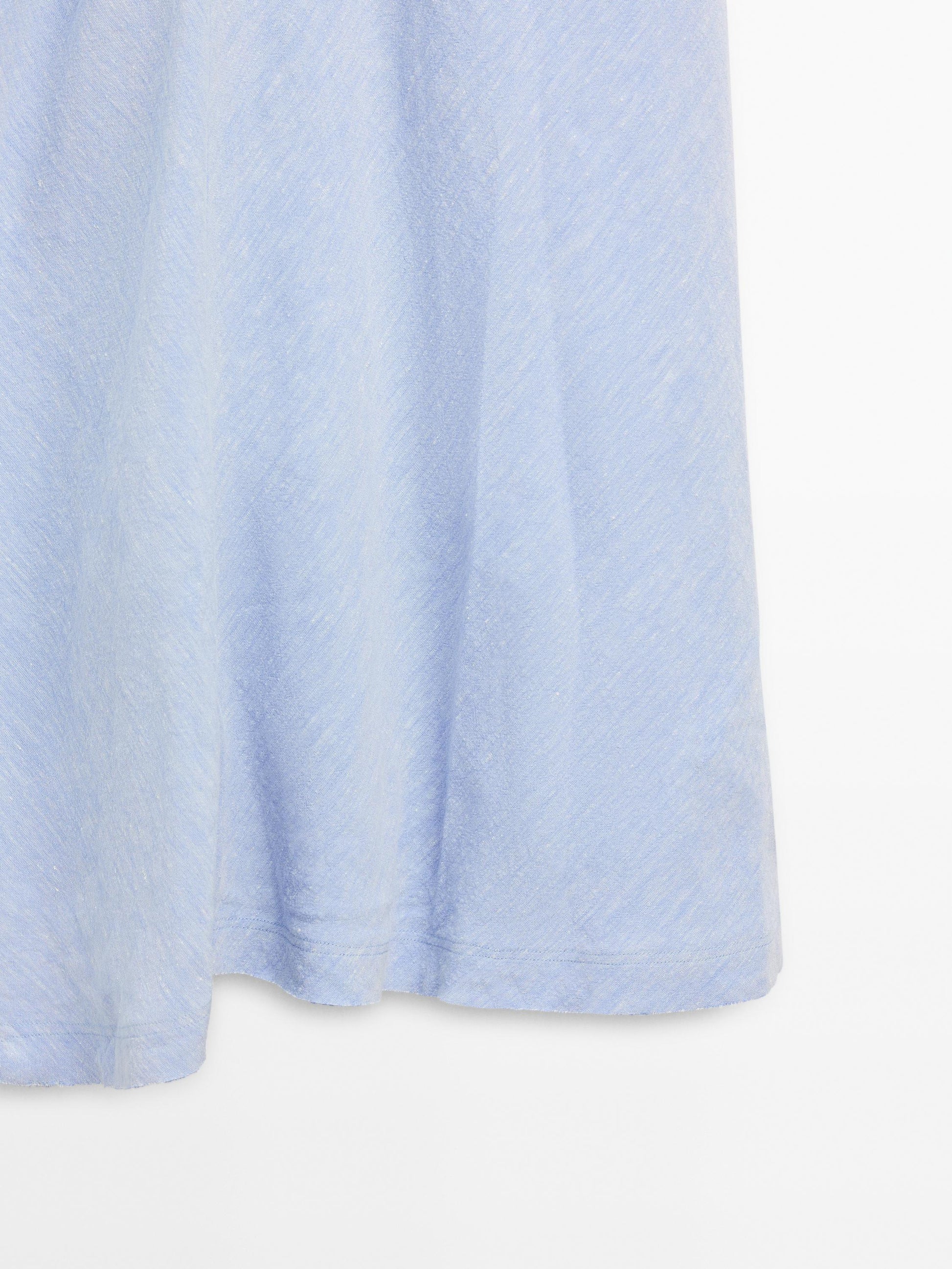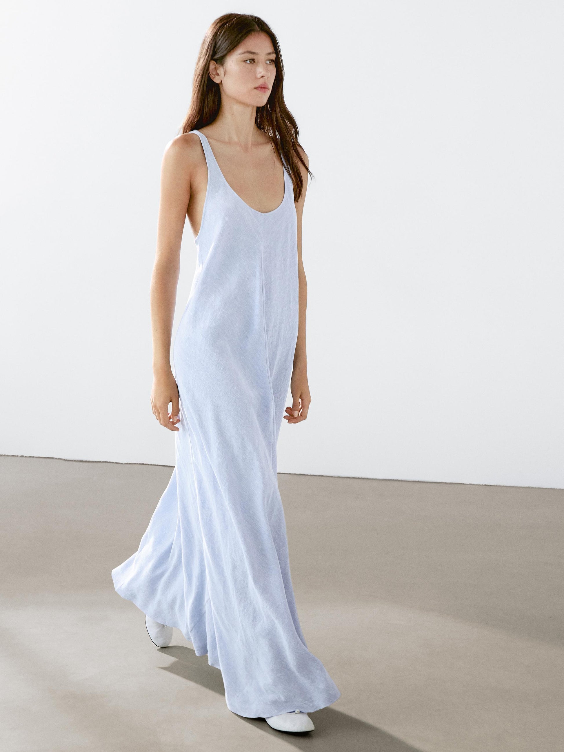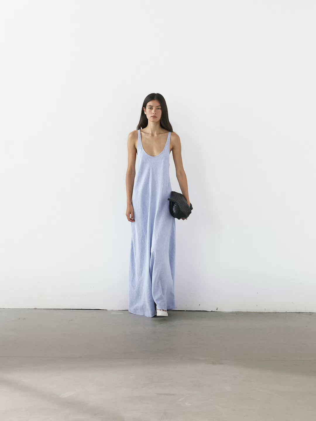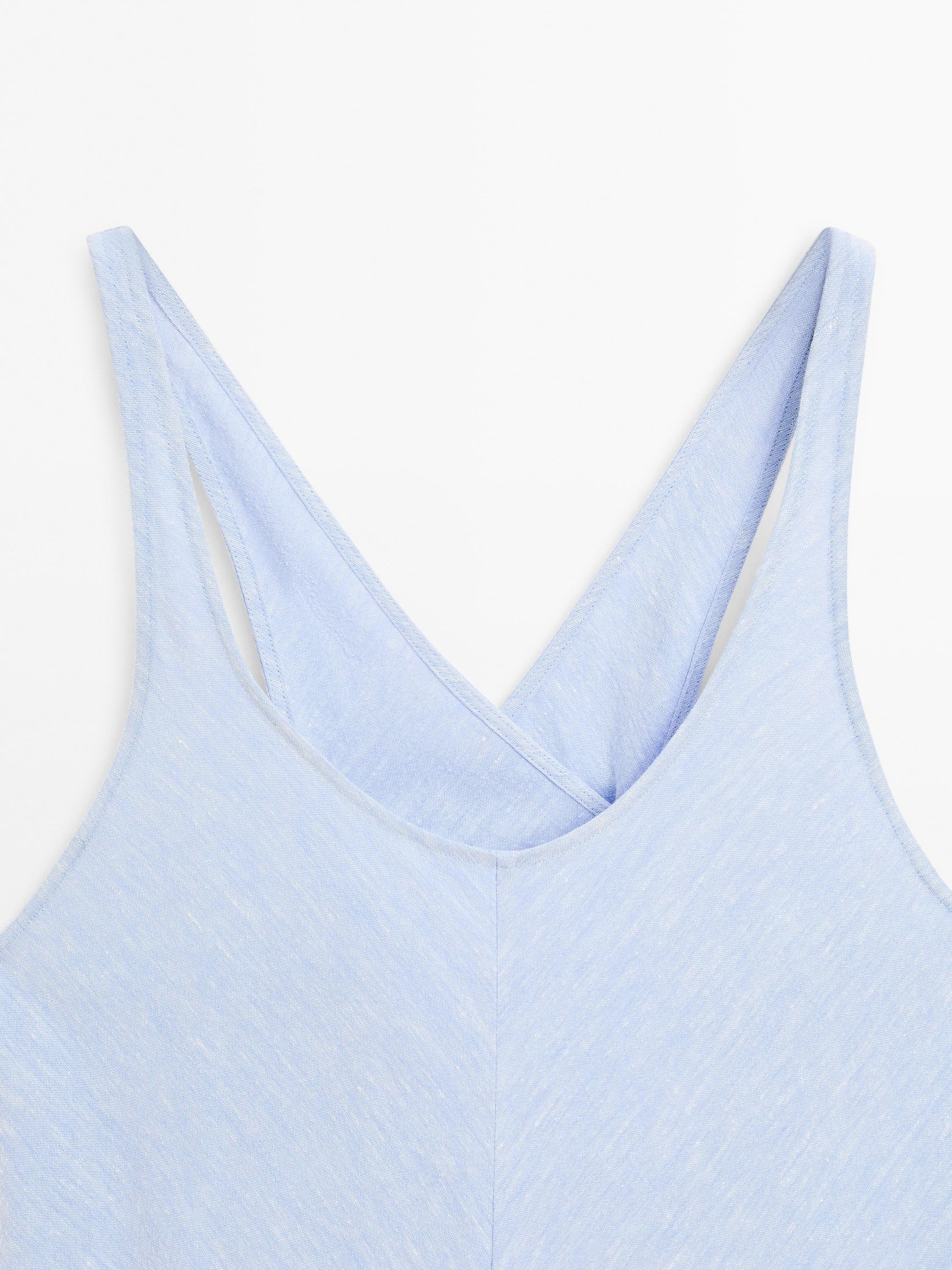 Dress made of linen fabric . Round neck. Straps that can be tied at the back. Strappy.