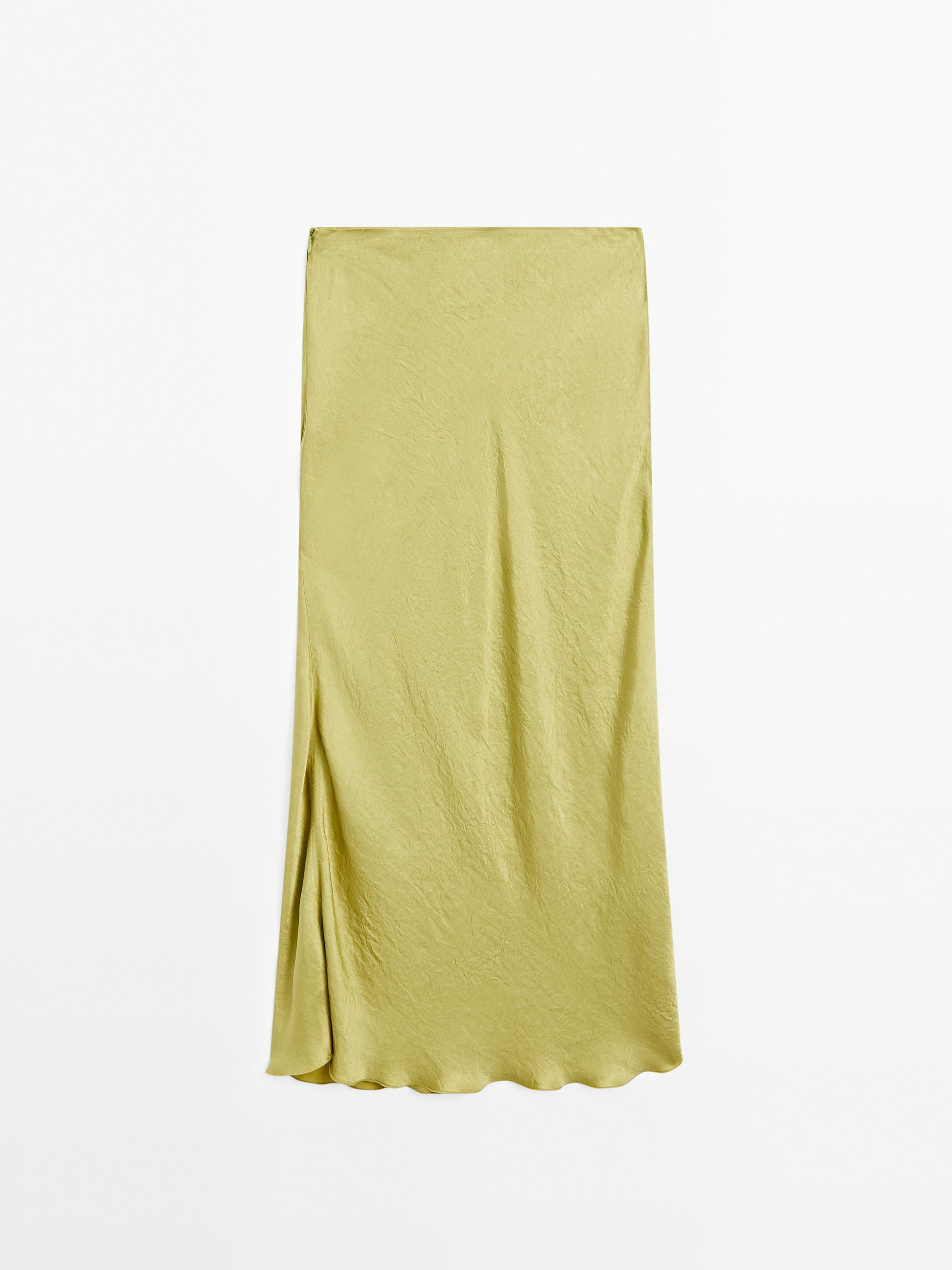 Long skirt made of flowing satin fabric. Bias cut . Side zip fastening. Matching garment available.