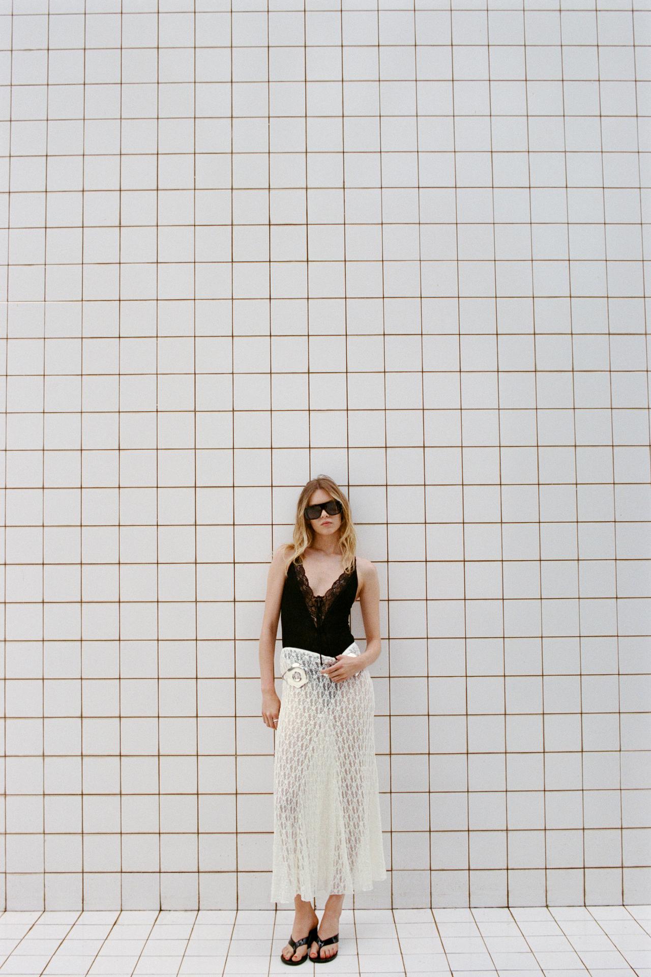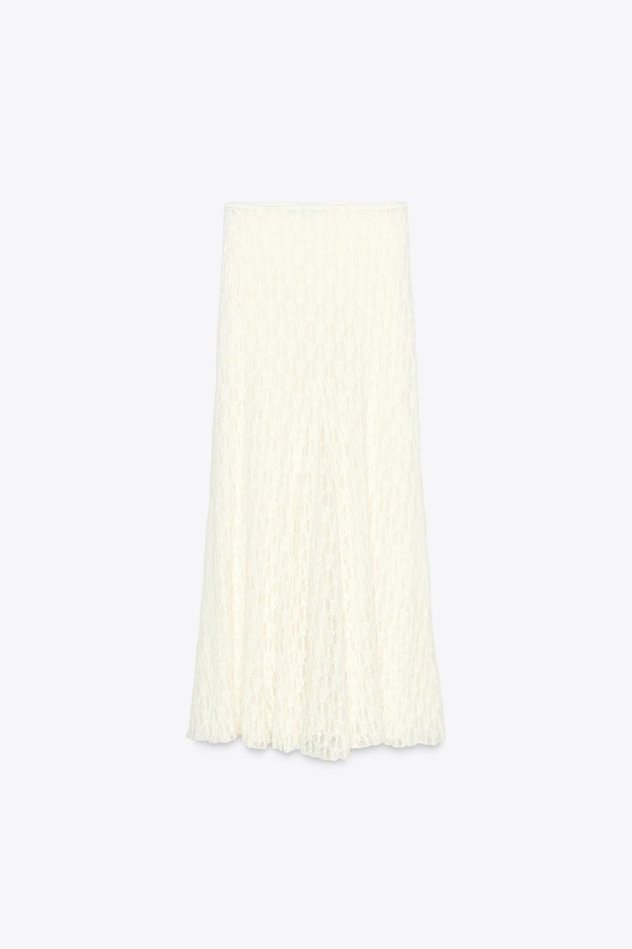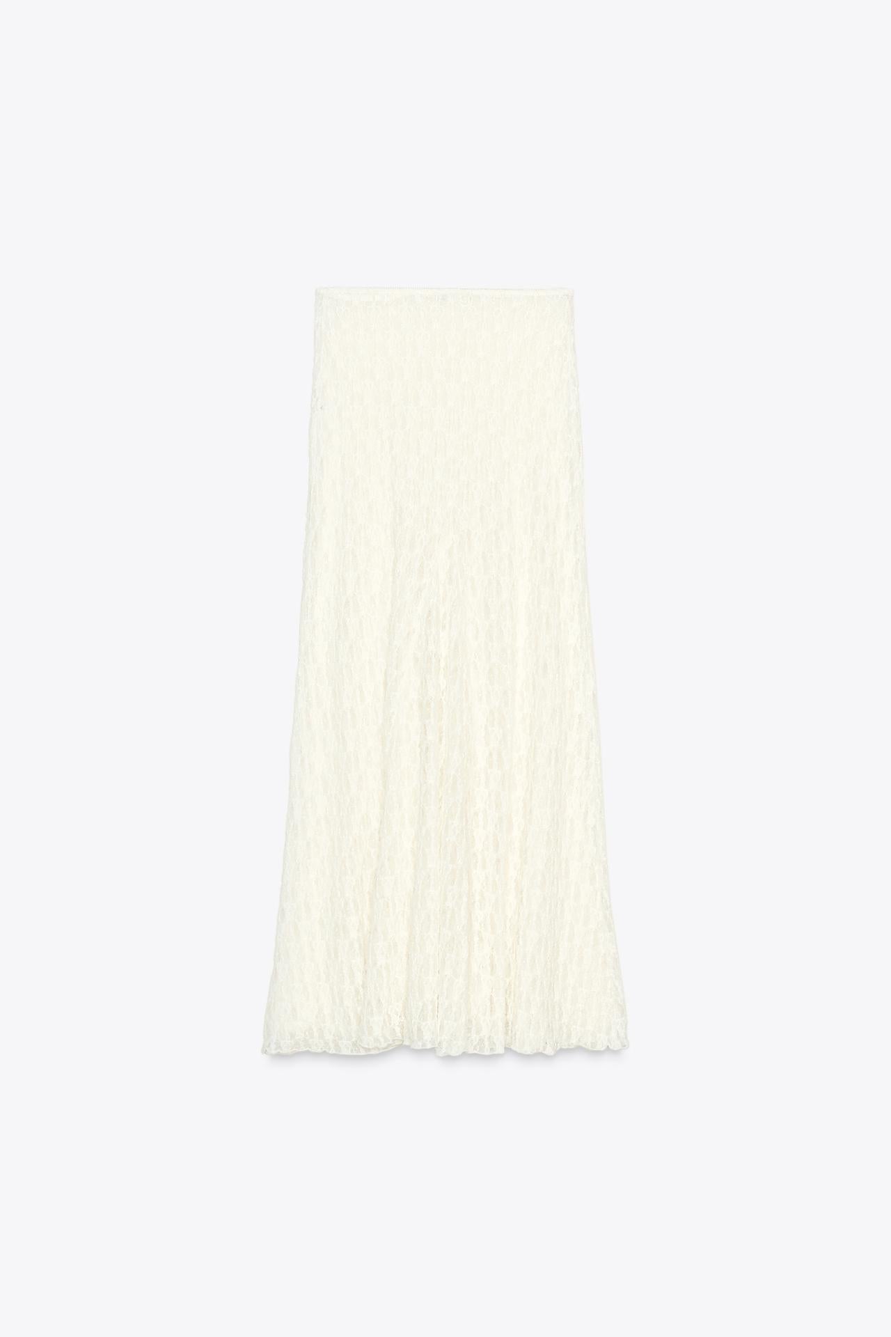 Semi-sheer, high-waist long skirt with an elastic waistband.
