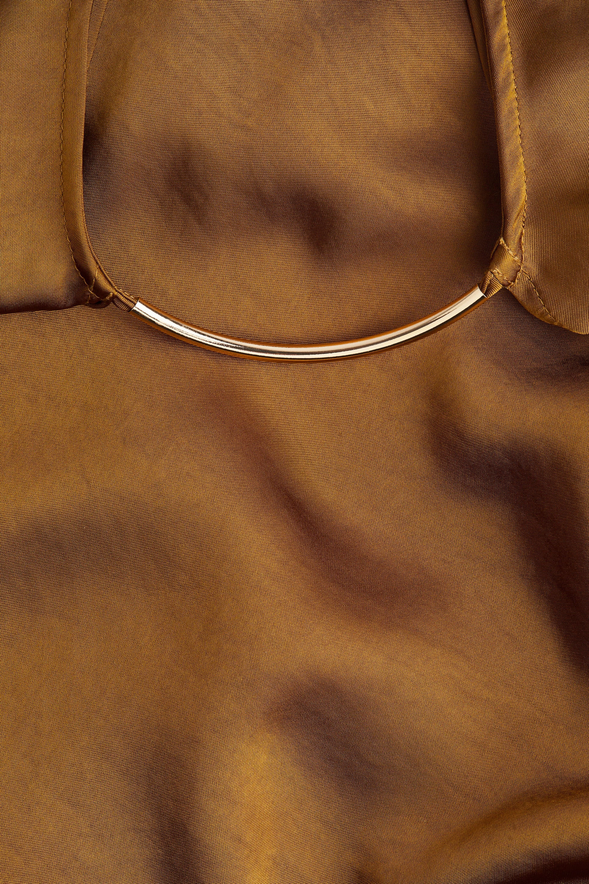 Long dress in softly draping satin featuring a deep, V-shaped opening at the front with a curved metal detail at the top resembling a necklace. Long batwing sleeves, a seam at the waist and a flared skirt with a diagonal seam for added volume. Concealed zip and hook-and-eye fastener at the back. Unlined.