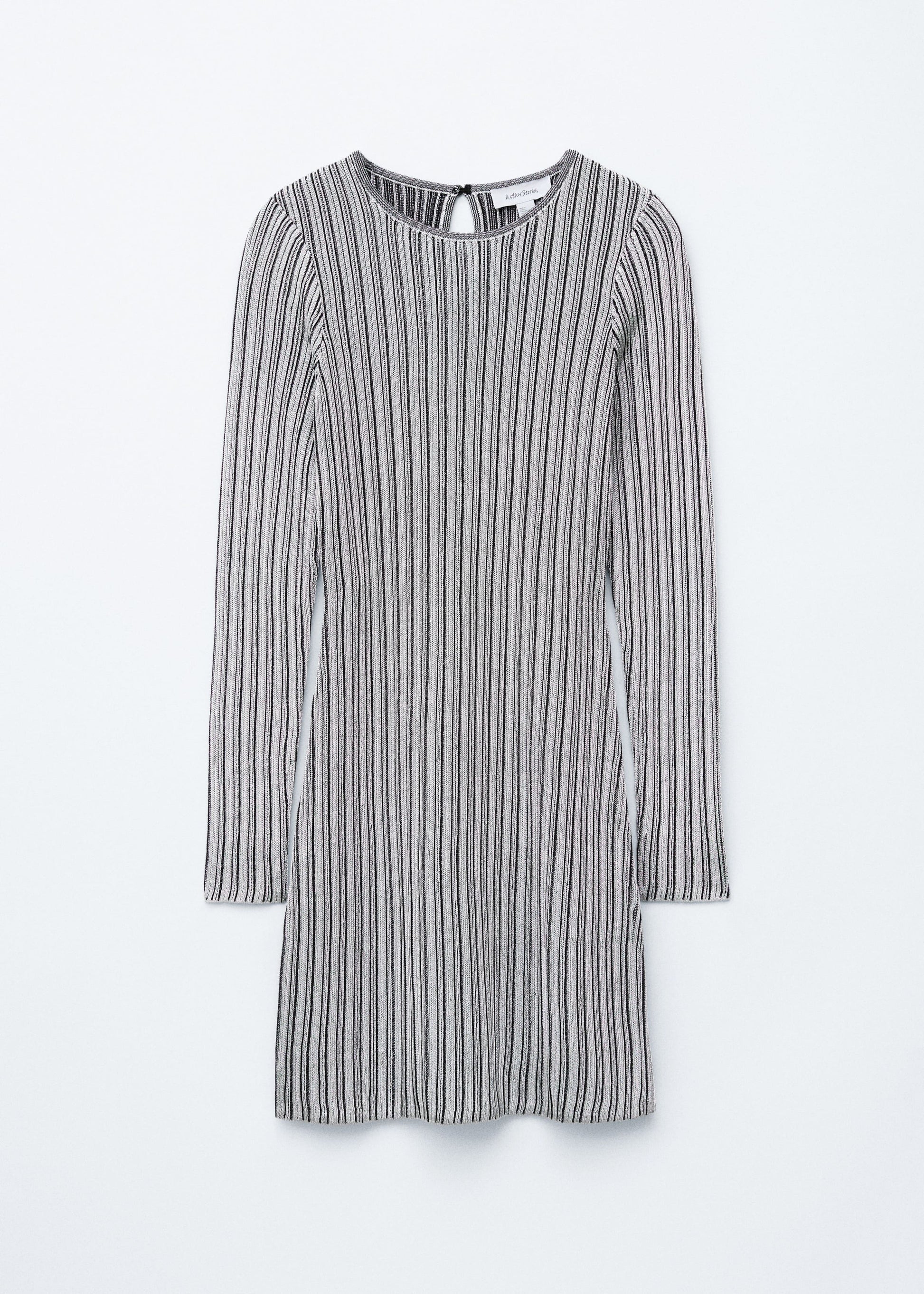 Crafted from rib-knit fabric woven with metallic fibers, this mini dress is cut in a fitted silhouette with a round neckline and long sleeves. Finished with a keyhole button closure at the neck.