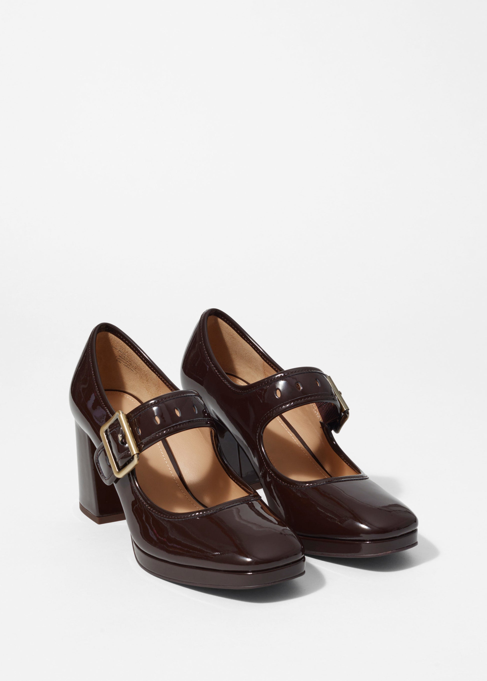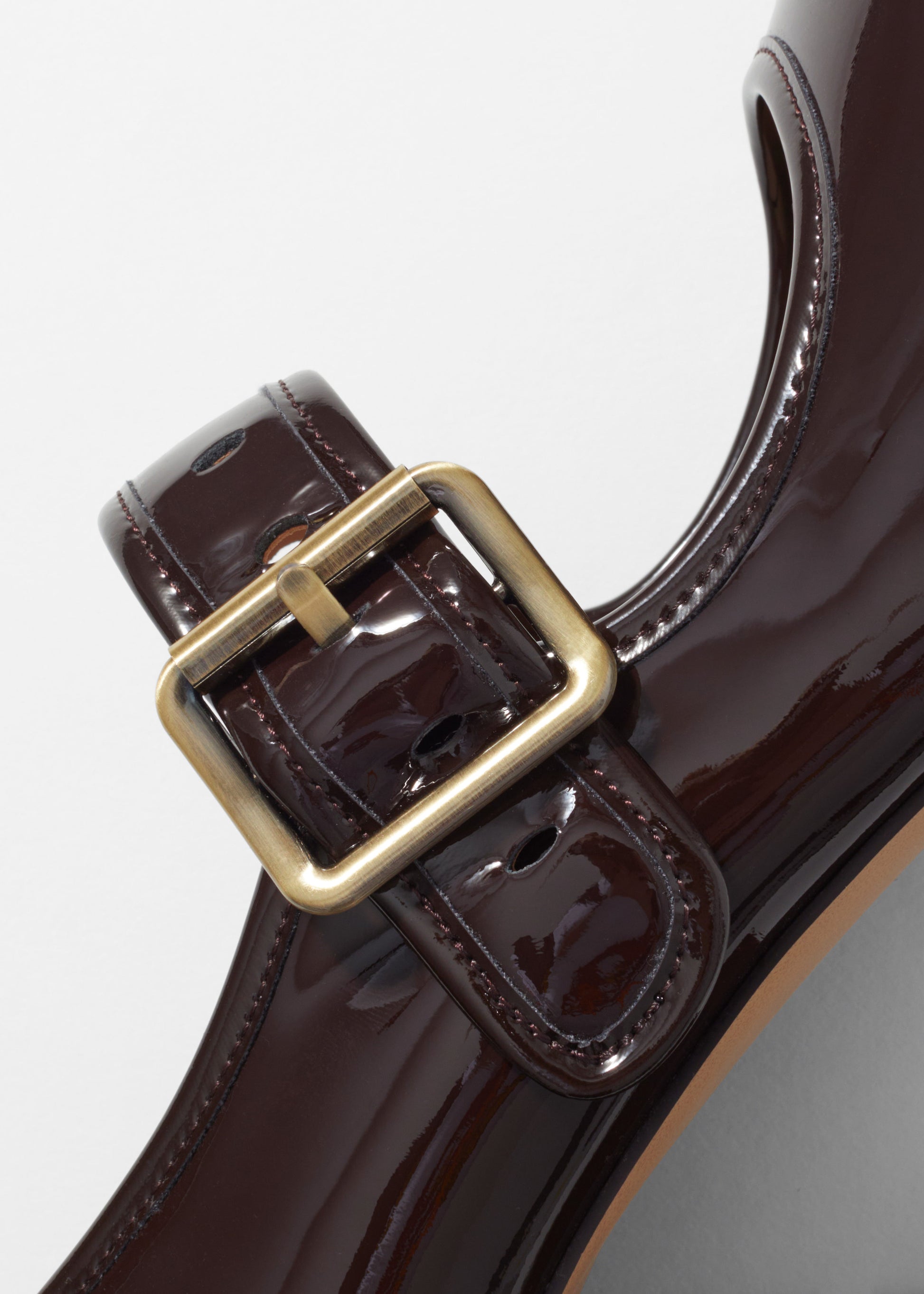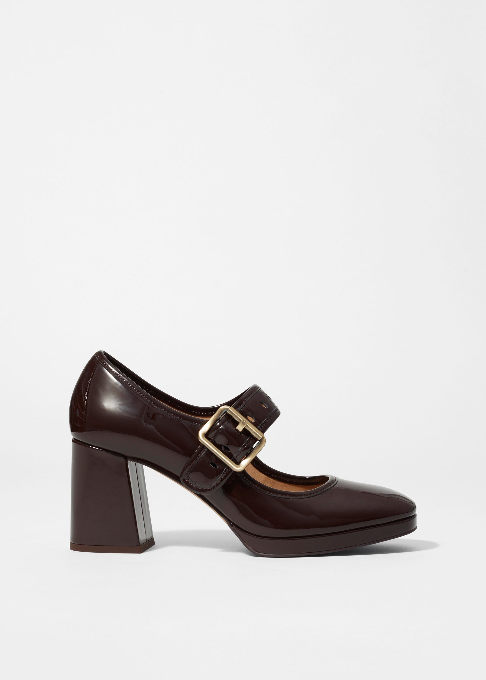 These Mary-Jane pumps are crafted from glossy patent leather and set on slightly flared block heels for added comfort. They feature deep, low-cut openings, chunky gold-tone buckles and sharply defined almond toes.