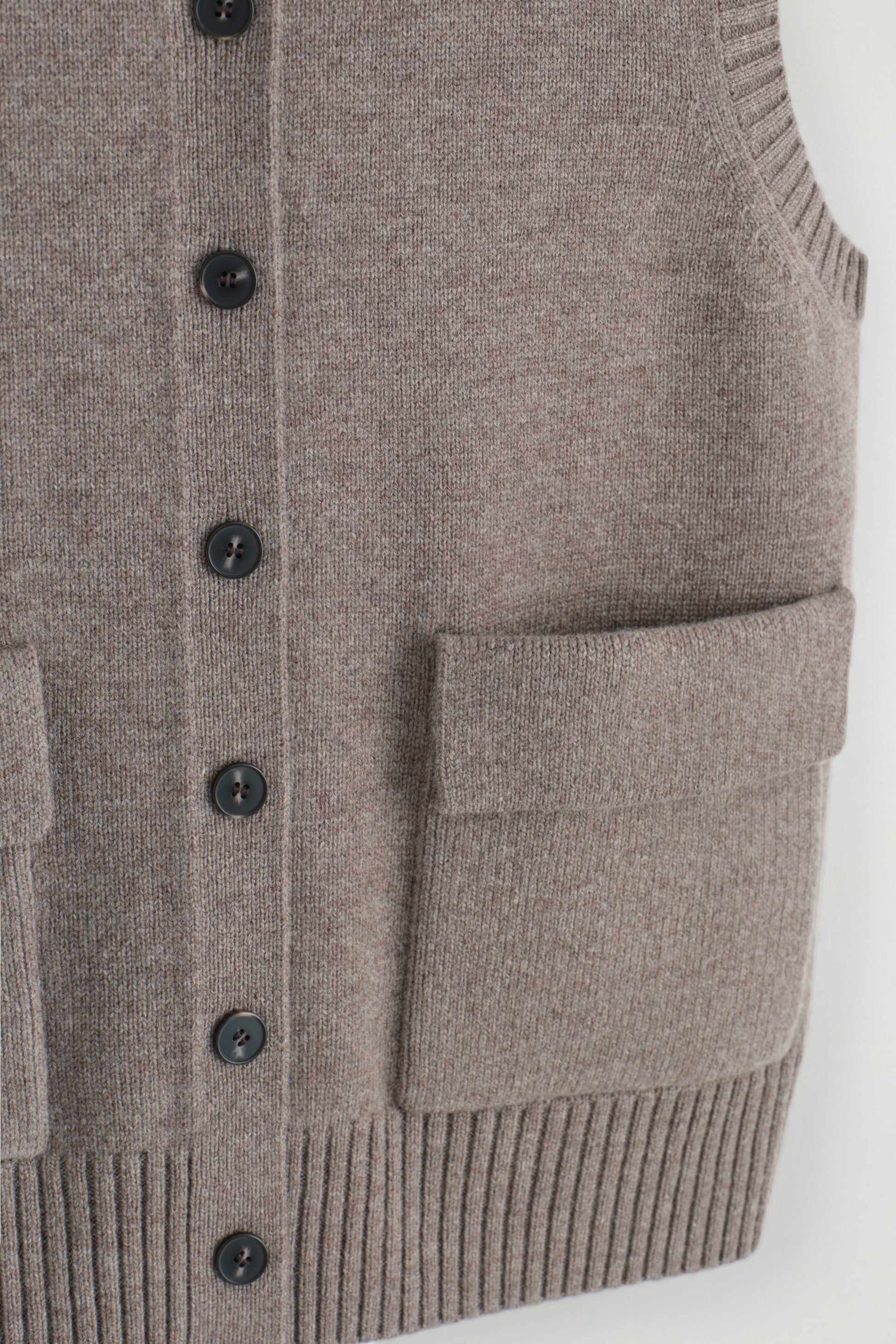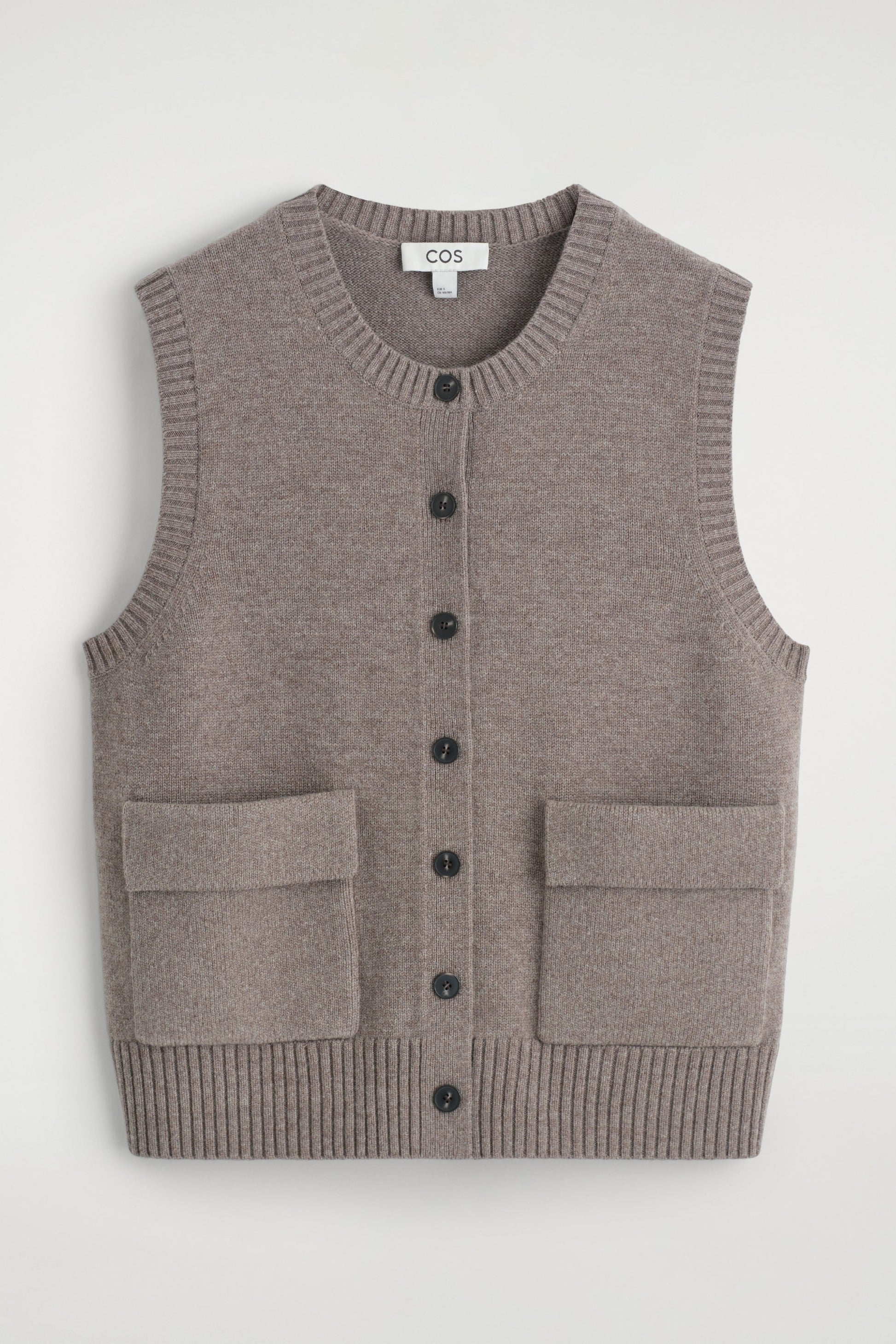 Rendered in a rich mole hue, this modern vest is crafted from merino wool that has been specially washed for a supremely soft hand feel. It features contrasting buttons, front pockets and a rounded neck that's ribbed for a more chunky look. Style it as a coord with the matching mini skirt.