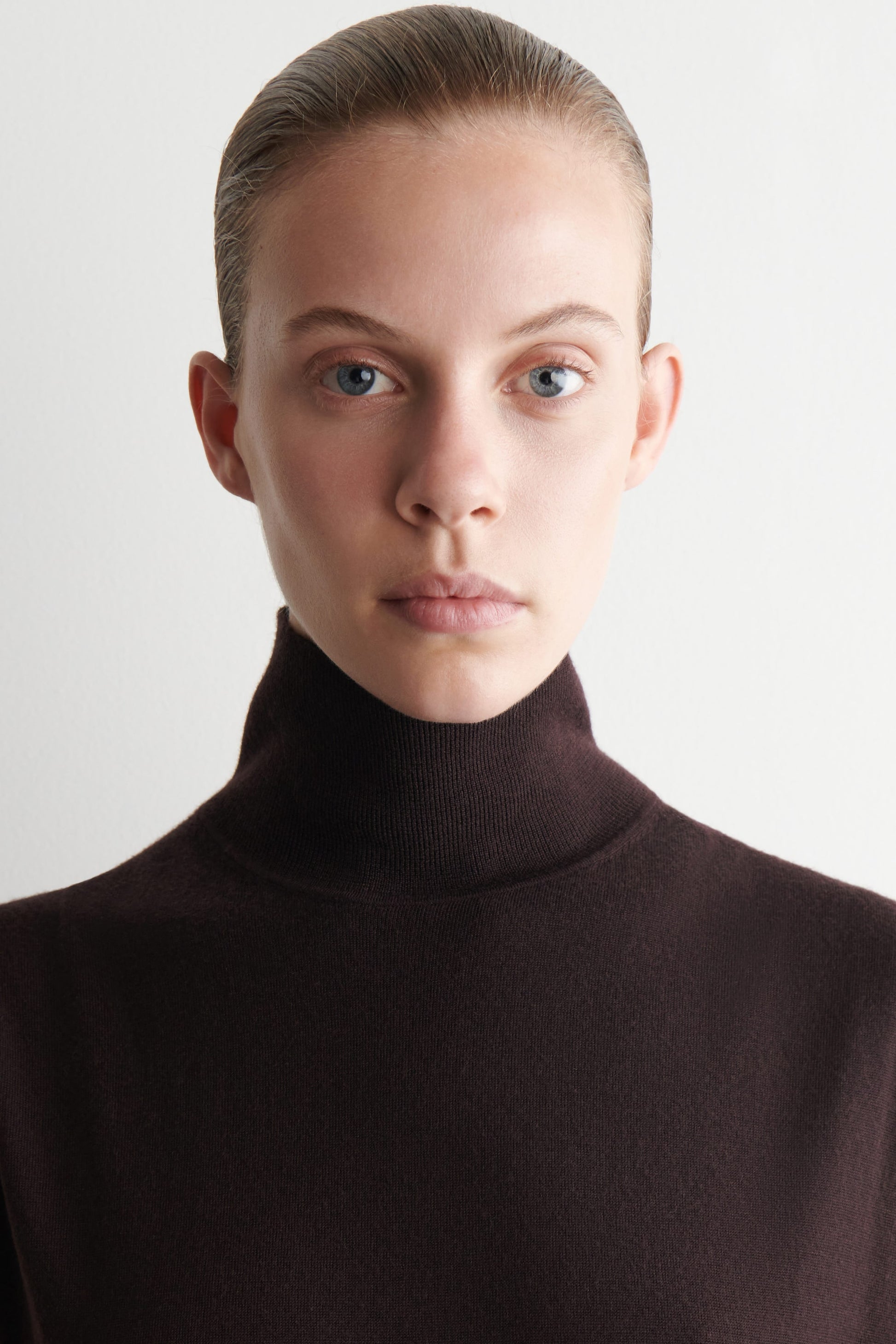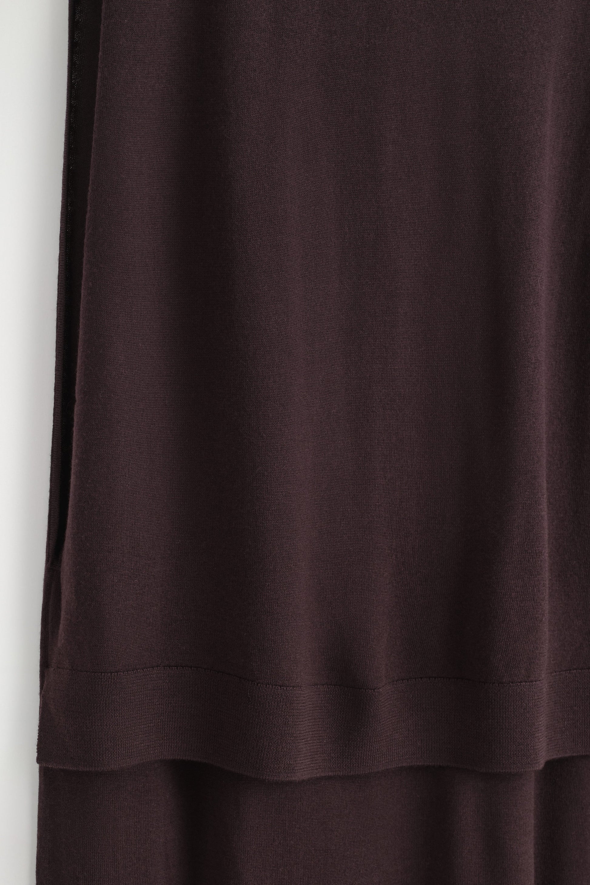 Autumn Winter 2025 takes the modern wardrobe to new heights: the epitome of quiet confidence. Underscored by a luxurious tactility, this refined sleeveless dress is crafted from exceptionally soft merino wool, hand-selected for its superior, featherlight feel. It's rendered in a rich plum hue and designed with a ribbed high neck, low armholes for effortless layering and a knitted hanger loop – a hallmark of the collection.