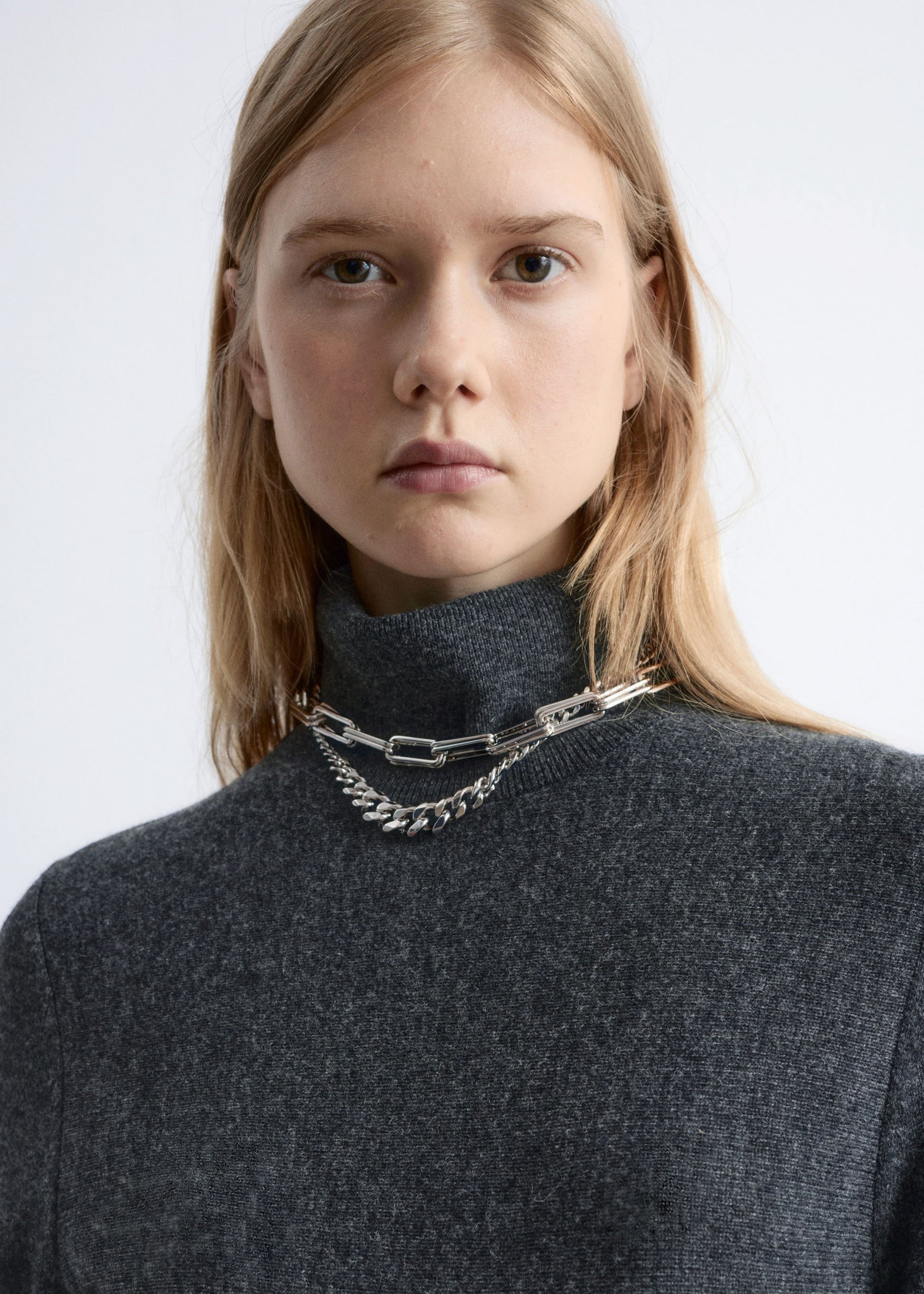 This maxi dress is knitted from 100% merino wool. It features a folded turtleneck and a fitted silhouette that flares into an A-line skirt, accented by a rib-detailed hem.