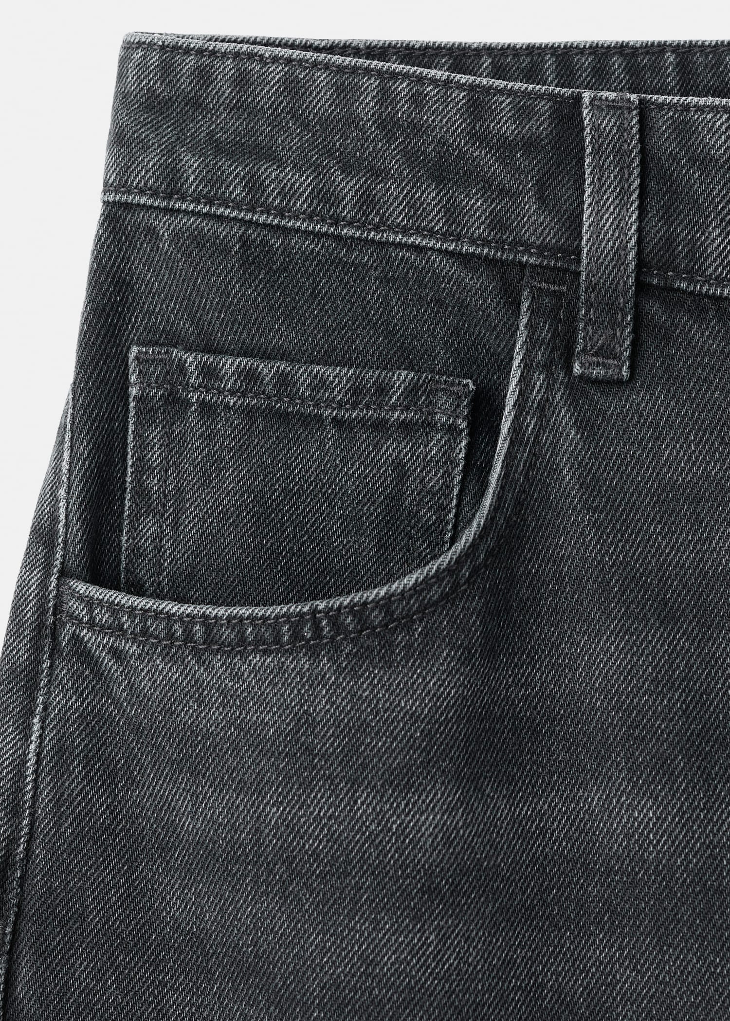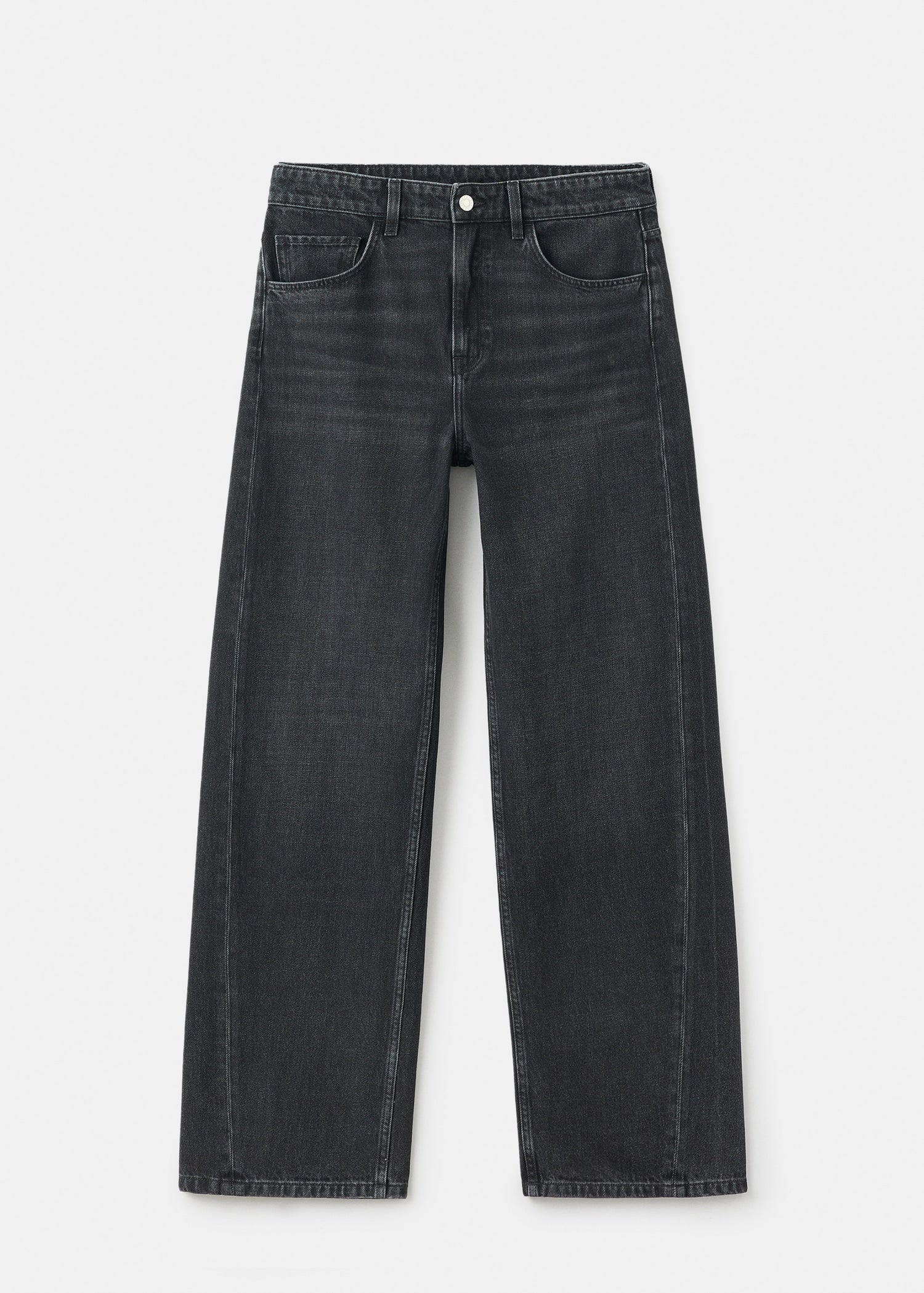 Denim-style cotton fabric. Long Design. Balloon design. Mid-rise. Belt loops. Five pockets. Button and zip fastening. Inside length 79 cm.