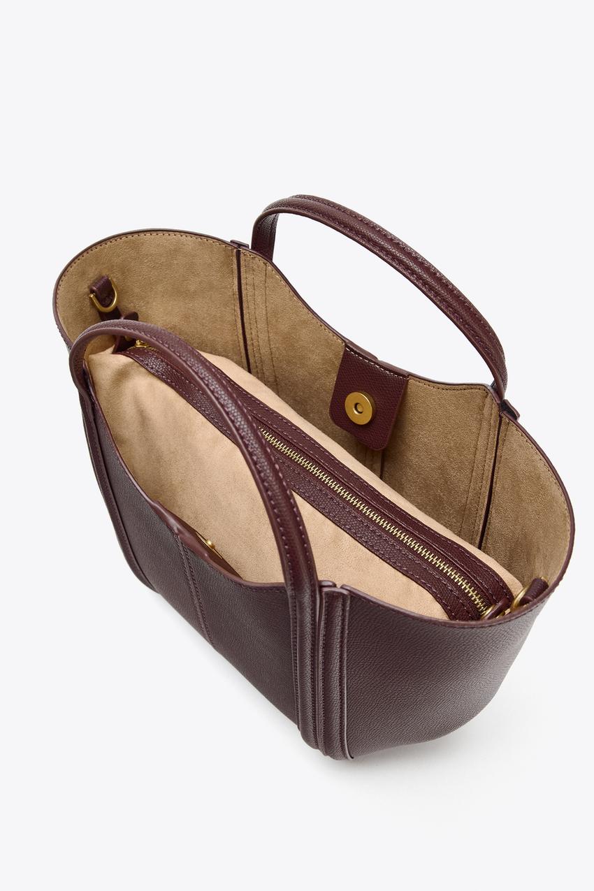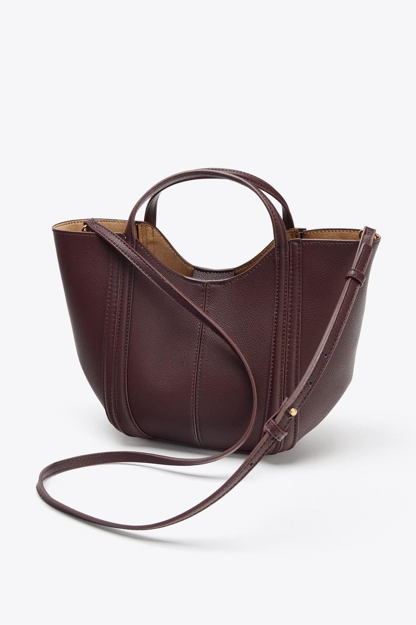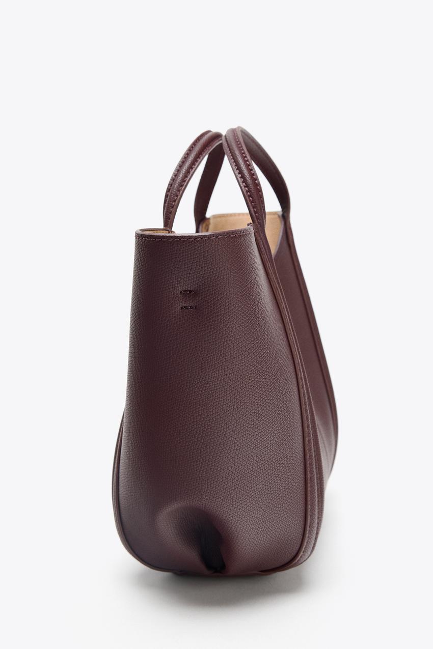 Mini city bag with contrast topstitching detail. Top handle and detachable crossbody strap. Detachable inner pouch with zip closure.