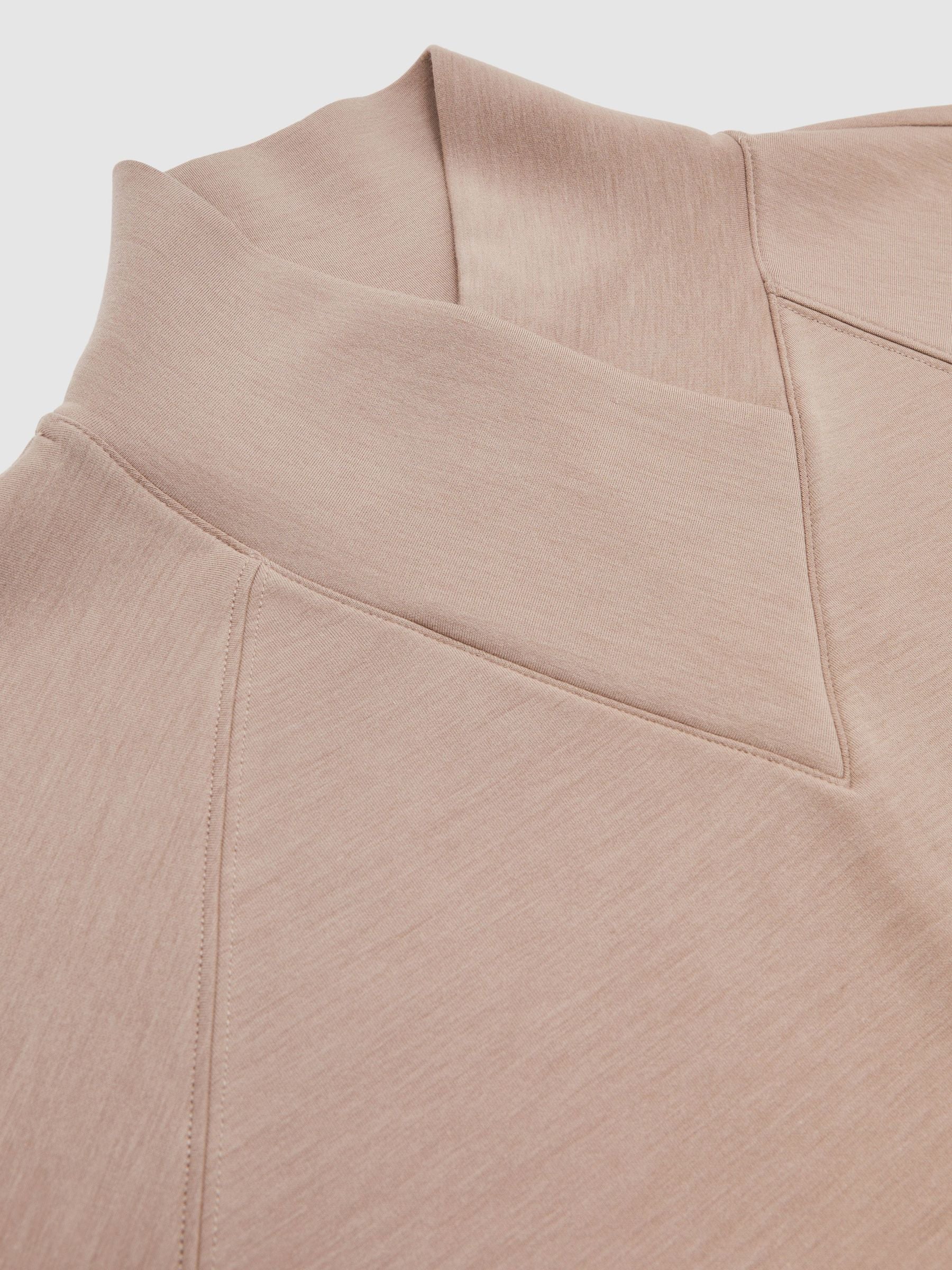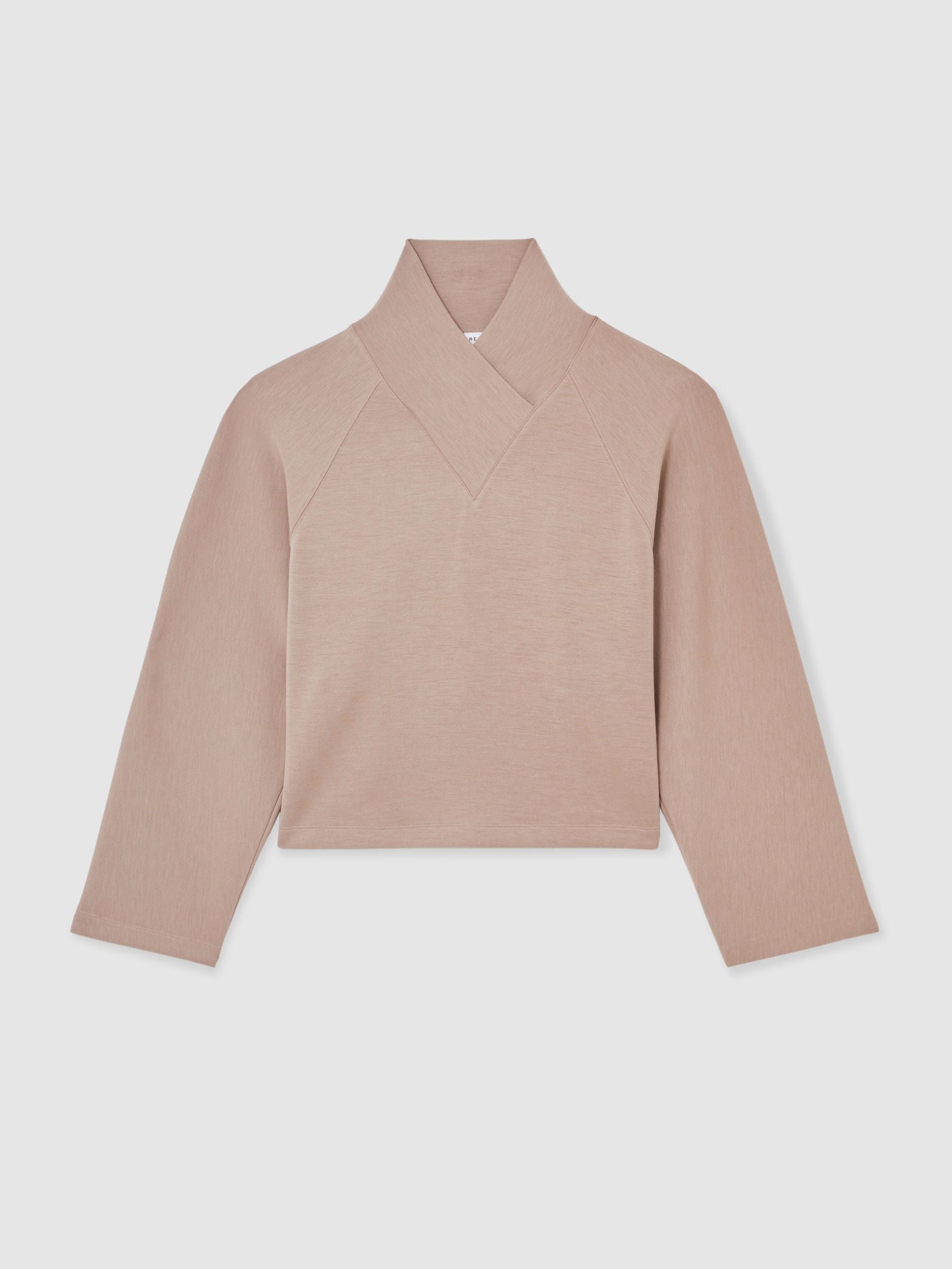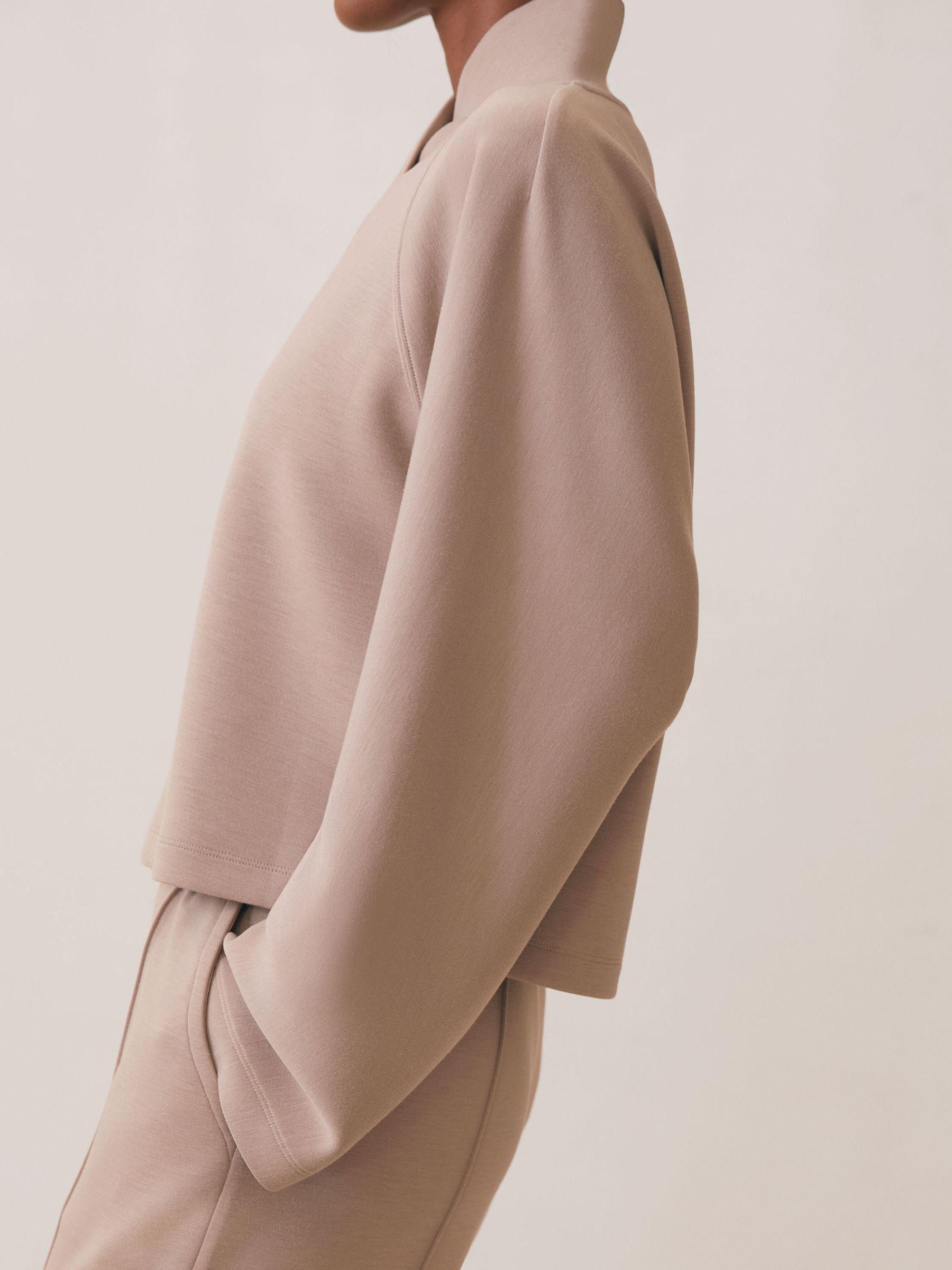 The Nova sweatshirt is crafted from a Taupe Neutral silky-soft modal-blend interlock jersey, offering a smooth and elevated feel. Designed with a relaxed silhouette, this piece features a high shawl neckline, long raglan sleeves, and subtle seam detailing for a sophisticated yet comfortable fit.