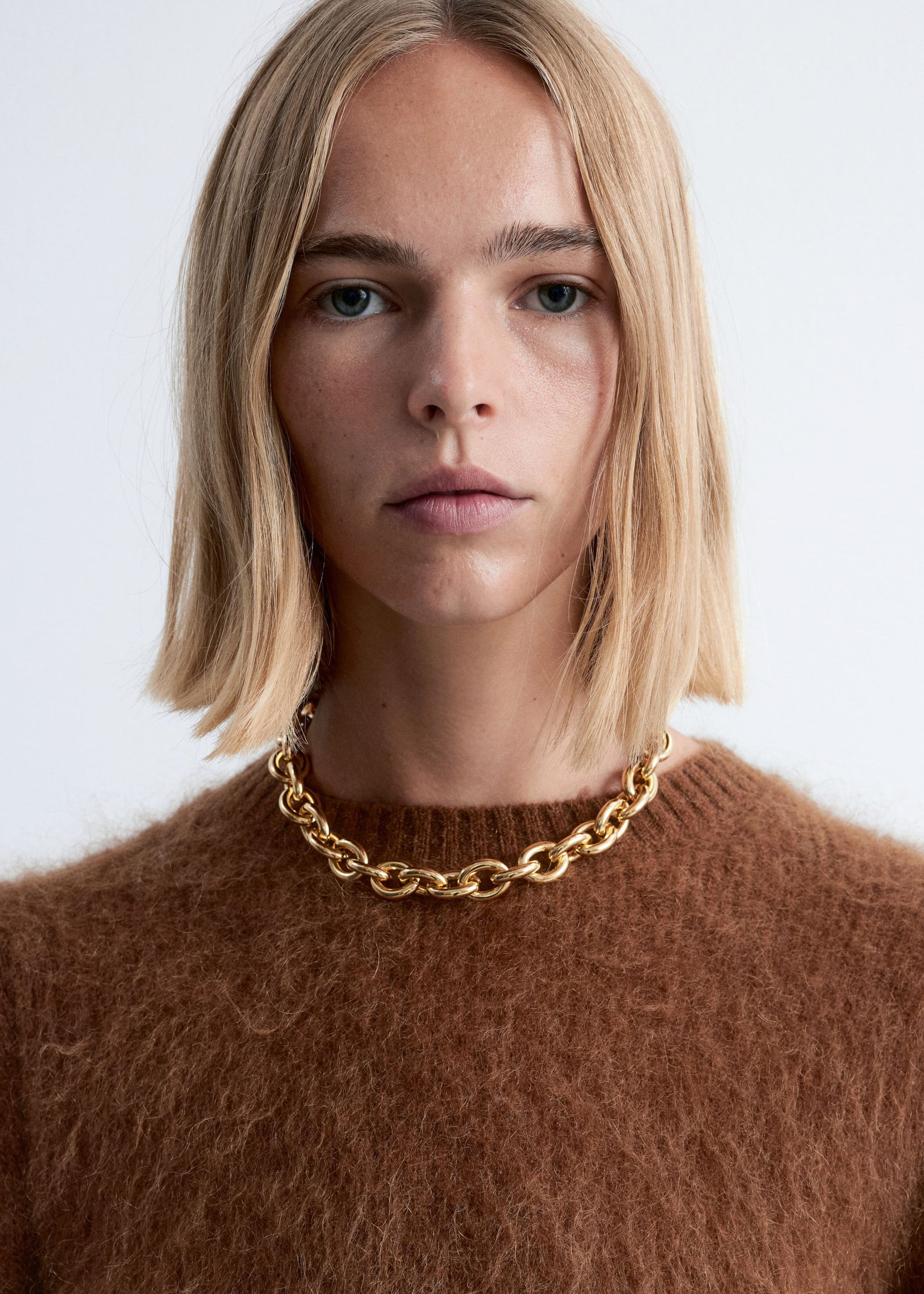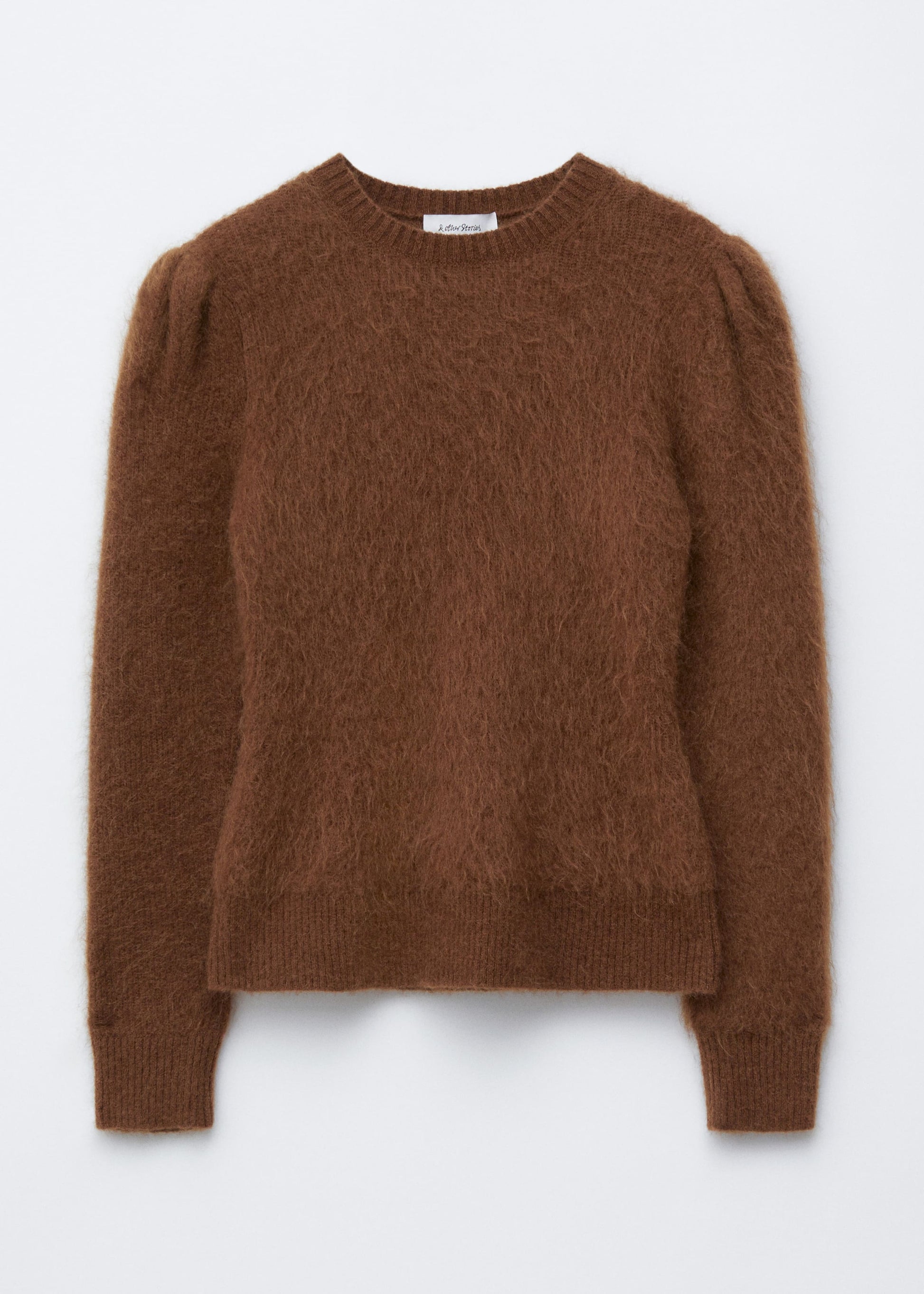 Knitted jumper made from a mohair and wool blend with a brushed finish. Featuring long puff sleeves and a ribbed neckline, cuffs and hemline.