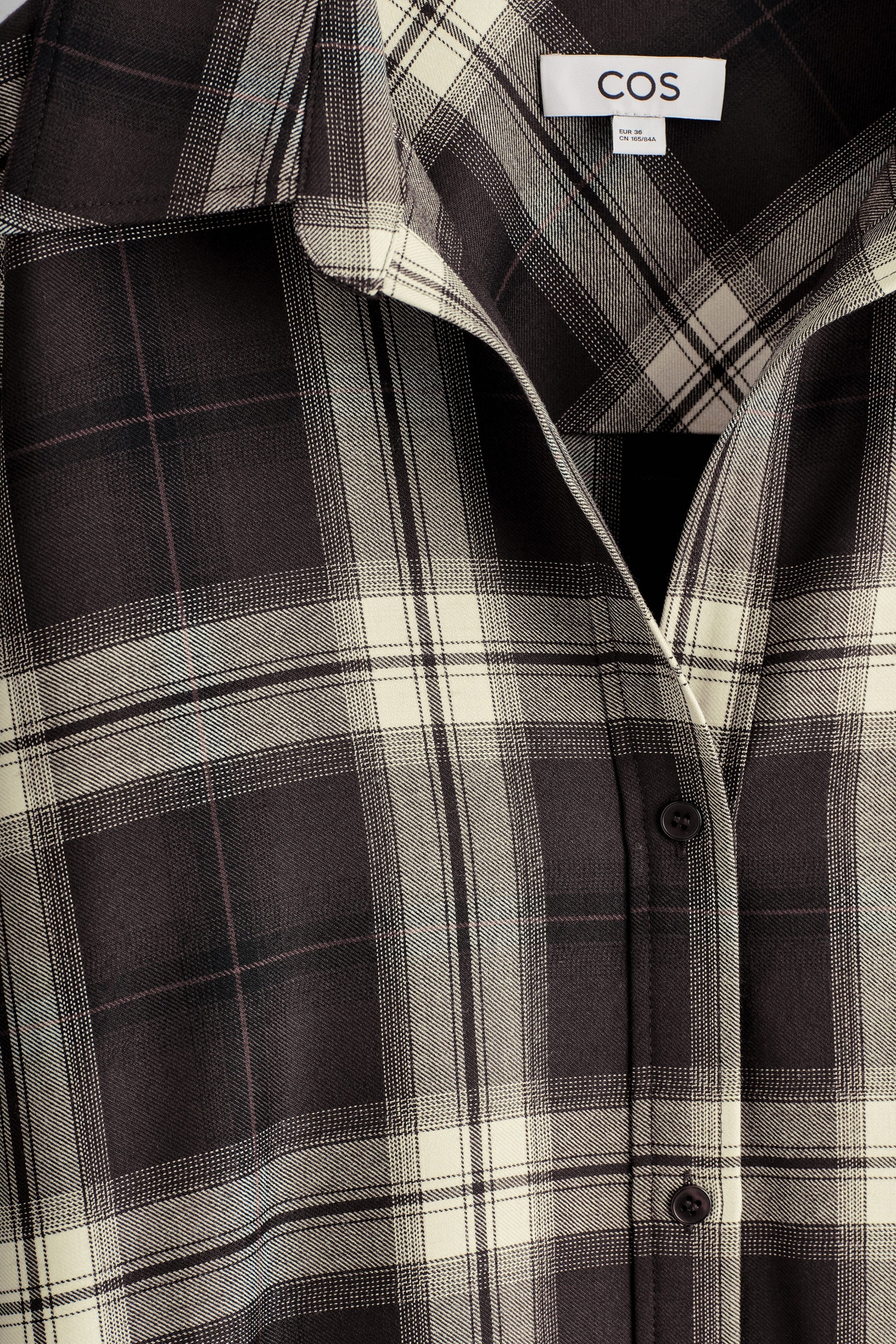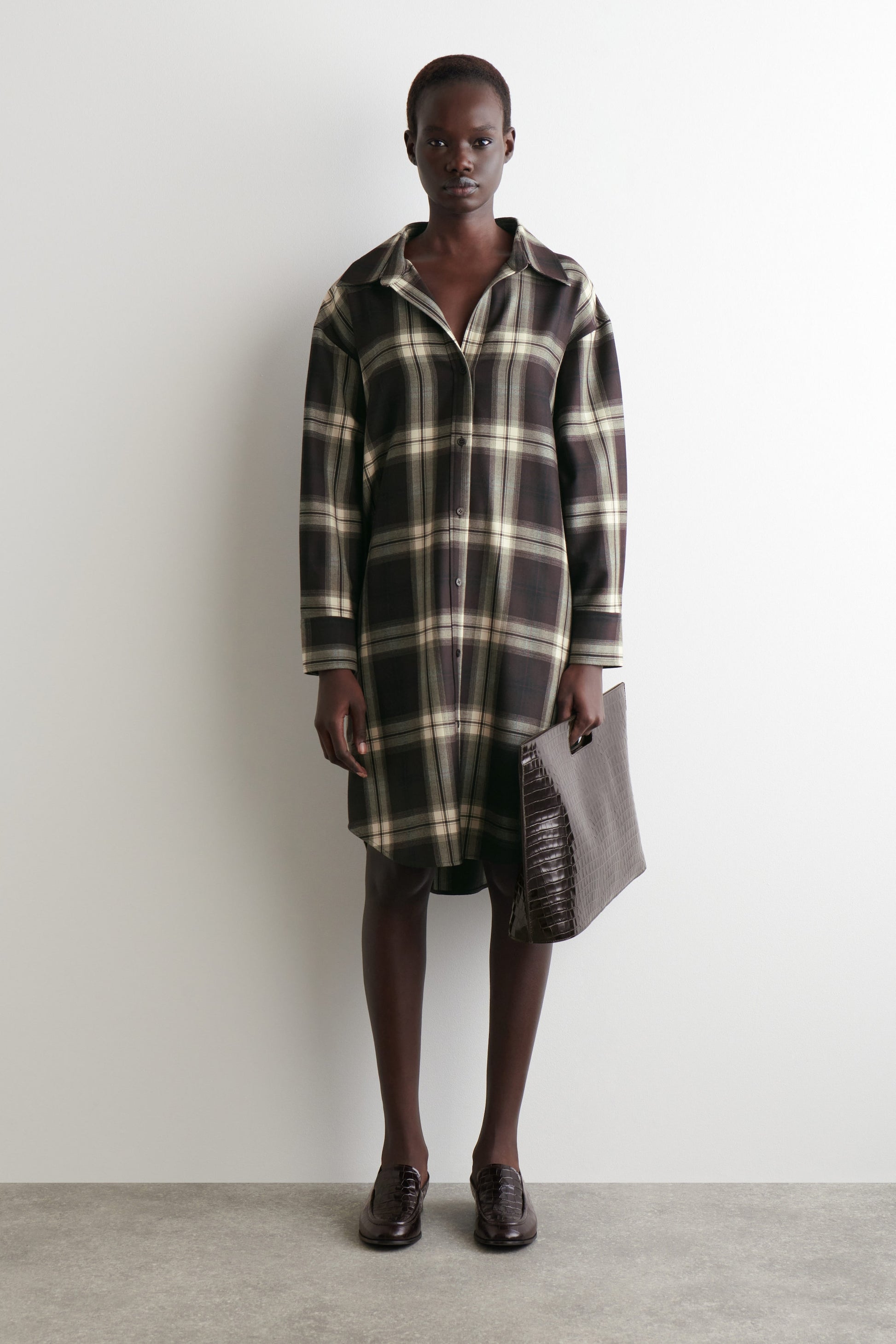 Undone silhouettes bring a relaxed appeal to the classic shirt dress. Crafted from a soft wool blend, this piece has a modern open collar that slouches back towards the shoulders for an effortless look. The refined checks offer a fresh take on heritage design codes.