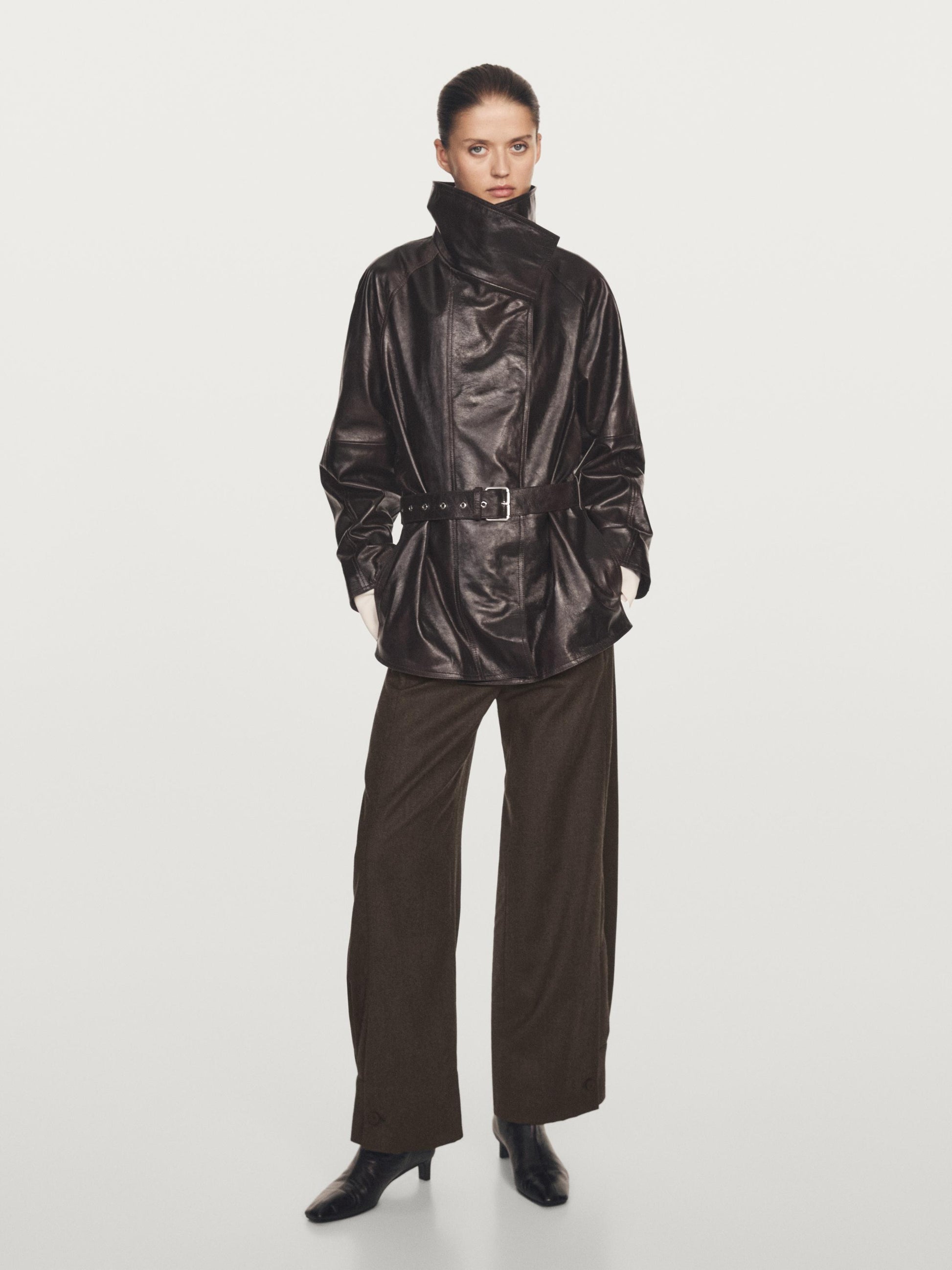 Sheepskin leather jacket with nappa finish. Buttoned high collar. Raglan sleeve. Cross-over fastening with concealed snap buttons. Lined. Includes belt.