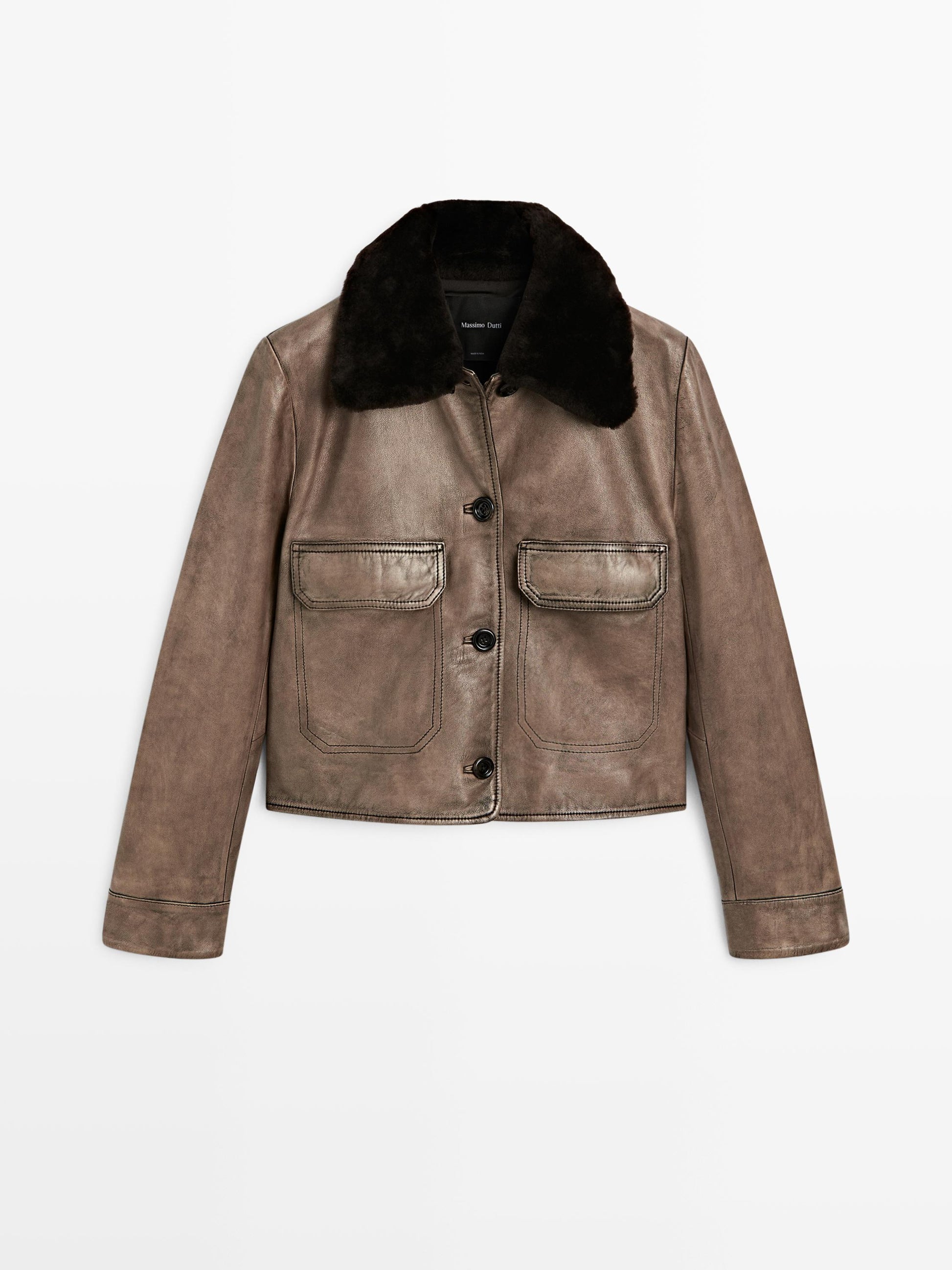 Sheepskin leather jacket with nappa finish. Long sleeves with buttoned cuffs. Shirt collar. Button-up front. Detachable leather collar with fur. Two flap pockets. Lined. Worn effect.