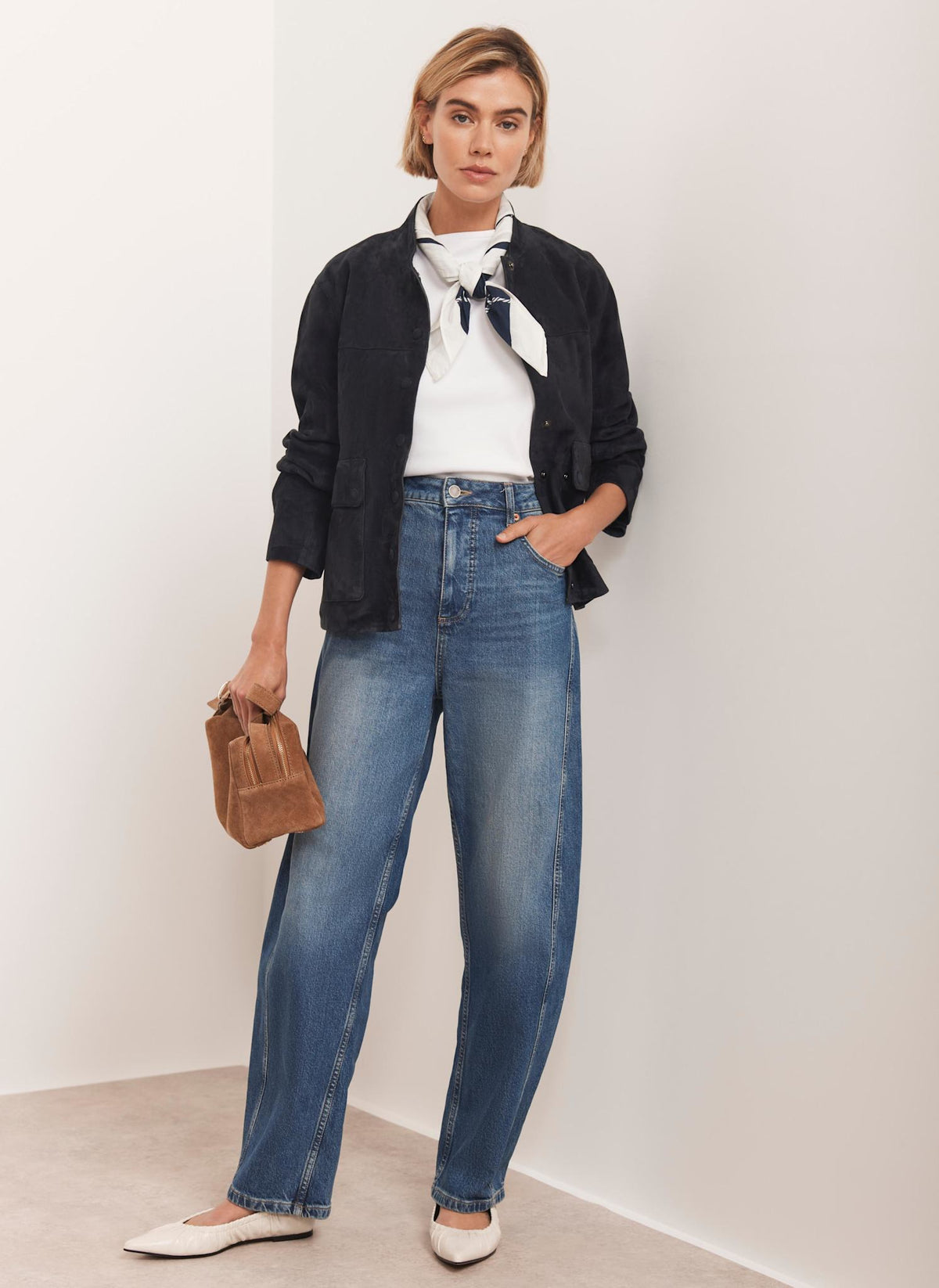 - Navy tone suede jacket with a high collar, long sleeves, zip up cuffs, flap pockets with popper fastenings through the front.