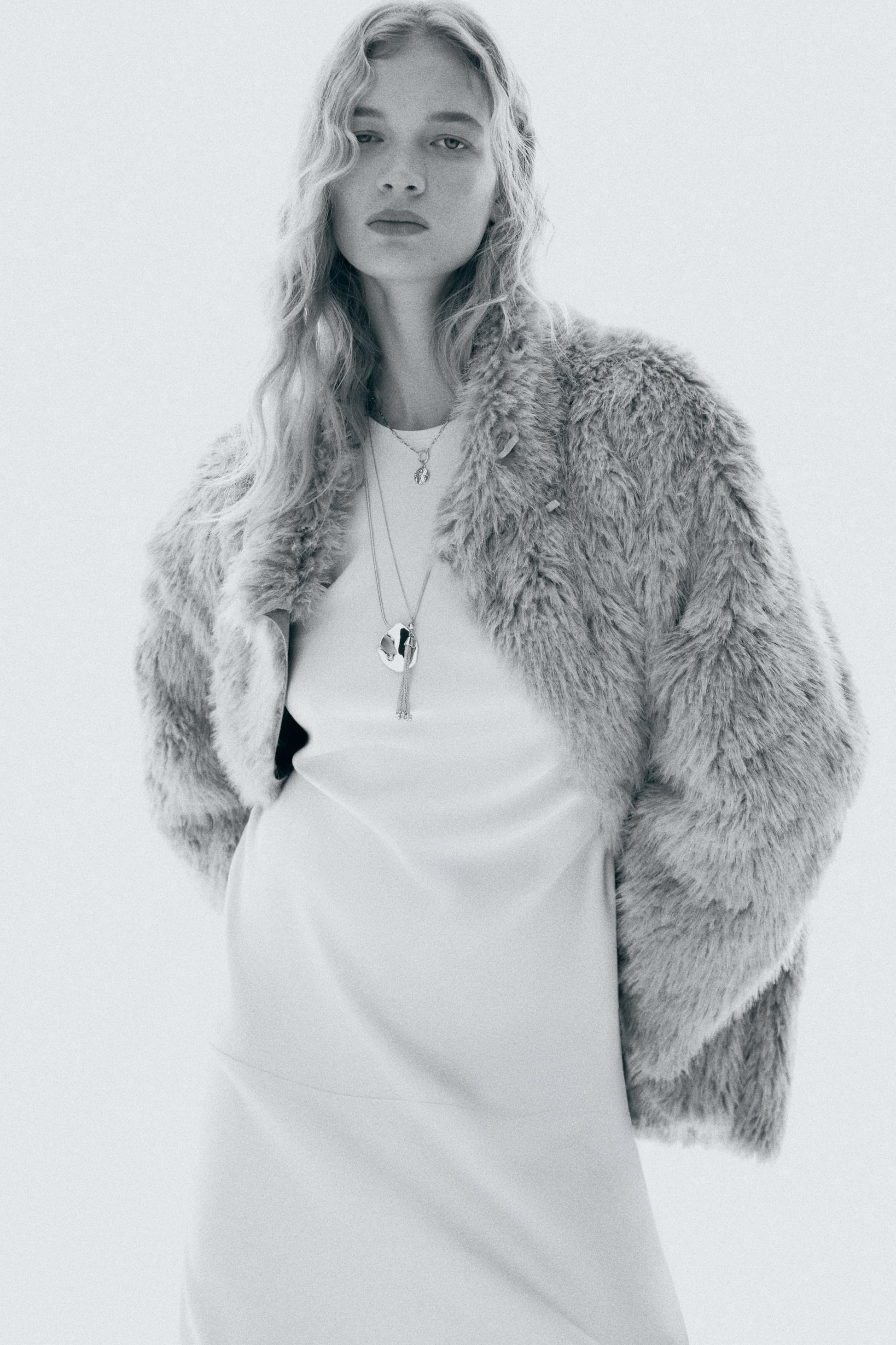 Long, fitted dress in woven fabric with a slight sheen. Features a round neckline with concealed fastening at the back of the neck, an open back with long ties at the waist, and a gently flared skirt. Unlined.