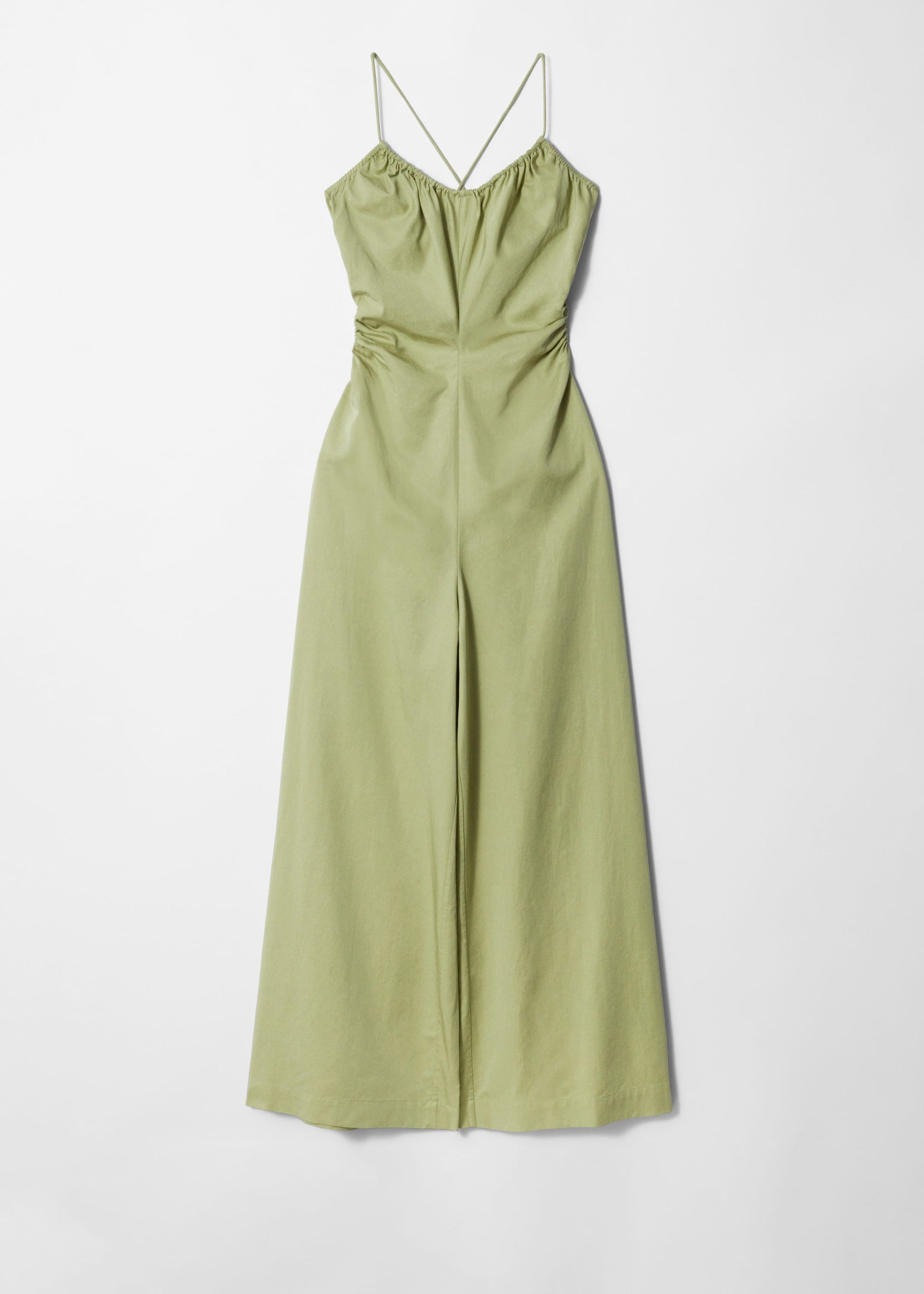 This modern jumpsuit is crafted from a lightweight, crisp cotton-blend. Designed with an open neckline with elastic drawstring that creates subtle ruching along the bodice. The fitted waist flows into long, wide legs for a flattering silhouette. Delicate shoulder straps cross over an open cut-out back, secured with thin tie-closures. The perfect throw-on-and-go piece for sun-soaked days.