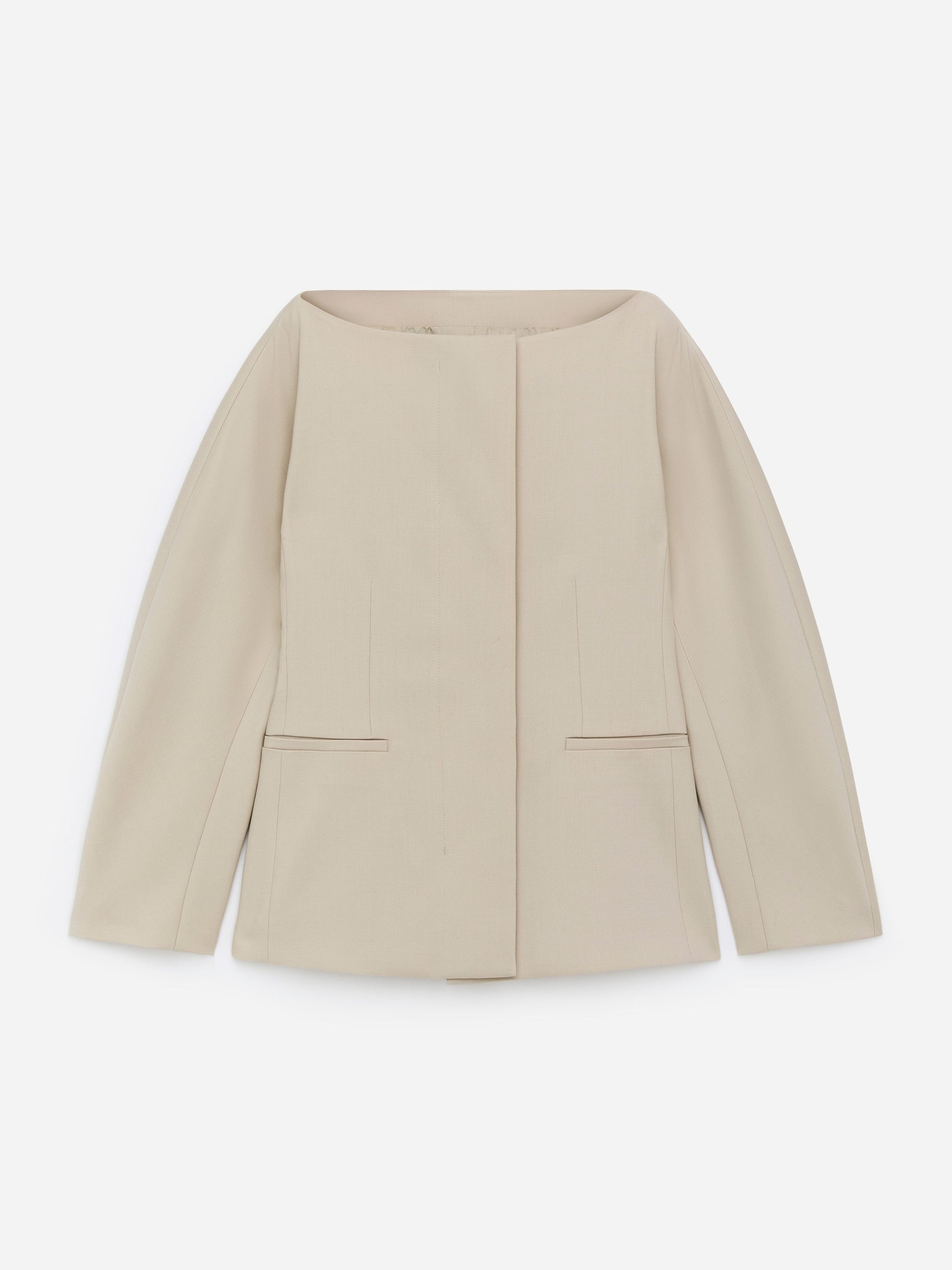 Open-neck blazer with hidden button fastening and welt pockets. A lined style with a fitted silhouette. The style contains 43% RWS wool (TE-00047206). Products certified to the Responsible Wool Standard (RWS) contain wool fiber from farms independently certified to animal welfare and land management requirements.